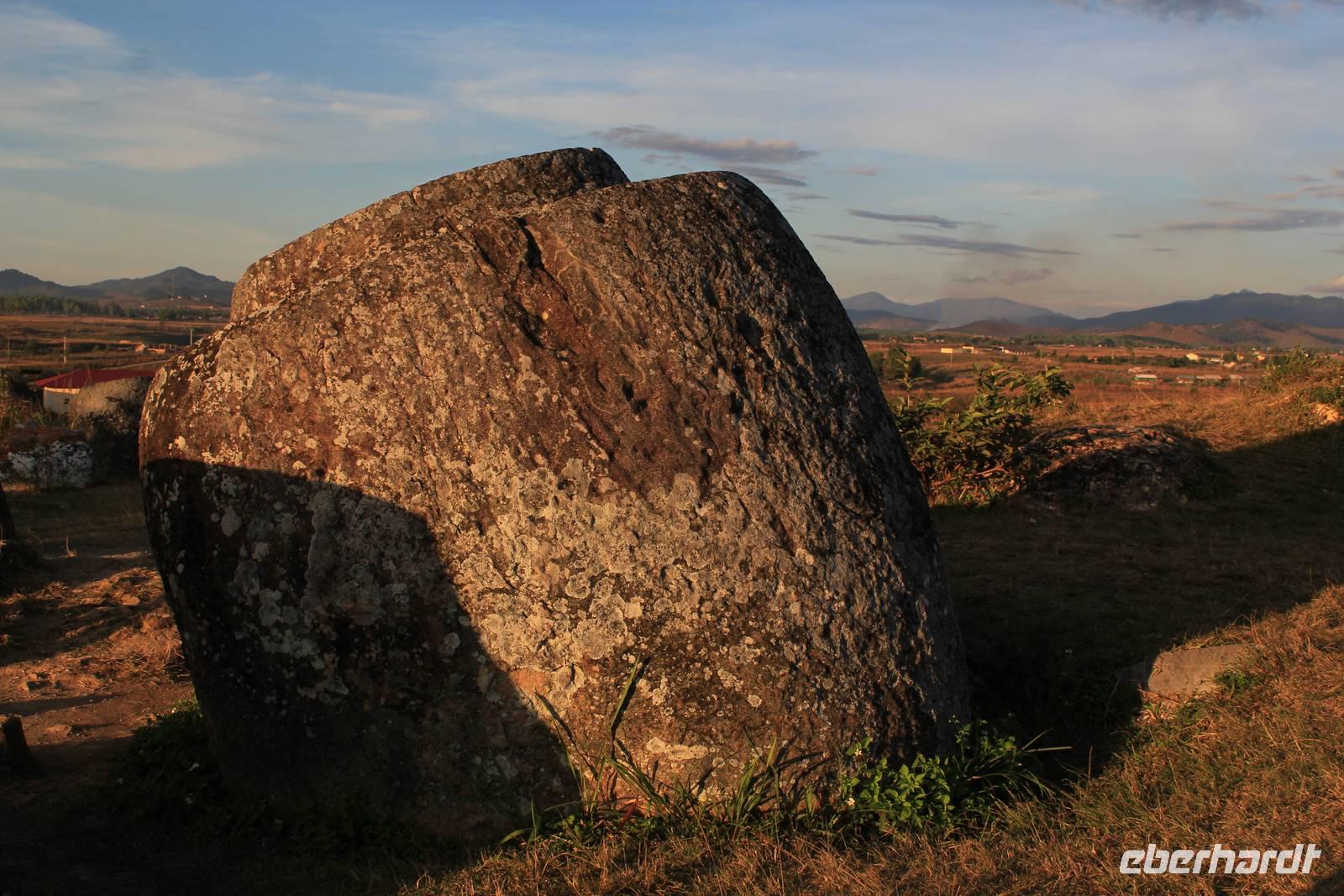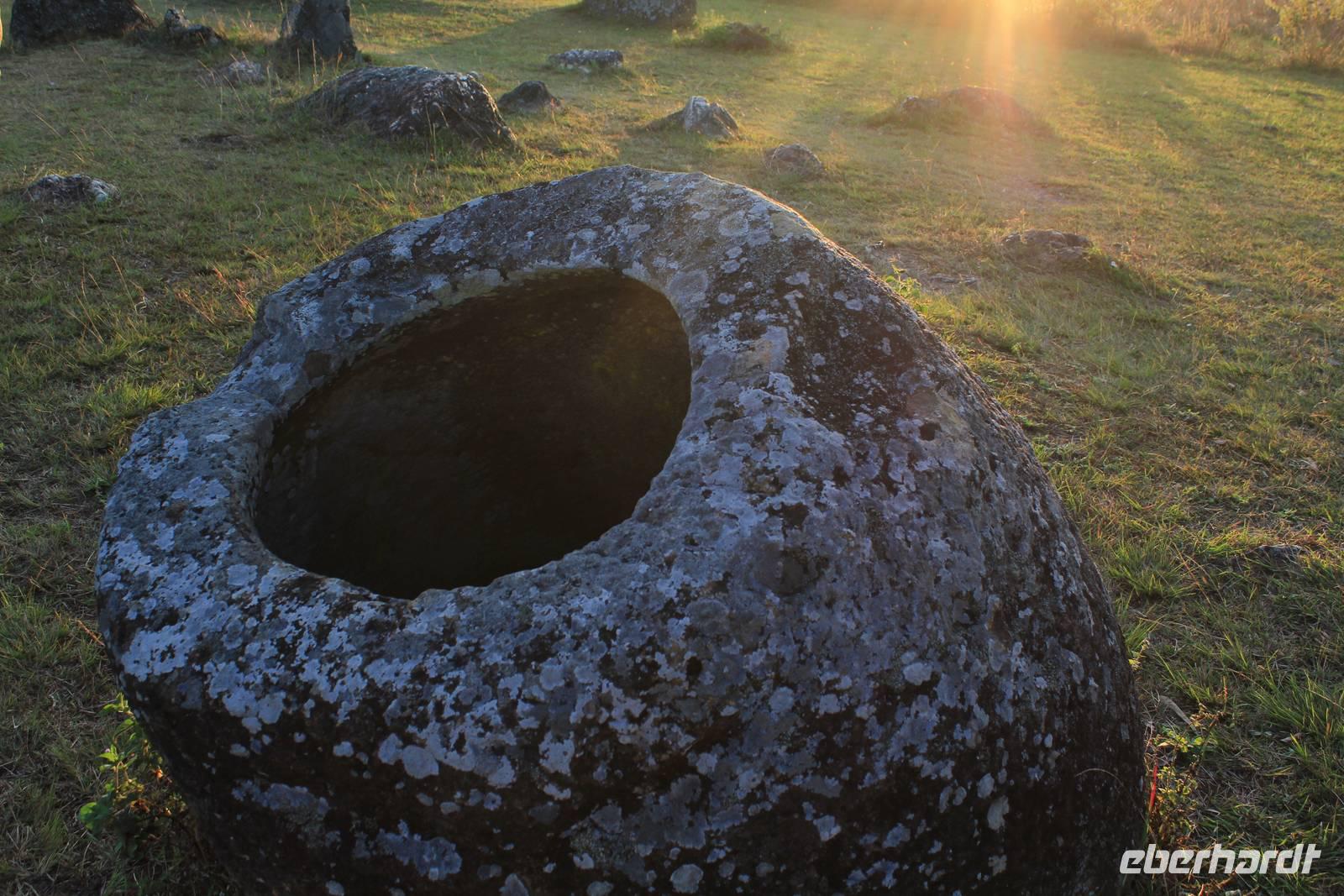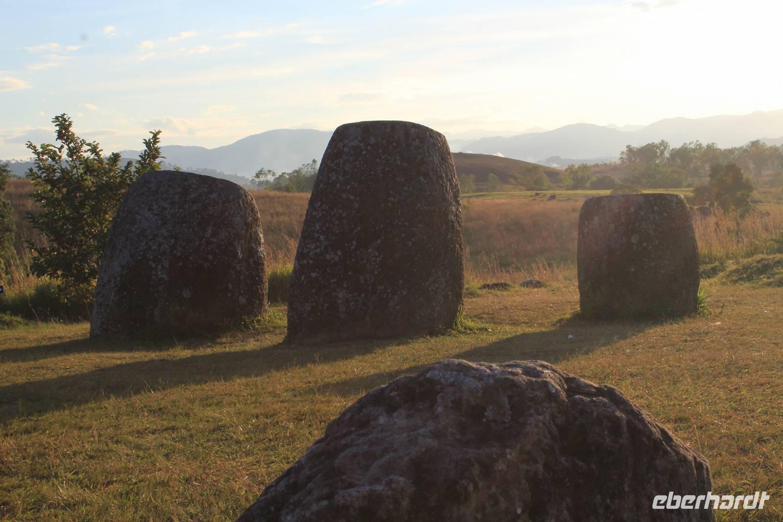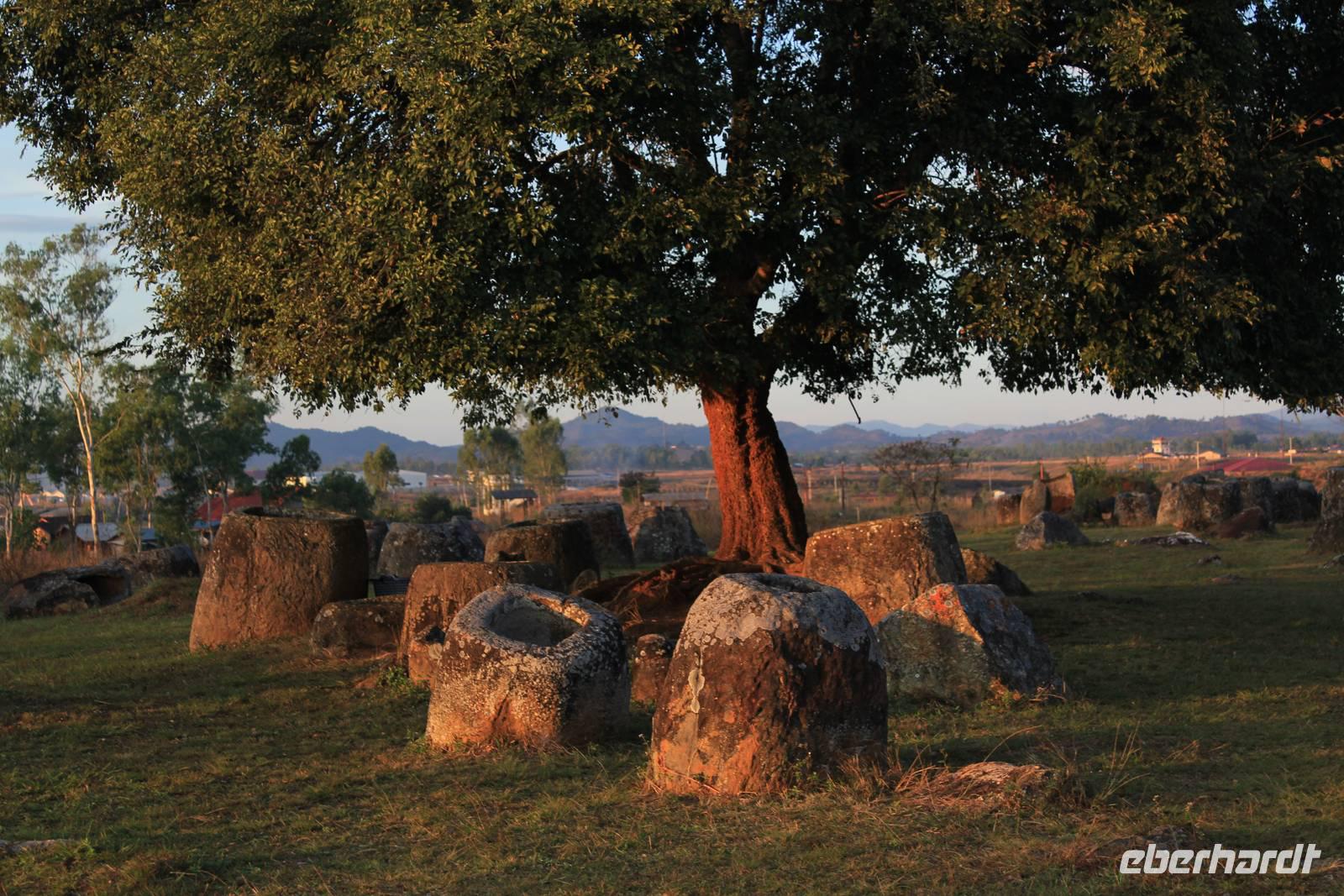 Pünktlich, als die Sonne sich gerade daran macht die Landschaft in ein warmes Abendrot zu tauchen, erreichen wir die berühmte Ebene der Tonkrüge auf der Hochebene Thang Hay in der Provinz Xieng Khuang. Bis 1973 wurde hier fast jede Stadt der Provinz durch Bombardierungen während des Indochina-Krieges zerstört. Rund 2 Tonnen Munition kamen auf einen Einwohner und bis heute sind einige Gebiete in der Umgebung noch nicht entmint.
