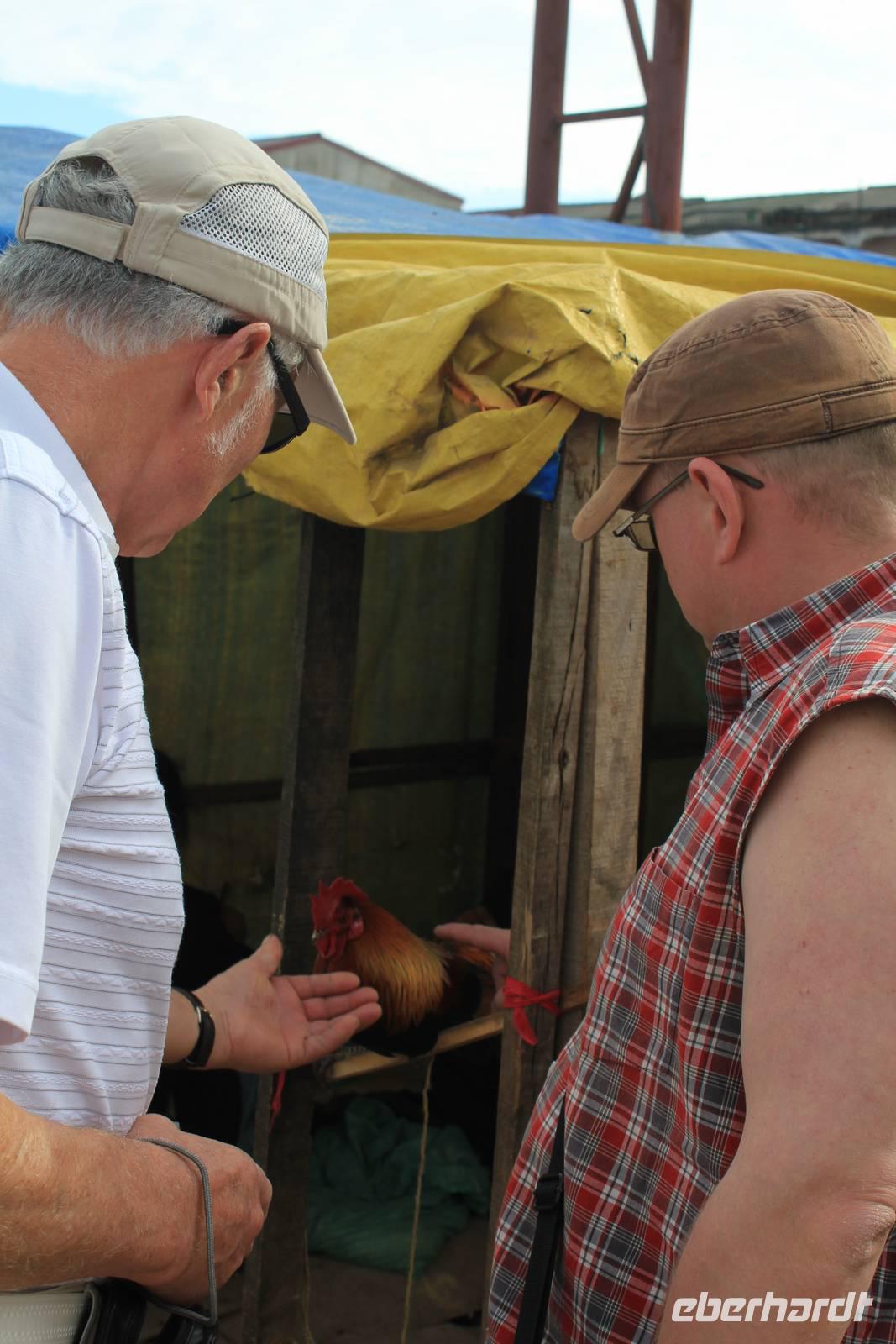 Unser erstes Ziel ist heute der lokale Obst-, Gemüse, Fisch- und Fleischmarkt von Phonesavan. Yang führt uns durch das bunte Treiben, wobei wir auf so einige unbekannte, erschreckende, leckere und faszinierende Dinge stoßen: neben lebenden Hühnern und Schweinen, die in enge Bambuskörbe geschnallt sind, gegrillten Ratten, nackten Vogelküken und blutigen Fleischstücken, steht aber auch exotisches Gemüse und Obst zum Verkauf. Bananenblüten, grüne Kürbisse, Papaya und vieles mehr! Die einen zupfen ihre Kräuter, sortieren ihre Glasnudeln und schnabulieren nebenbei ein wenig Klebereis, während andere eben Vögelchen rupfen, sich massieren oder auch die Haare schneiden lassen! Mittendrin statt nur dabei ist hier die Devise! Elisa und Yang kaufen gleich einige interessante Köstlichkeiten ein, die unserem heutigen Mittagessen dienen sollen.