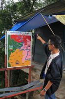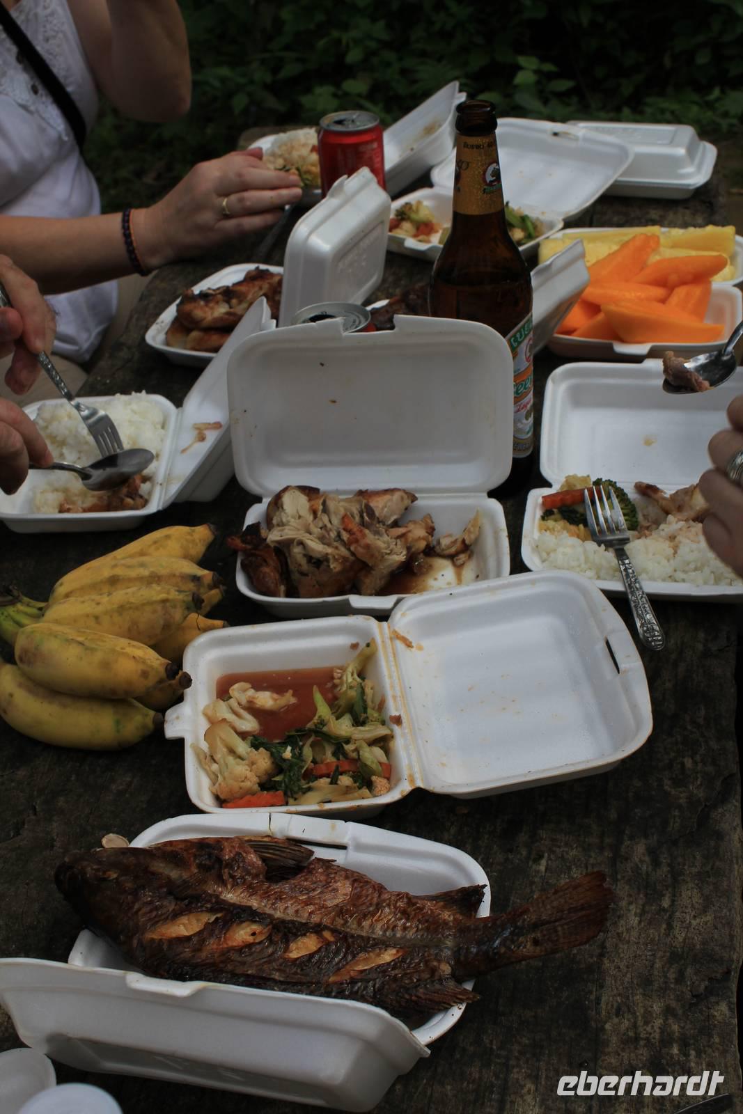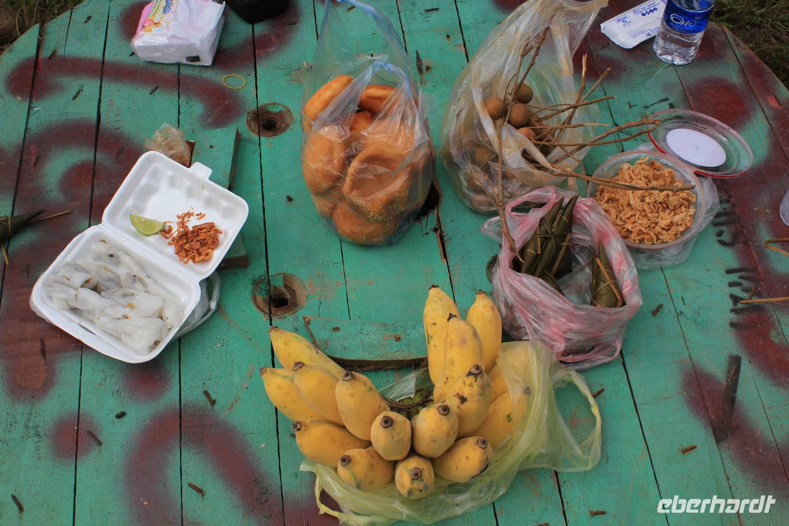 Jetzt verlassen wir die Stadt wieder und durchqueren erneut das nordöstliche Hochland. Doch weit kommen wir nicht, denn bereits am ersten Stopp an einem legendenumwobenen Stausee springt unser Bus nicht mehr an und wir müssen kräftig anschieben! Wie gesagt, wir sind hier nicht zum Spaß. Wie geplant lassen wir uns später bei unserer Mittagspause, umringt von grünem Urwald und herrlichem Bergpanorama, Litschi-artige Früchte, Bananen, in Pflanzenblätter gewickelten Klebereis, Maisbrötchen, Frühlingsrollen und Schweinefleisch in Zuckerwatten-Konsistenz schmecken! Und da es an der frischen Luft immer noch besser schmeckt ist schnell alles verputzt und wir „kurven" im wahrsten Sinne des Wortes weiter schiefliegend durch die Bergwelt.