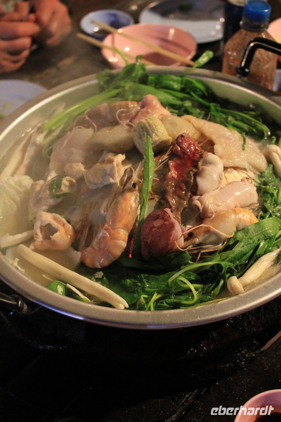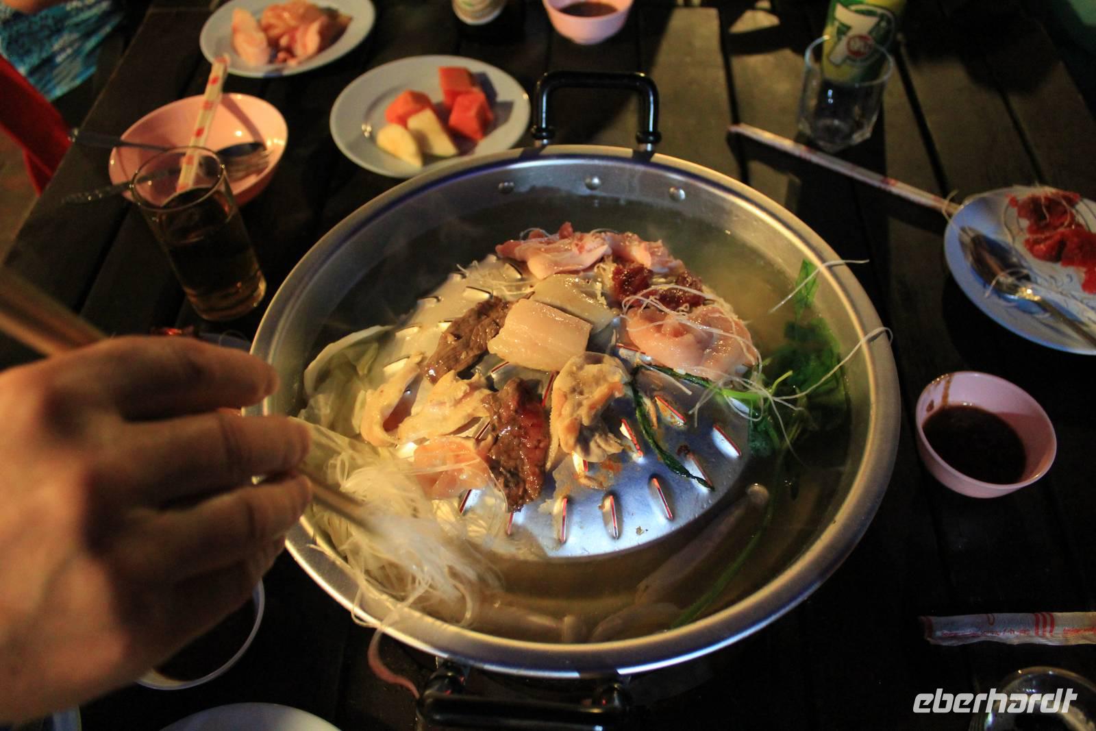 Mit einem großen Tuk-Tuk fahren wir in die Innenstadt und besuchen ein Restaurant direkt am Mekong, wo wir in den Genuss eines laotischen BBQ's kommen! Wieder packen wir selbst an und grillen uns Tintenfisch, Pengasius, Hühnchen, Wasserbüffel und Shrimps selbst auf einem hutähnlichen Grillgestell über glühenden Kohlen in der Tischmitte! Im Sud werden Glasnudeln und Gemüse weich und anschließend löffelt sich dies herrlich als Suppe! Ein ganz besonderes Erlebnis: laotisch - gesellig - schmackhaft - und auch noch sättigend!
