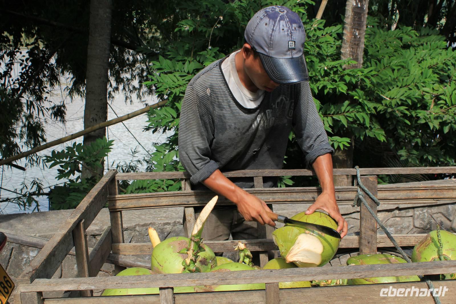Nach einer regenreichen Nacht starten wir heute fruchtig mit leckeren Obst-Shakes in den Tag, bevor wir bereits um 7:30 Uhr das Hotel verlassen und zur Bootsanlegestelle fahren. Hier besteigen wir unseren langen hölzernen Kahn, ausgestattet mit bequemen Sesseln, Tischen, einer Küche und allem was wir für eine entspannte Mekong-Fahrt benötigen. Und dann geht Sie los, unsere Tour auf dem majestätischen Strom, der im Tibet-Hochplateau entspringt und durch China, Burma, Laos, Kambodscha und Vietnam fließt. Der Name des 4.909 km langen Stroms stammt aus dem Laotischen und bedeutet so viel wie „Mutter allen Wassers". Wir lassen die Seele baumeln und uns den frischen Fahrtwind um die Nase wehen, während unser Boot gemächlich über das Wasser gleitet.