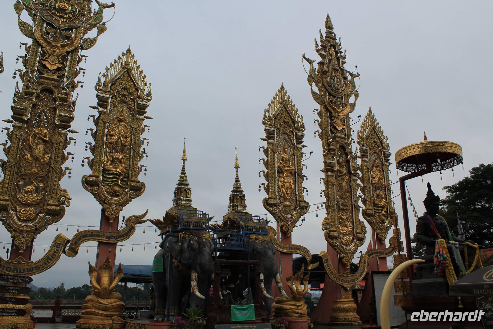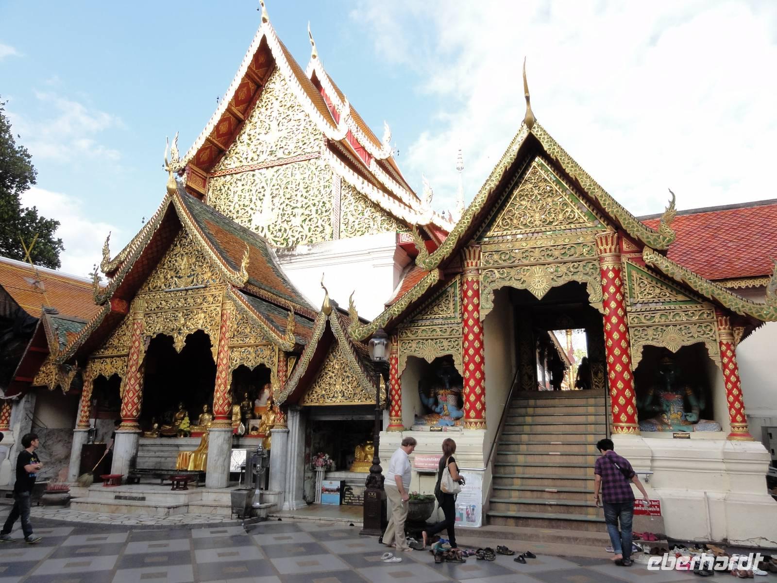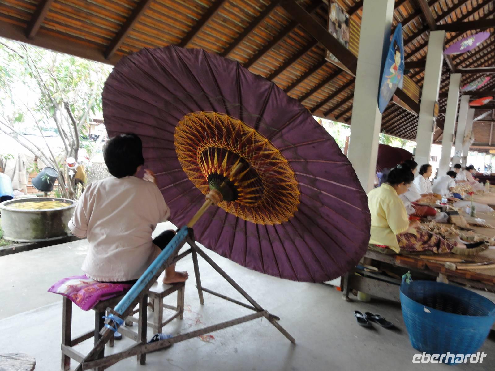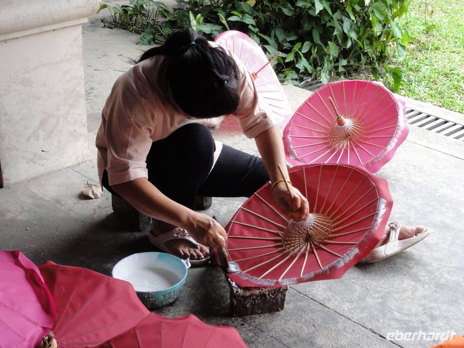 Chiang Mai ist besonders berühmt für sein Kunsthandwerk mit Holz, Edelsteinen, Seide und vielem mehr. So besuchen wir eine Schirmfabrik, bei der wir die Herstellung klassischer Holzschirme und -fächer gezeigt bekommen. Ganz fantastisch ist die Kunst der Bemalung! Auch wir lassen die Künstler aus unseren Handyhüllen, Taschen und Schlüsselanhängern kleine Schmuckstücke machen, indem sie Elefanten, Schmetterlinge oder Drachen in Windeseile und super filigran auf unsere Sachen malen! Einmal im Kaufrausch entscheiden wir demokratisch noch eine weitere Kunsthandwerksstätte zu besuchen - Silber! Fast schon gewaltsam müssen wir unsere Frauen schließlich aus den Tiefen der Glitzerwelt treiben, denn wir haben noch ein bisschen Kultur auf dem Programm stehen!