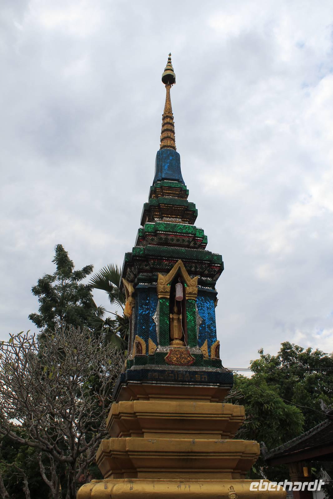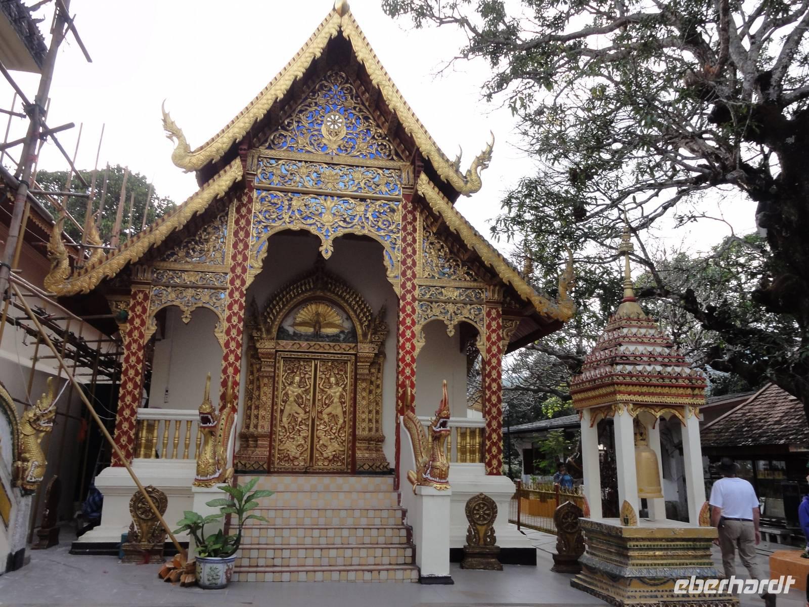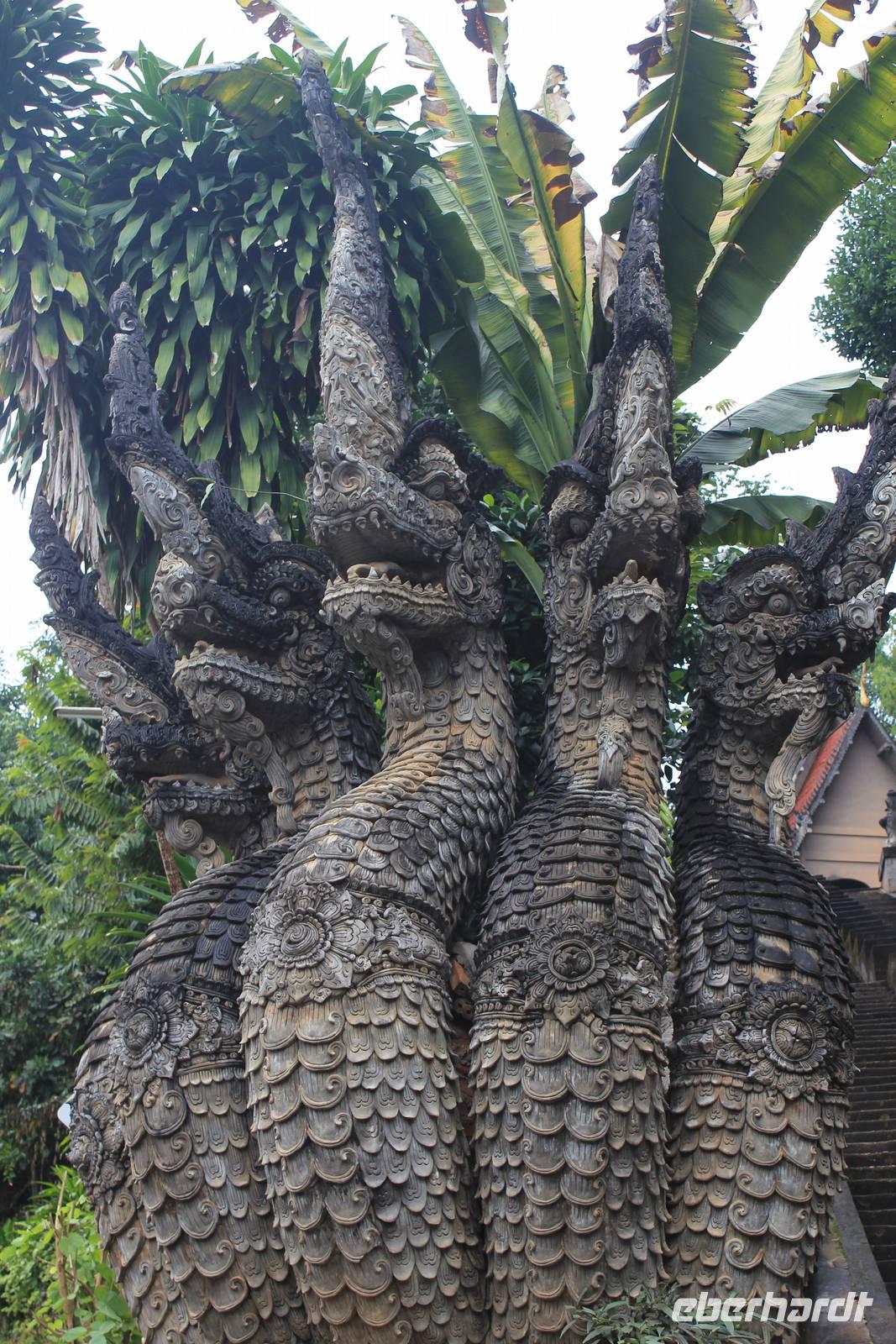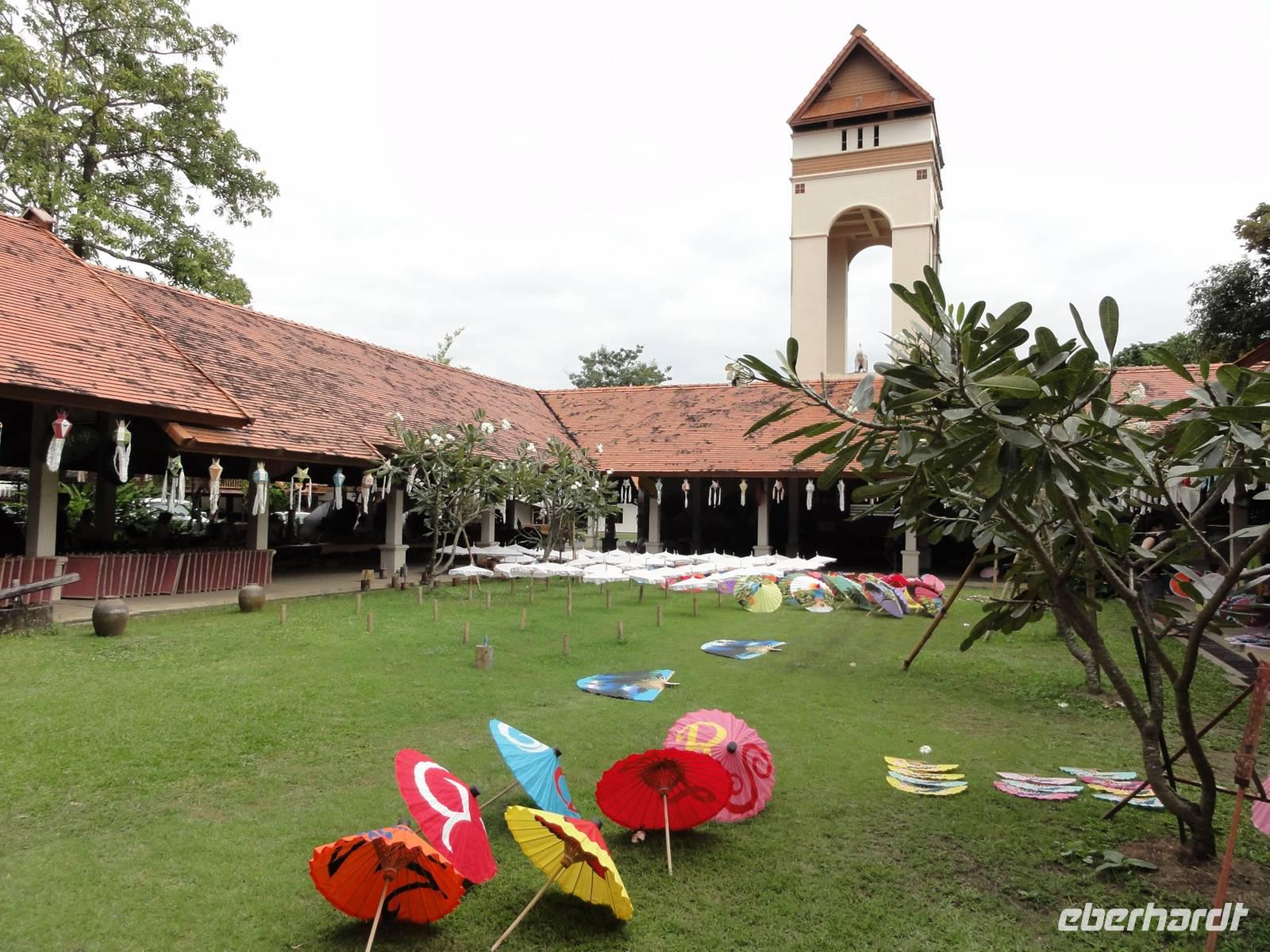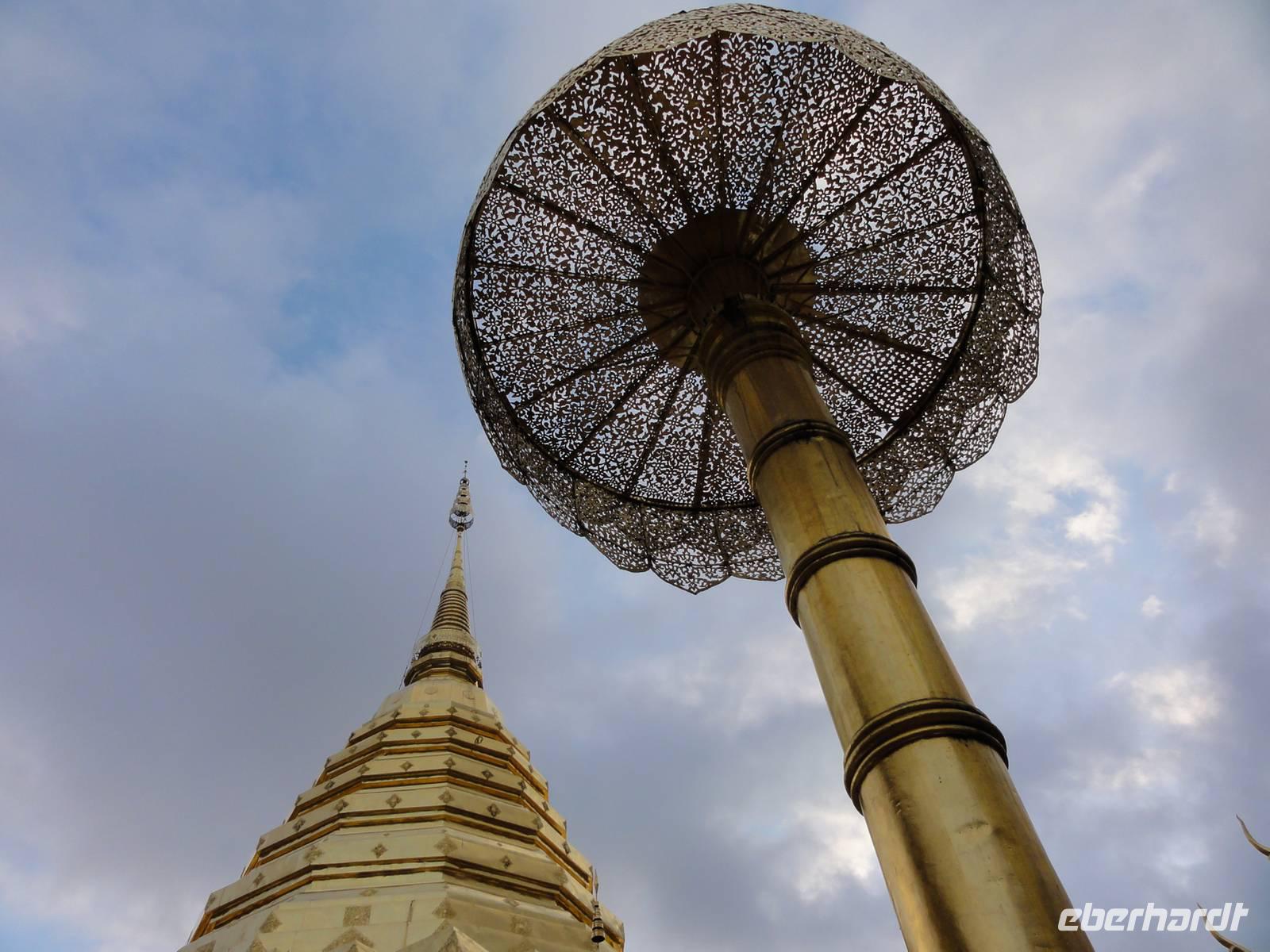 Chiang Mai ist besonders berühmt für sein Kunsthandwerk mit Holz, Edelsteinen, Seide und vielem mehr. So besuchen wir eine Schirmfabrik, bei der wir die Herstellung klassischer Holzschirme und -fächer gezeigt bekommen. Ganz fantastisch ist die Kunst der Bemalung! Auch wir lassen die Künstler aus unseren Handyhüllen, Taschen und Schlüsselanhängern kleine Schmuckstücke machen, indem sie Elefanten, Schmetterlinge oder Drachen in Windeseile und super filigran auf unsere Sachen malen! Einmal im Kaufrausch entscheiden wir demokratisch noch eine weitere Kunsthandwerksstätte zu besuchen - Silber! Fast schon gewaltsam müssen wir unsere Frauen schließlich aus den Tiefen der Glitzerwelt treiben, denn wir haben noch ein bisschen Kultur auf dem Programm stehen!