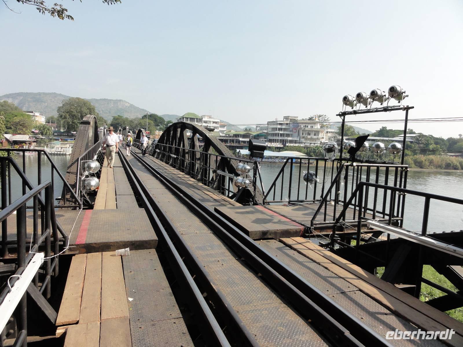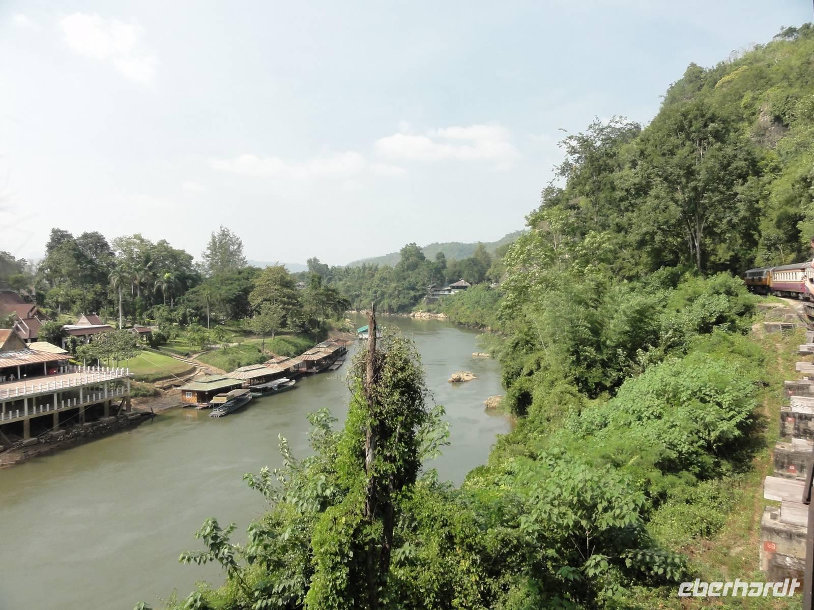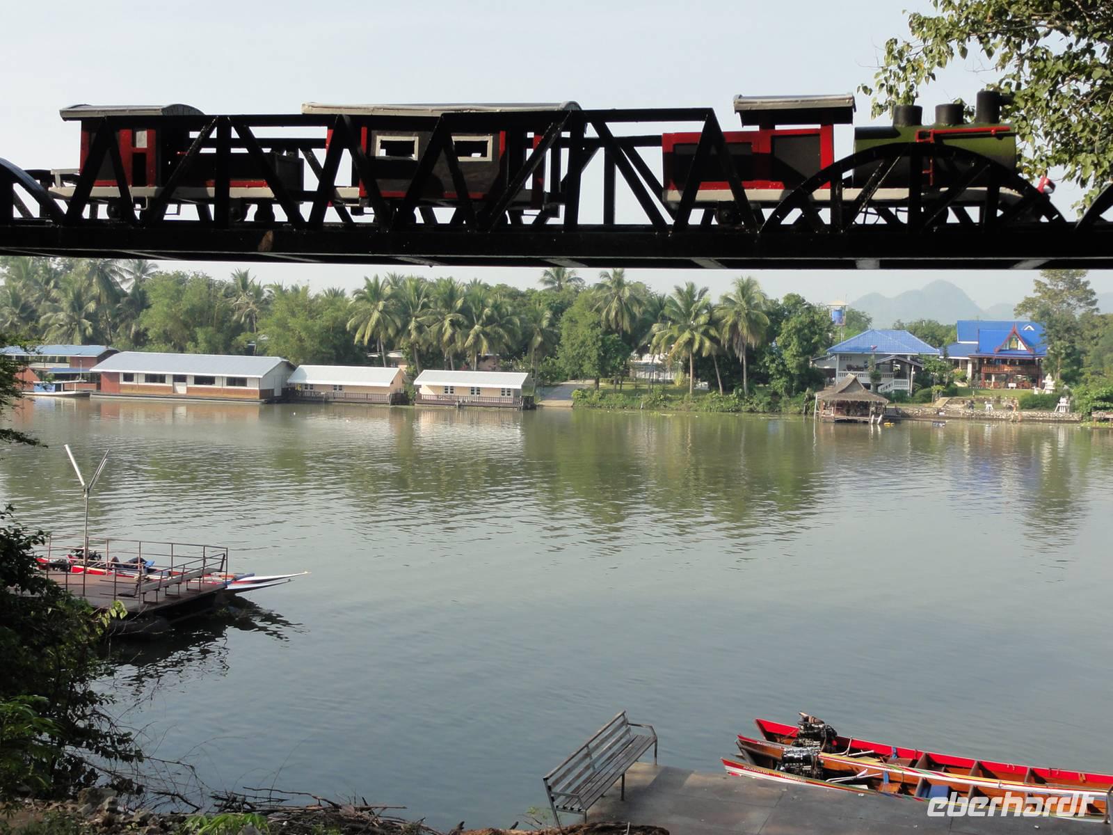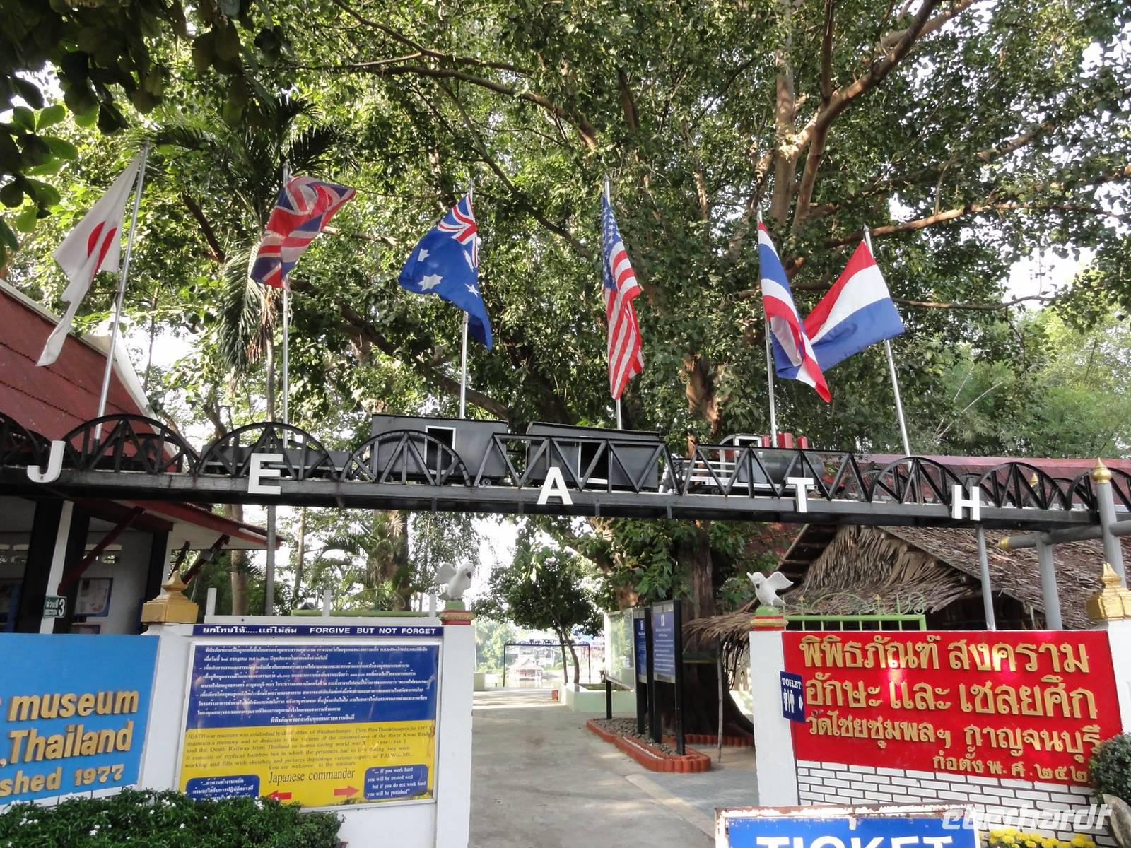 Der heutige Vormittag steht ganz im Zeichen der Schicksalsereignisse an der berühmt-berüchtigten Brücke am Kwai, die durch den gleichnamigen Roman von Pierre Boulle im Jahre 1956 weltbekannt wurde. Zunächst besuchen wir das JEATH-Museum, dass die Schicksale der britischen, US-amerikanischen und australischen Kriegsgefangenen der Japaner, die bei dem Bau der Brücke während des 2. Weltkriegs ums Leben kamen, eindrucksvoll darstellt. Wir wandeln durch 3 Bambushütten, die an jene erinnern in denen die Gefangenen untergebracht waren und begutachten alte Fotografien, handschriftliche Notizen und gemalte Bilder aus jener furchtbaren Zeit. Um die 61.000 Ausländer plus eine Viertelmillion Asiaten kamen als Kriegsgefangene dieser Zeit ums Leben. Unter unmöglichen Arbeitsbedingungen, bei unerträglicher Hitze, geplagt von Auszehrung und brutaler Gewalt schufteten die Gefangenen u.a. an der Brücke über den Fluss Kwae Noi, errichtet als Teil der strategisch wichtigen Eisenbahnstrecke, die über den Drei-Pagoden-Pass nach Birma führen sollte, um den Nachschub kriegswichtigen Materials zu sichern.