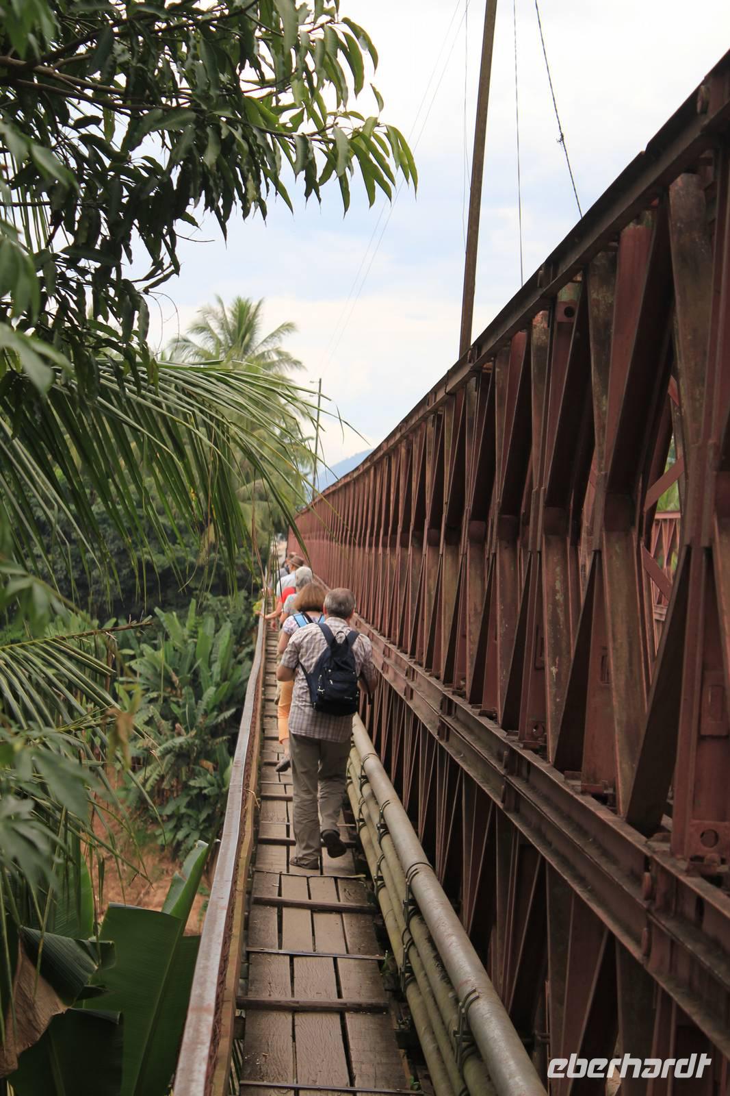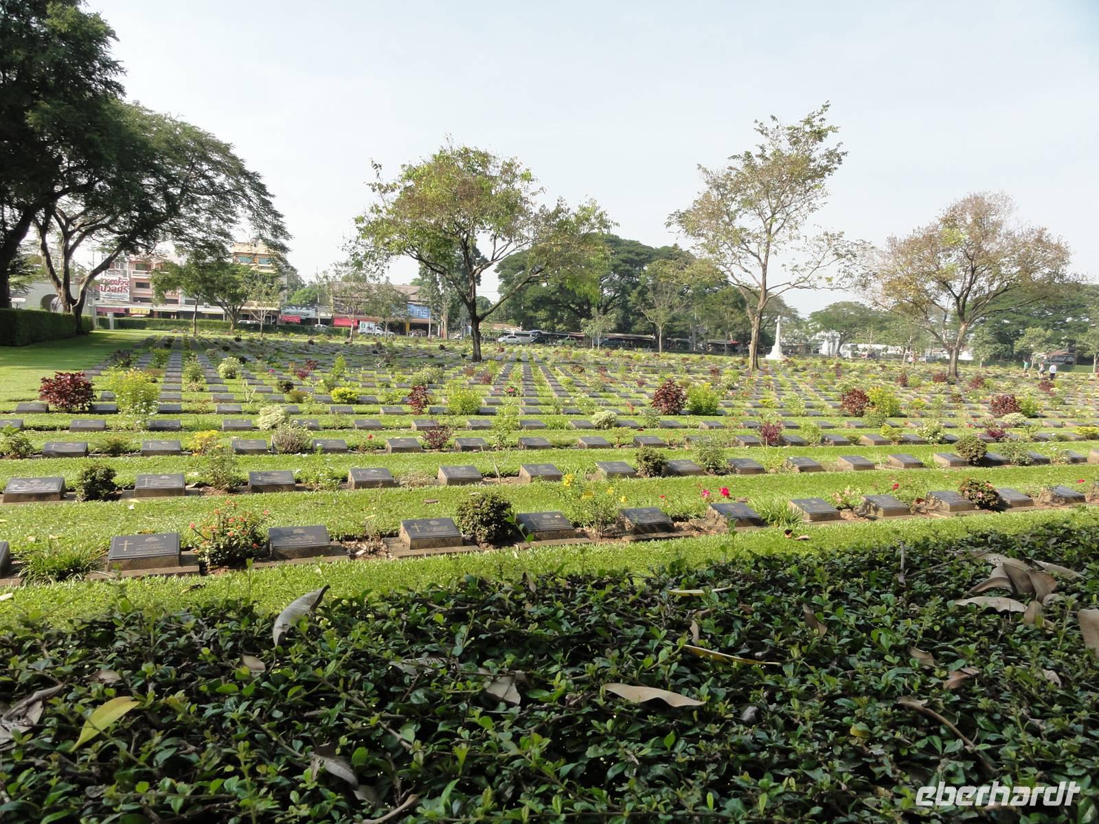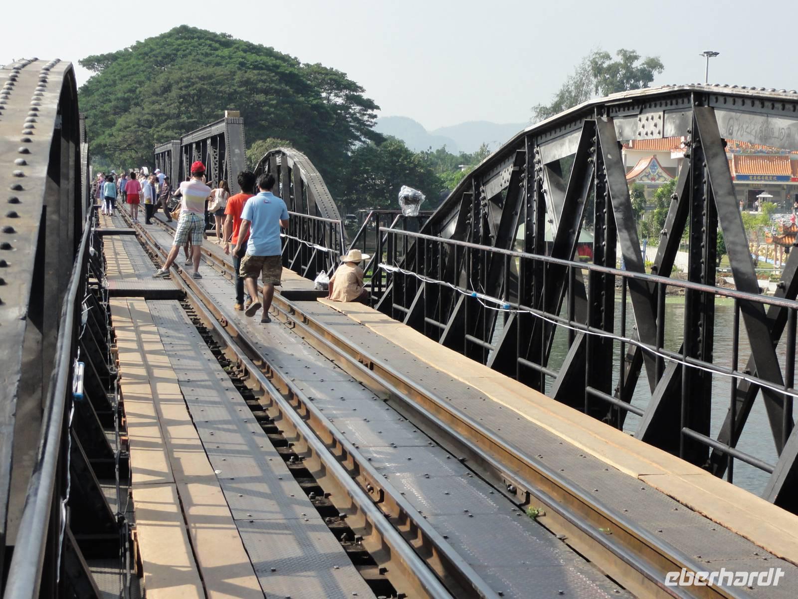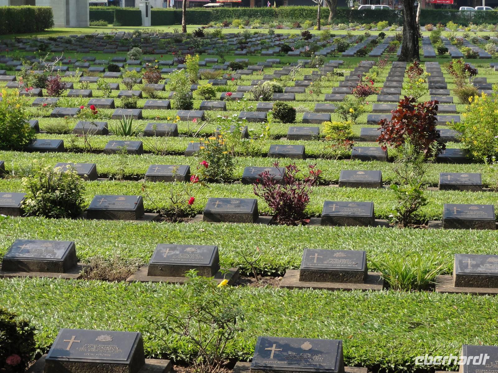 Der heutige Vormittag steht ganz im Zeichen der Schicksalsereignisse an der berühmt-berüchtigten Brücke am Kwai, die durch den gleichnamigen Roman von Pierre Boulle im Jahre 1956 weltbekannt wurde. Zunächst besuchen wir das JEATH-Museum, dass die Schicksale der britischen, US-amerikanischen und australischen Kriegsgefangenen der Japaner, die bei dem Bau der Brücke während des 2. Weltkriegs ums Leben kamen, eindrucksvoll darstellt. Wir wandeln durch 3 Bambushütten, die an jene erinnern in denen die Gefangenen untergebracht waren und begutachten alte Fotografien, handschriftliche Notizen und gemalte Bilder aus jener furchtbaren Zeit. Um die 61.000 Ausländer plus eine Viertelmillion Asiaten kamen als Kriegsgefangene dieser Zeit ums Leben. Unter unmöglichen Arbeitsbedingungen, bei unerträglicher Hitze, geplagt von Auszehrung und brutaler Gewalt schufteten die Gefangenen u.a. an der Brücke über den Fluss Kwae Noi, errichtet als Teil der strategisch wichtigen Eisenbahnstrecke, die über den Drei-Pagoden-Pass nach Birma führen sollte, um den Nachschub kriegswichtigen Materials zu sichern.