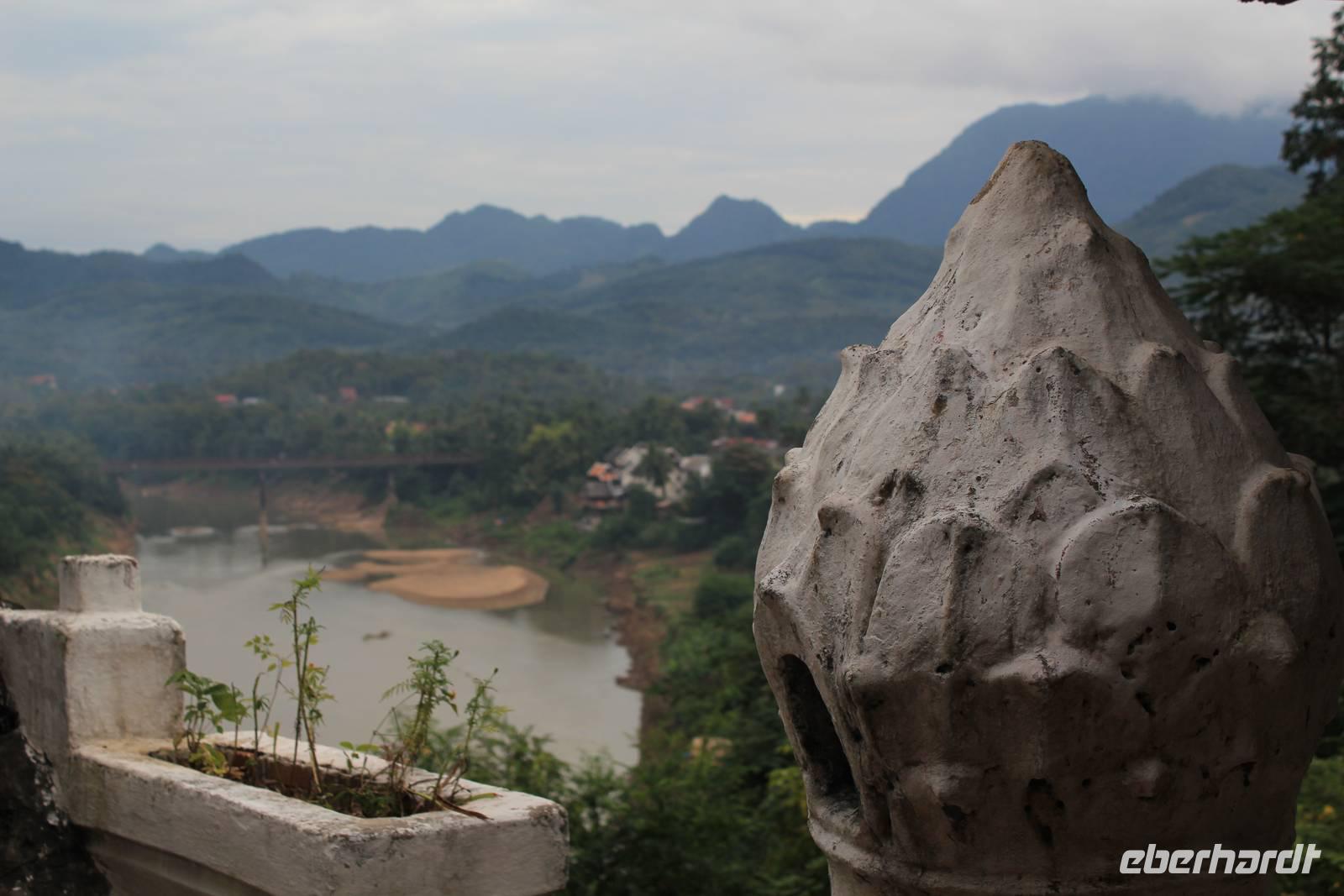 Unterwegs besuchen wir ein Bergdorf der Minderheit der „Hmong", bei dem wir wieder viele Kinderaugen mit unseren Bonbons und kleinen Spielzeugen strahlen lassen. Auch dieser Bergstamm hat seine eigene Sprache und Kultur und auch hier spielt der Ahnenkult und das „Zusammenleben" mit Geistern eine alltäglich gegenwärtige Rolle. Yang führt uns durch das am Hang gebaute Dorf mit einfachen Hütten, die auf feuchtem lehmigem Boden gebaut und mit dichten Schilfdächern bedeckt sind. Wir treffen auf einen jungen Mann, den wir bei seiner Arbeit mit schweren Reissäcken unterbrechen, der uns erzählt er habe 4 Frauen und 23 Kinder! Ganz normal! Wieder zutiefst fasziniert und erstaunt setzen wir unsere Fahrt fort, denn insgesamt haben wir heute 260 km bis nach Luang Prabang zu überwinden! Erst am frühen Abend erreichen wir die UNESCO-Welterbe-Stadt, die bis zur Machtübernahme 1975 Königsresidenz und Regierungssitz war. Unser idyllisches Hotel „Le Bel Air" liegt herrlich am Ufer des Nam Khan, der hier in Luang Prabang auf den Mekong trifft. Die Stadt verkörpert nicht nur das Laos längst vergangener Zeiten, sondern ist darüber hinaus auch religiöses, kulturelles und touristisches Zentrum des Landes. Der Buddhismus ist hier so präsent wie sonst nirgendwo und davon wollen wir uns bei unserem Besuch selbst überzeugen! Doch eins nach dem anderen, zunächst heißt es den Abend gemütlich ausklingen zu lassen!