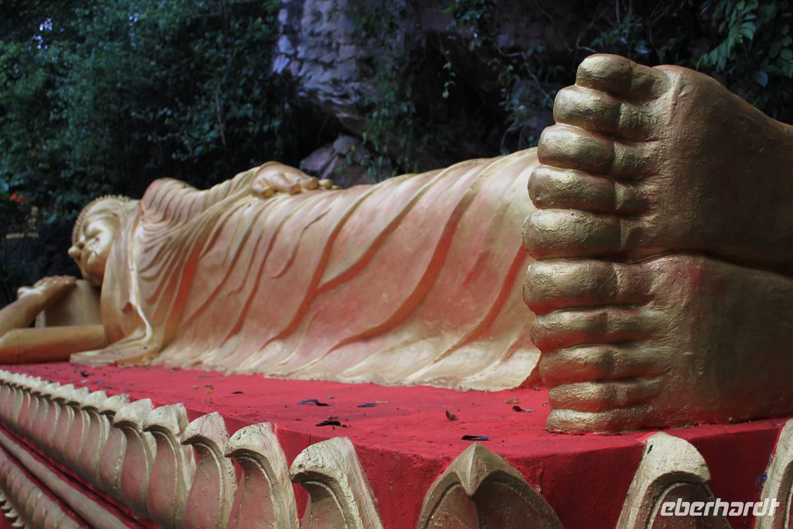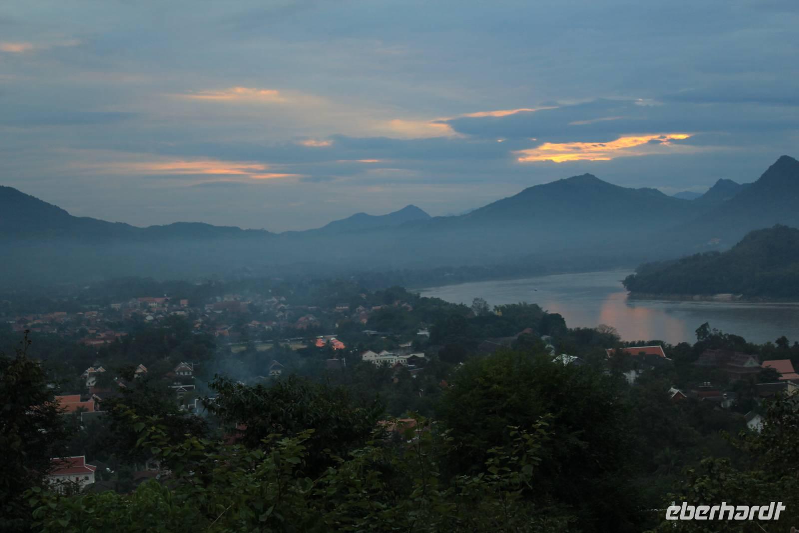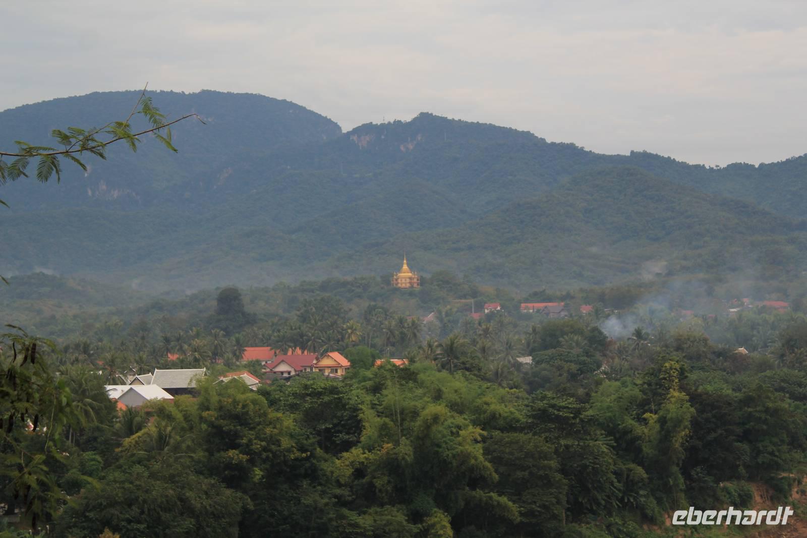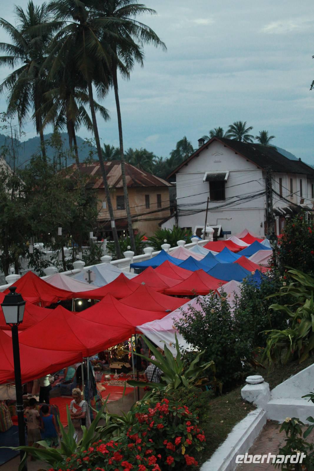 Nach so viel Kultur haben wir uns eine Pause verdient und so fahren wir vorerst zurück zum Hotel, bevor es am Nachmittag weiter geht zum heiligen Tempelberg Phou Si. Über 328 Stufen klettern wir in die Höhe, während uns unterwegs immer wieder goldene Buddha-Statuen und auch Buddhas Fußabdruck in einer Höhle begegnen. Die Spitze des Hügels ist gekrönt von einer Pagode mit goldener Kuppel und einer wunderschönen Aussicht über die sich in der Dschungellandschaft ausbreitende Altstadt. Wenig später erreichen wir über einen anderen Weg wieder das Nationalmuseum, vor dem sich inzwischen hunderte bunt beleuchtete Stände aufgebaut haben! Der alltägliche Nachtmarkt ist in vollem Gange und so schlendern auch wir kaufbereit durch die Reihen und erspähen Mitbringsel und Geschenke zu Spottpreisen.