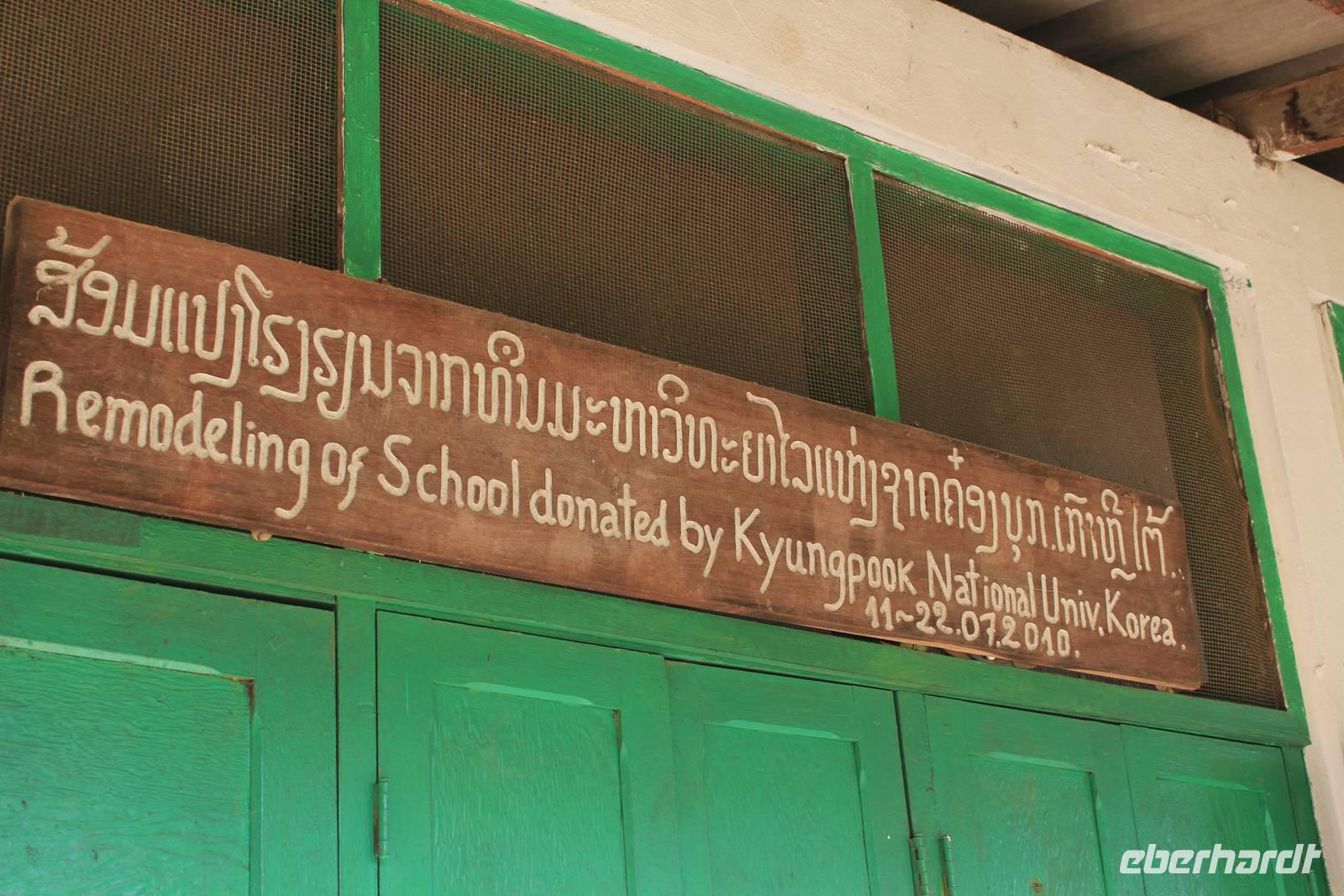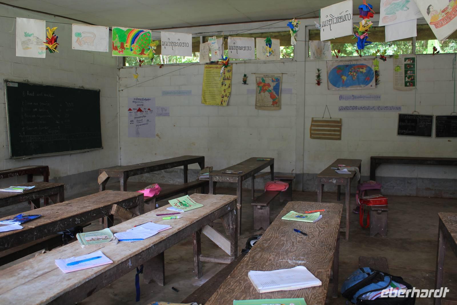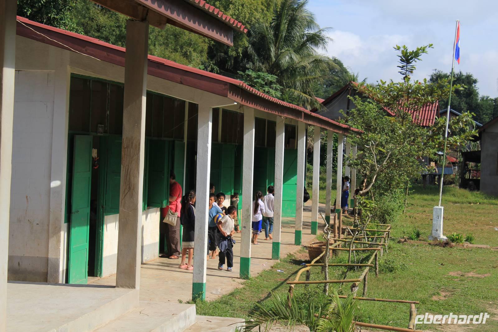 Pünktlich zum Frühstück kehren wir ins Hotel zurück und können uns bis zur Abfahrt um 9 Uhr fast noch einmal hinlegen. Schließlich geht es wieder ein Stück aufs Land und schon wenige Kilometer außerhalb Luang Prabangs erleben wir einen ganz besonderen Höhepunkt unserer Reise: Spontan besuchen wir eine Grundschule und ebenso spontan unterbrechen die stillen uniformierten Lehrer ihren Unterricht für uns. Erst ganz schüchtern, dann aber voller Leidenschaft reisen sich die Zwerge um unsere mitgebrachten Bleistifte, Filzmaler und Süßigkeiten aus Deutschland! Jeder will etwas abhaben und wir werden nahezu überrannt! Wir sind sehr ergriffen von so viel Freude und Begeisterung, die diese Kinder bei unserem Besuch ausstrahlen. Total aufgekratzt hüpfen sie vor unseren Faszination auslösenden Kameras herum, klatschen mit uns ab und lächeln uns einfach mit einer förmlich greifbaren Freude an! Ein wirklich sehr bewegendes Erlebnis! Die schlichten, offenen Klassenräume mit Holzbänken und kargen Steinwänden sind liebevoll mit selbstgemalten Bildern der Kinder dekoriert. Nur schwer können wir uns wieder trennen und zum Abschied winken uns 80 kleine dunkle Händchen zu.