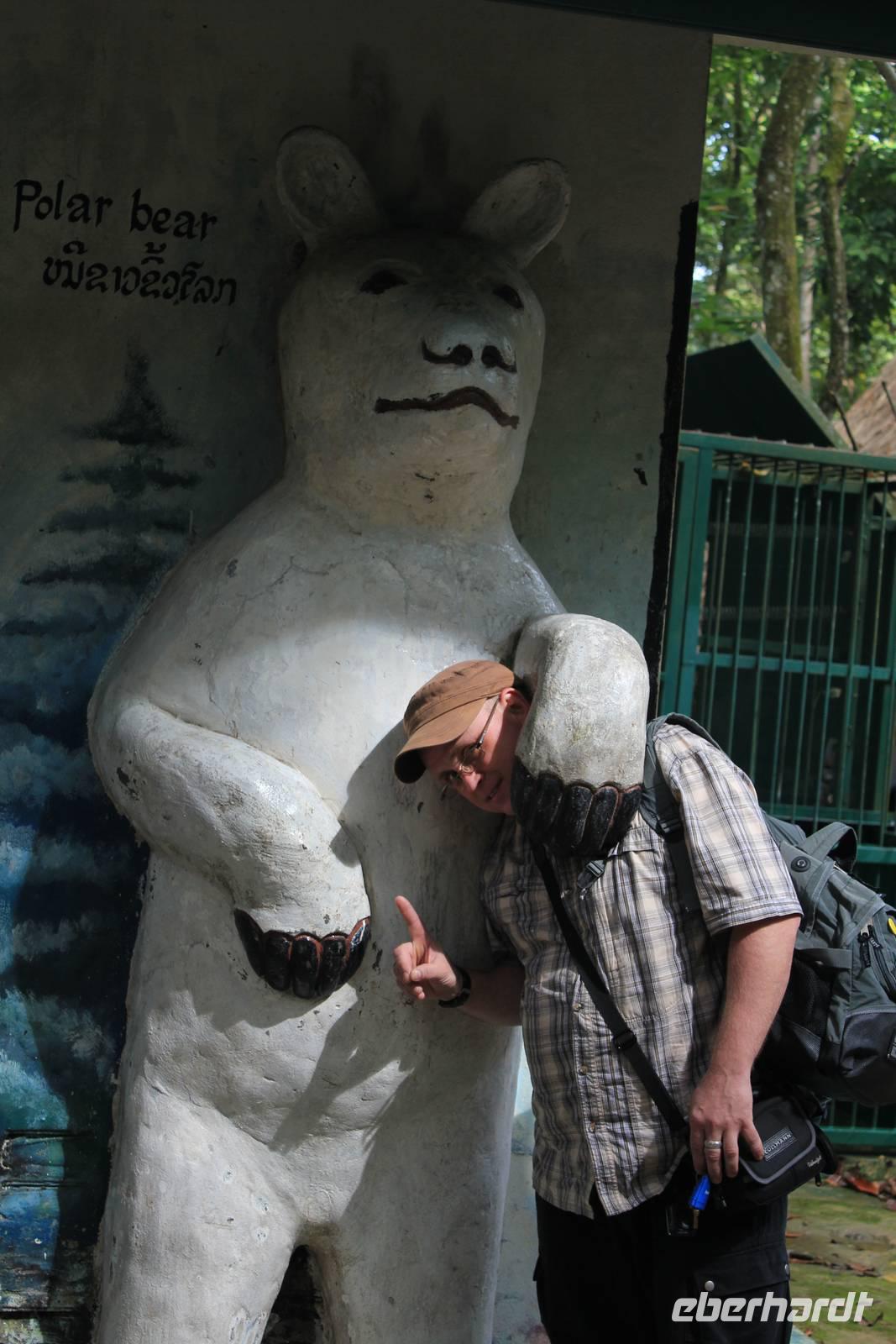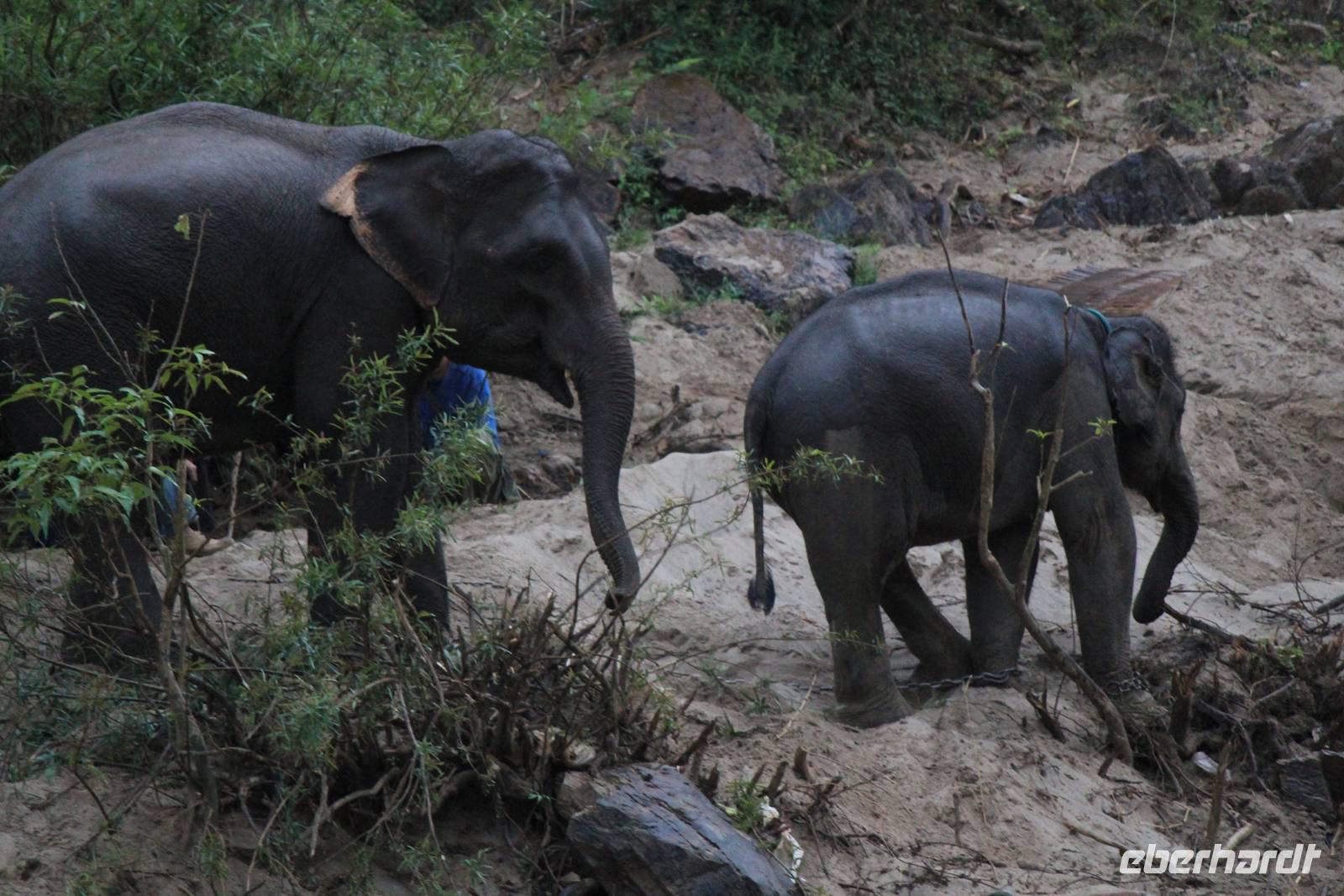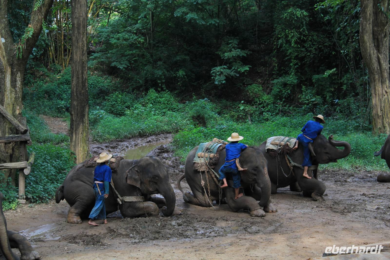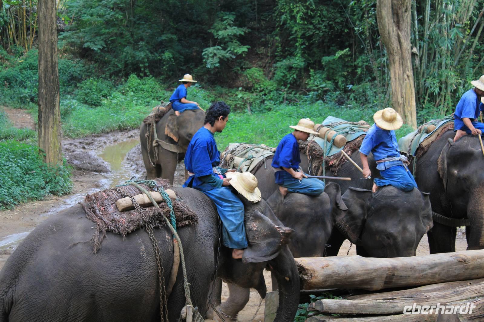 „Nur die harten kommen in den Garten" und getreu diesem Motto machen wir uns heute Morgen bereits vor Sonnenaufgang um 6 Uhr auf den Weg nach Chiang Mai. Denn wir haben einen wichtigen Termin mit ein paar gemütlichen Dickhäutern einzuhalten! Fast 4 Stunden brauchen wir bis zum Elefantencamp Chiang-Dao, in das uns eine wackelige Hängebrücke über den Fluss führt. Als erstes bekommen wir von den gutmütigen Riesen ihre Geschicklichkeit vorgeführt, die in der Forstwirtschaft hoch geschätzt wird. Etwa 2.000 wilde Elefanten gibt es noch in Thailand und ca. 3.000 die in Camps wie diesem leben, bzw. zur Arbeit eingesetzt werden. Seit 1988 gilt ein landesweites Fällverbot für Tropenhölzer, womit die Zahl der Arbeitselefanten stark zurückging. Ab einem Alter von 3 Jahren werden Babyelefanten in die „Elefantenschule" geschickt, wo sie auf ihre zukünftigen Aufgaben vorbereitet werden. Heutzutage gibt es einige hunderte „arbeitslose" Elefanten in solchen Camps, die von der Regierung Unterhaltszuschüsse erhalten, zum größten Teil aber von Besuchern wie uns leben.