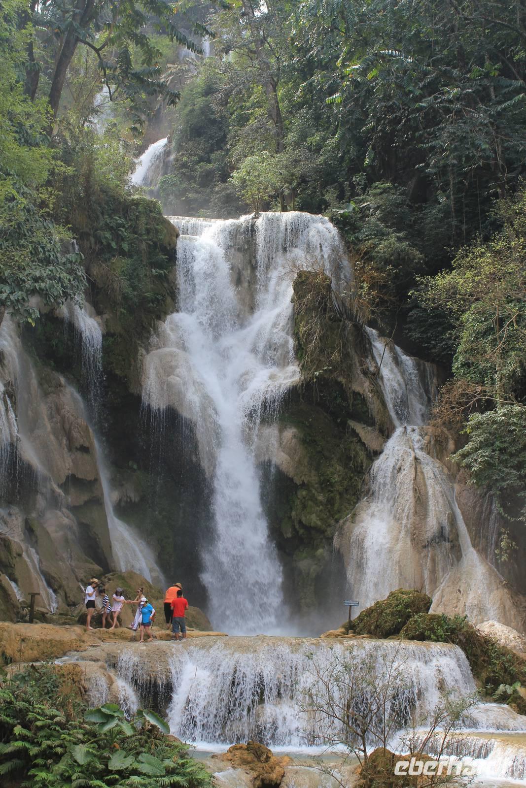 Gegen 11 Uhr erreichen wir unser Tagesziel: den Kuang Si Wasserfall. In mehreren Kaskaden tost dieser über eine ca. 50 Meter hohe Felswand in einer von dichtem Grün umrahmten Schlucht. Der Kuang Si bildet zahlreiche blau-schimmernde Felsenpools, die uns zum Baden und Entspannen einladen! Also los! Am obersten Punkt suchen wir uns am Fuße des Falls 2 Picknicktische fur unsere Gruppe und fast alle stürzen sich gleich in das erfrischend-kühle Nass! In solch traumhafter Kulisse ein Bad zu nehmen ist nahezu nicht zu übertreffen. Das Wasser scheint sich förmlich seinen Weg durch die Mangrovenbäume hindurch nach unten zu bahnen und schafft so wie eine Art Teppich, der sich durch die ganze Schlucht zieht. Baden macht hungrig und so laden uns Elisa und Yang zum Picknick unterm Wasserfall ein! Gegrillter Fisch, Hühnchen und frisches Obst lassen uns neue Kraft tanken!