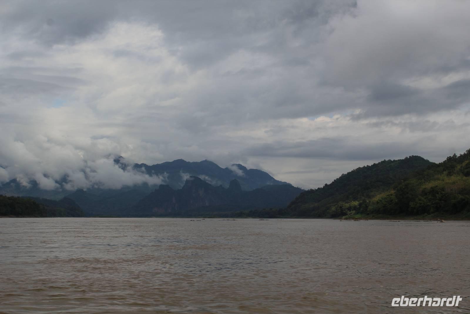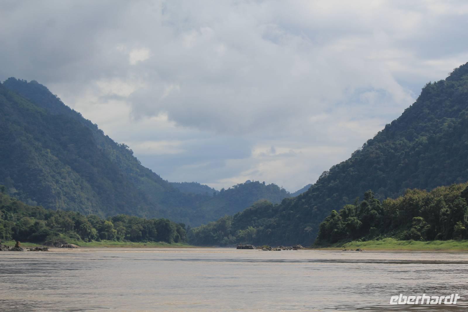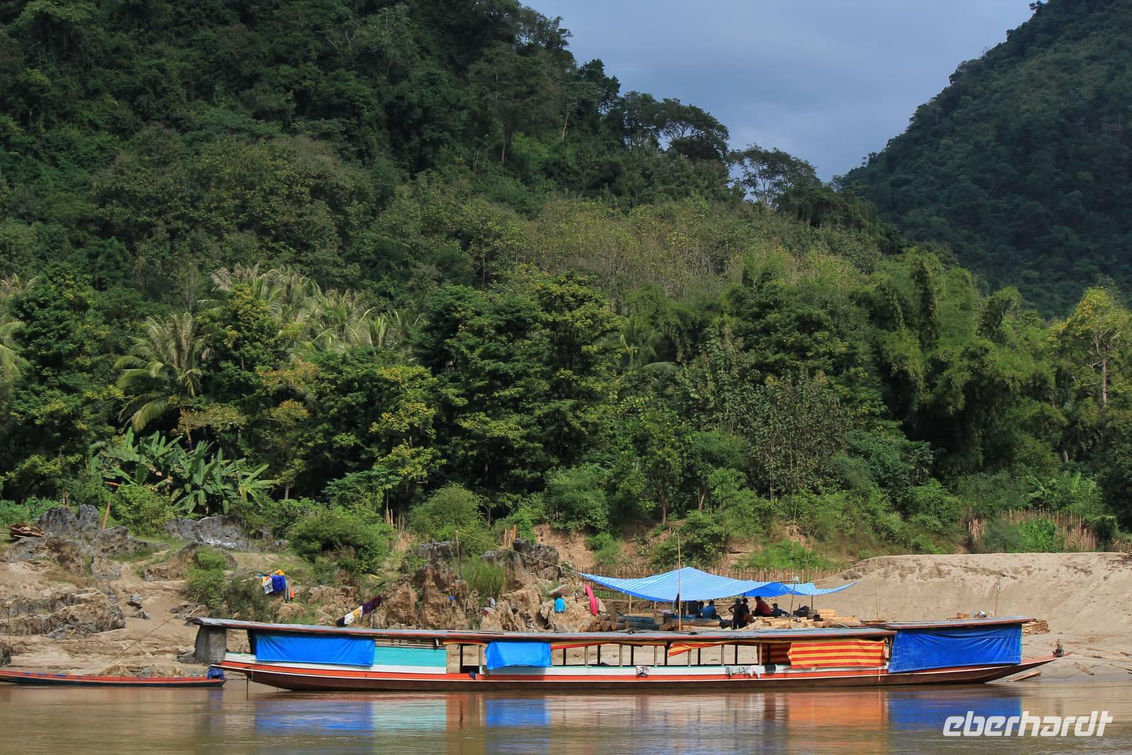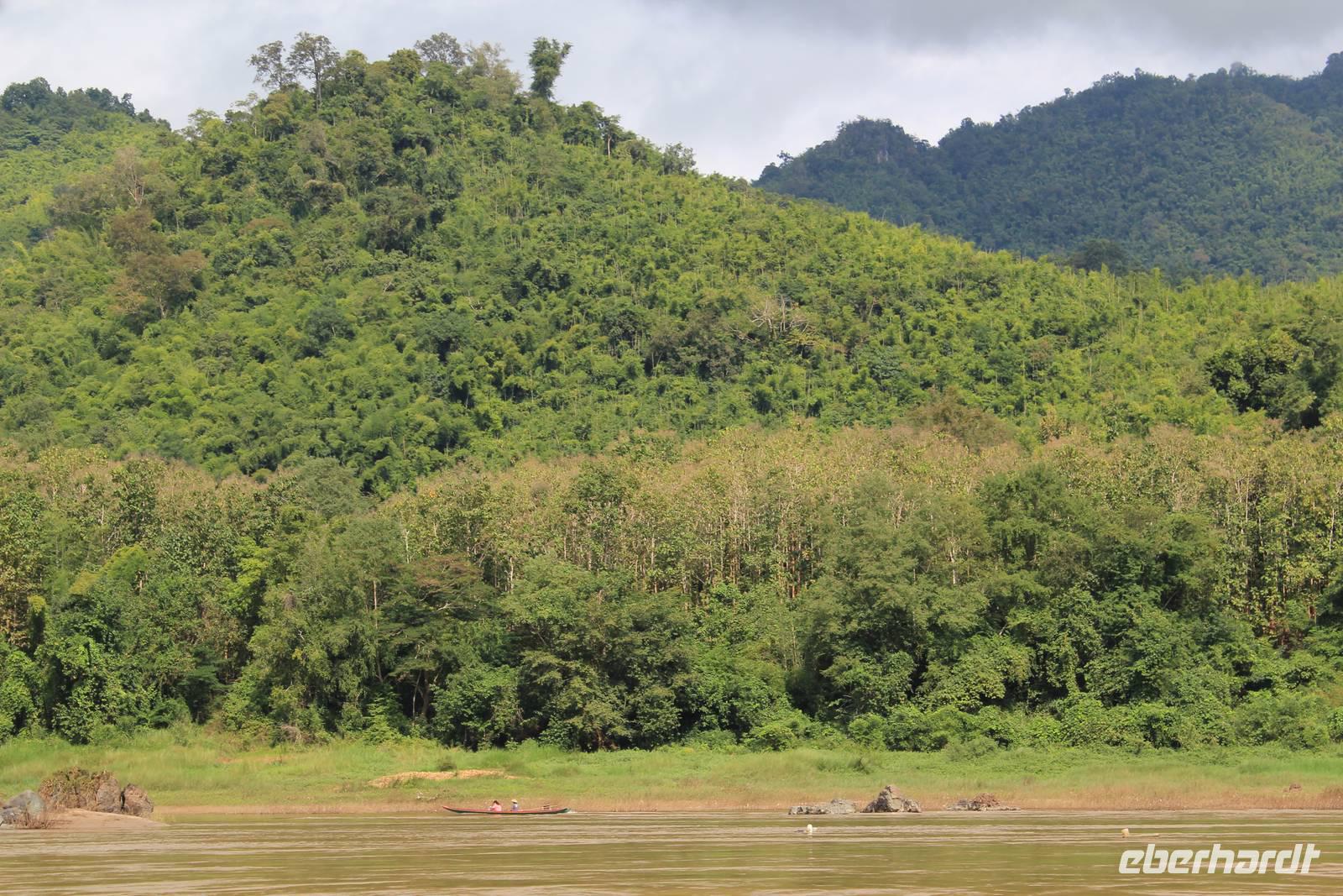 Wieder an Bord setzen wir die Fahrt bis zum Abend fort. Das Ufer ist gesäumt von dichtem Dschungel, der sich über Hügel und kleine Berge zieht und den zahlreichen Wasserbüffeln einen nahrhaften Lebensraum bietet. Erdnussfelder, Bauern in ihren Holzbooten und immer wieder kleine Walddörfer ziehen an uns vorbei - eine Landschaft die unsere Augen wahrlich zur Entspannung einlädt! Die Bootsfamilie verköstigt uns mit frisch gekochtem Mittagessen und den Nachmittag verbringen wir mit interessanten Gesprächen, lesen, Spiele spielen, fotografieren und einfach mal die Ruhe genießen! Auch ein heftiger Schauer zieht über uns hinweg, bei dem wir die Seitenwände herunter lassen und es uns so richtig gemütlich machen!