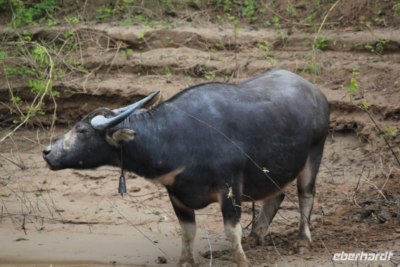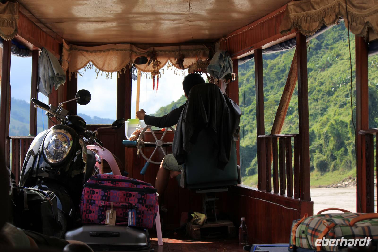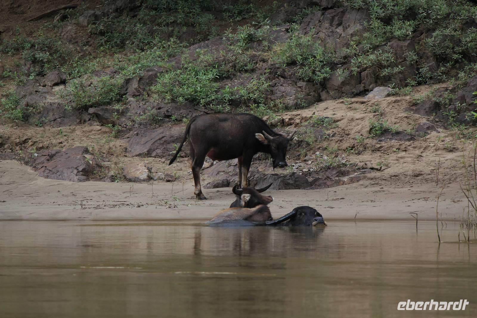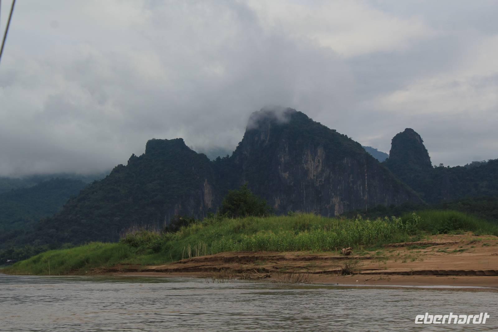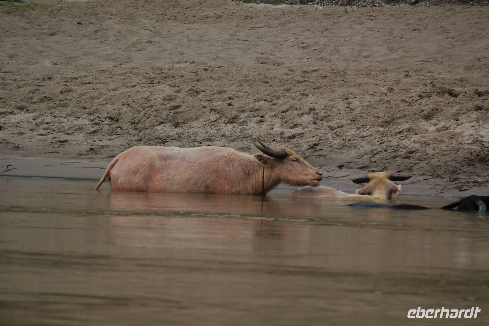 Wieder an Bord setzen wir die Fahrt bis zum Abend fort. Das Ufer ist gesäumt von dichtem Dschungel, der sich über Hügel und kleine Berge zieht und den zahlreichen Wasserbüffeln einen nahrhaften Lebensraum bietet. Erdnussfelder, Bauern in ihren Holzbooten und immer wieder kleine Walddörfer ziehen an uns vorbei - eine Landschaft die unsere Augen wahrlich zur Entspannung einlädt! Die Bootsfamilie verköstigt uns mit frisch gekochtem Mittagessen und den Nachmittag verbringen wir mit interessanten Gesprächen, lesen, Spiele spielen, fotografieren und einfach mal die Ruhe genießen! Auch ein heftiger Schauer zieht über uns hinweg, bei dem wir die Seitenwände herunter lassen und es uns so richtig gemütlich machen!
