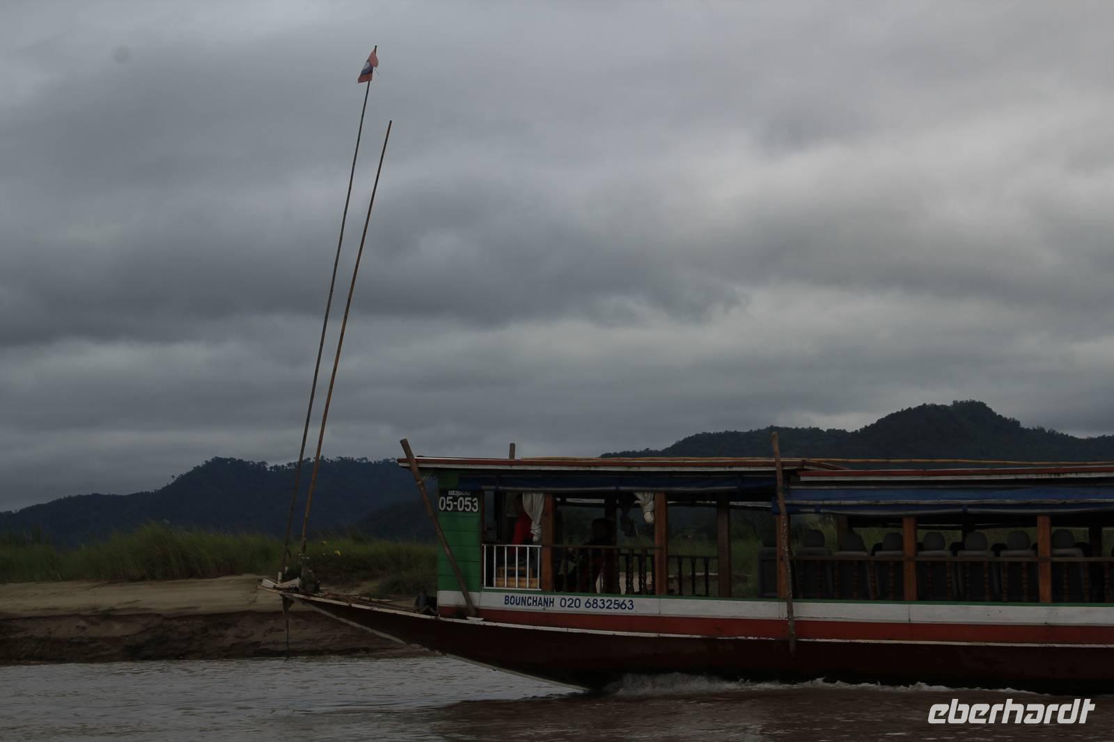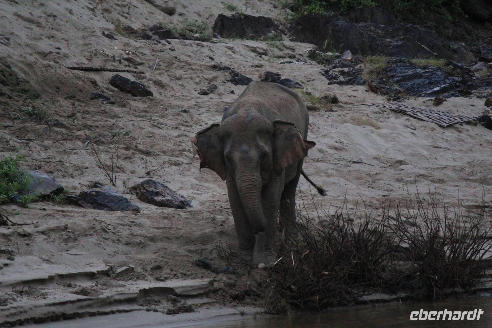 Bei wirklich ungemütlichem Wetter, Wind und Nieselregen setzen wir heute bereits um 7 Uhr unsere Fahrt auf dem Mekong fort. Das frühe Aufstehen hat sich gelohnt: wir beobachten am Flussufer Elefanten mit ihren Mahouts! Ein idyllischer Anblick in der grünen Dschungellandschaft! Unser Frühstück genießen wir heute bei voller Fahrt auf unserem gemütlichen Kahn! In trauter 12-samkeit lassen wir Spiegelei, frisches Brot sowie Müsli-Riegel und Kekse aus Deutschland schlemmend, den Blick in die Umgebung schweifen. So lässt es sich leben!