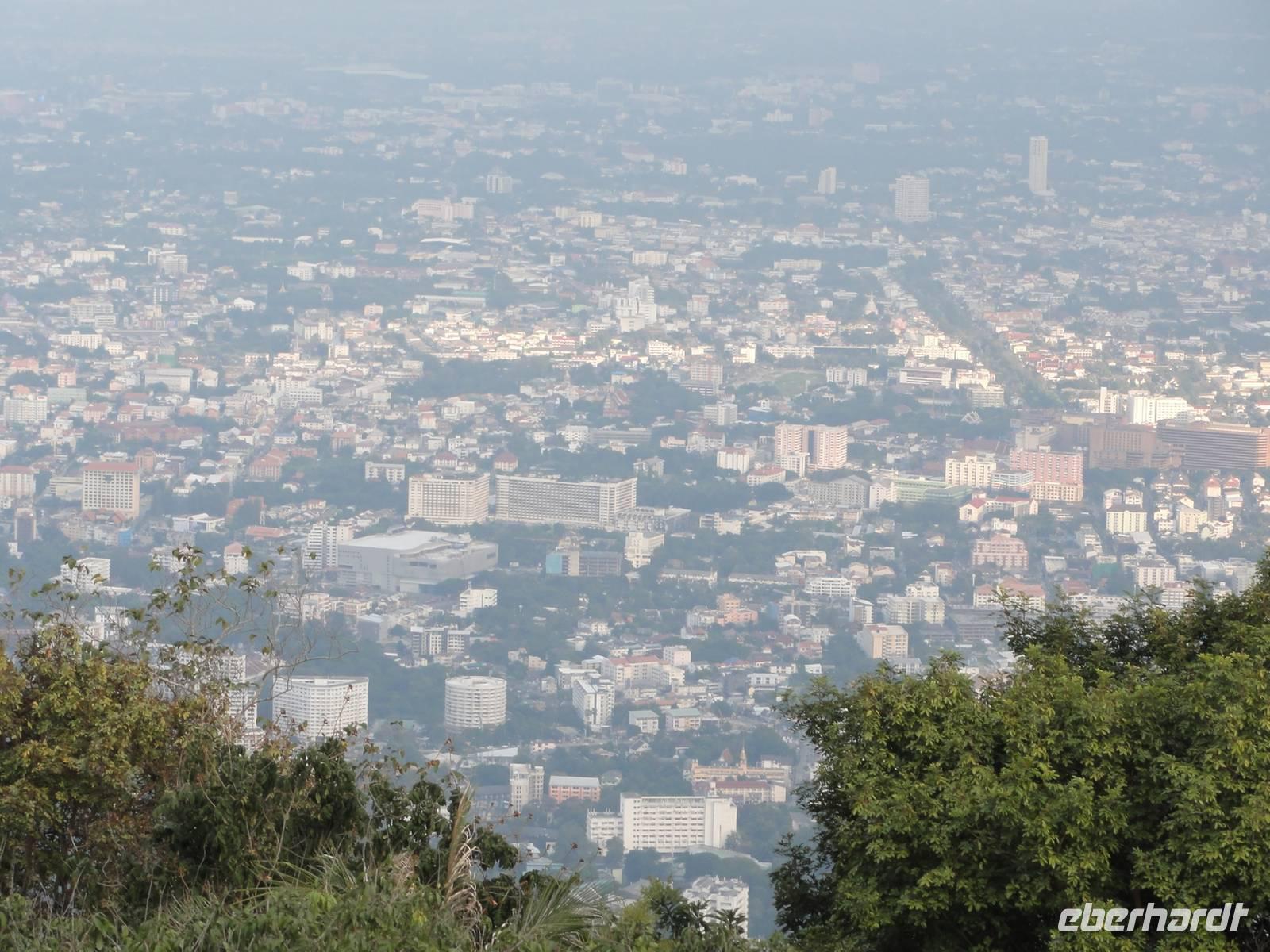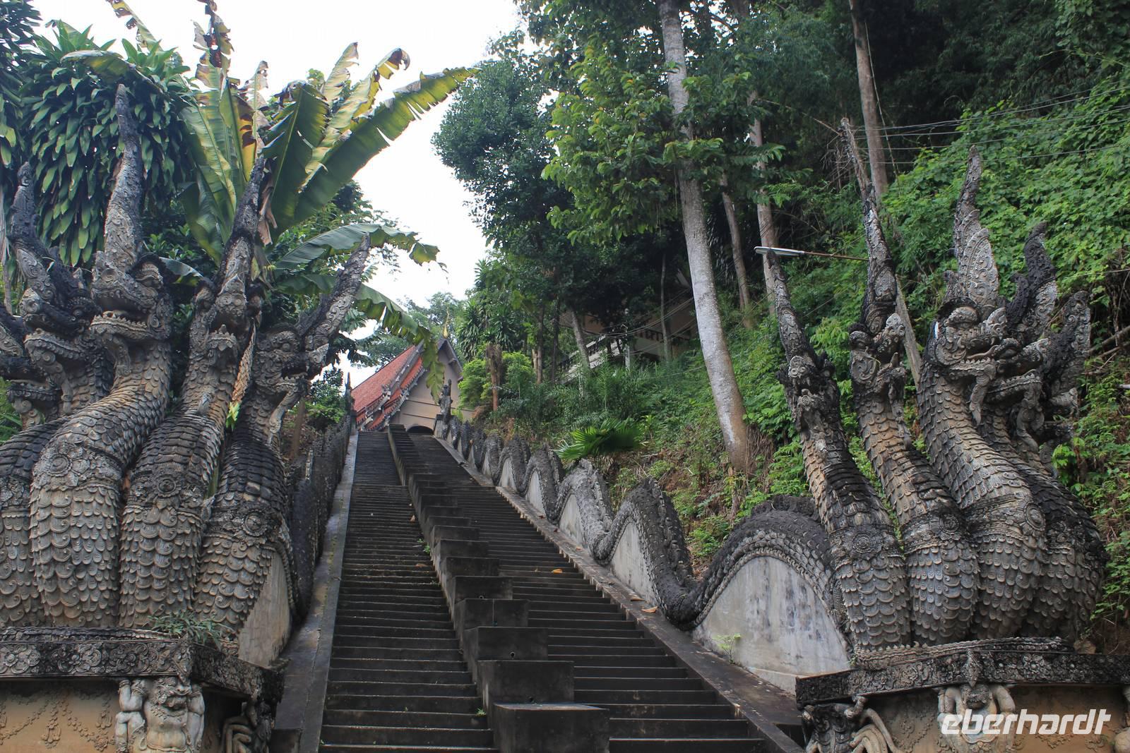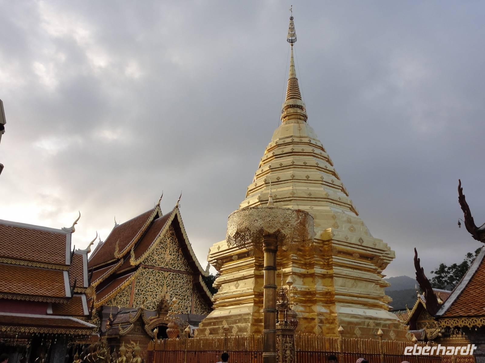 Gegen 16 Uhr erreichen wir das bedeutendste Wahrzeichen Chiang Mai's. Der Tempel Wat Doi Suthep, liegt inmitten herrlicher Landschaft, etwas außerhalb der Stadt am Fuße des Gipfels des Doi Pui (1.685 m ü.d.M.). Erbaut wurde er 1383 und der Legende nach trug einst ein Weißer Elefant die Asche von Lord Buddha auf den Berg hinauf, legte sich nieder und als man ihm den Altar abnahm starb er. Genau an dieser Stelle steht heute der heilige Tempel. Mit einer kleinen Zahnradbahn erreichen wir diesen und überblicken von hier aus die ganze Stadt.