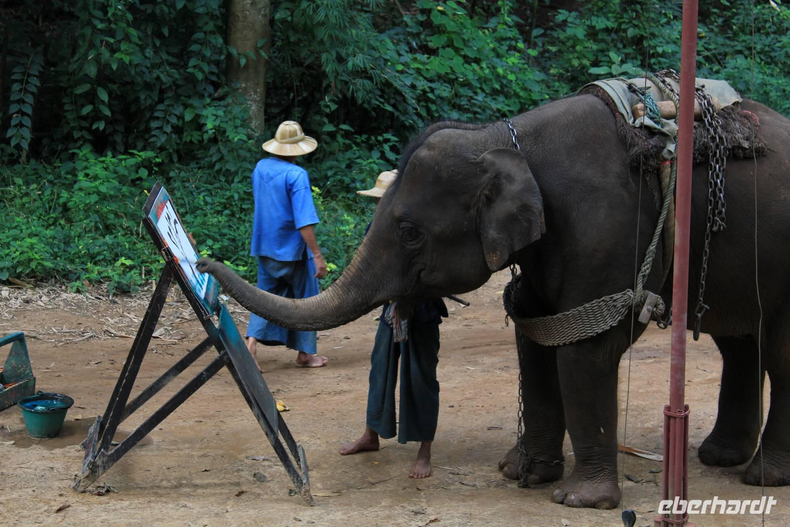 Wir können mit ansehen, wie die treuen Tiere gemeinsam mit ihren Mahouts Baumstämme transportieren und stapeln können, bekommen gezeigt wie die Elefantenführer auf- und absteigen und sogar ein Künstler befindet sich unter den Elefanten, der herzallerliebst ein schönes Bild malt!