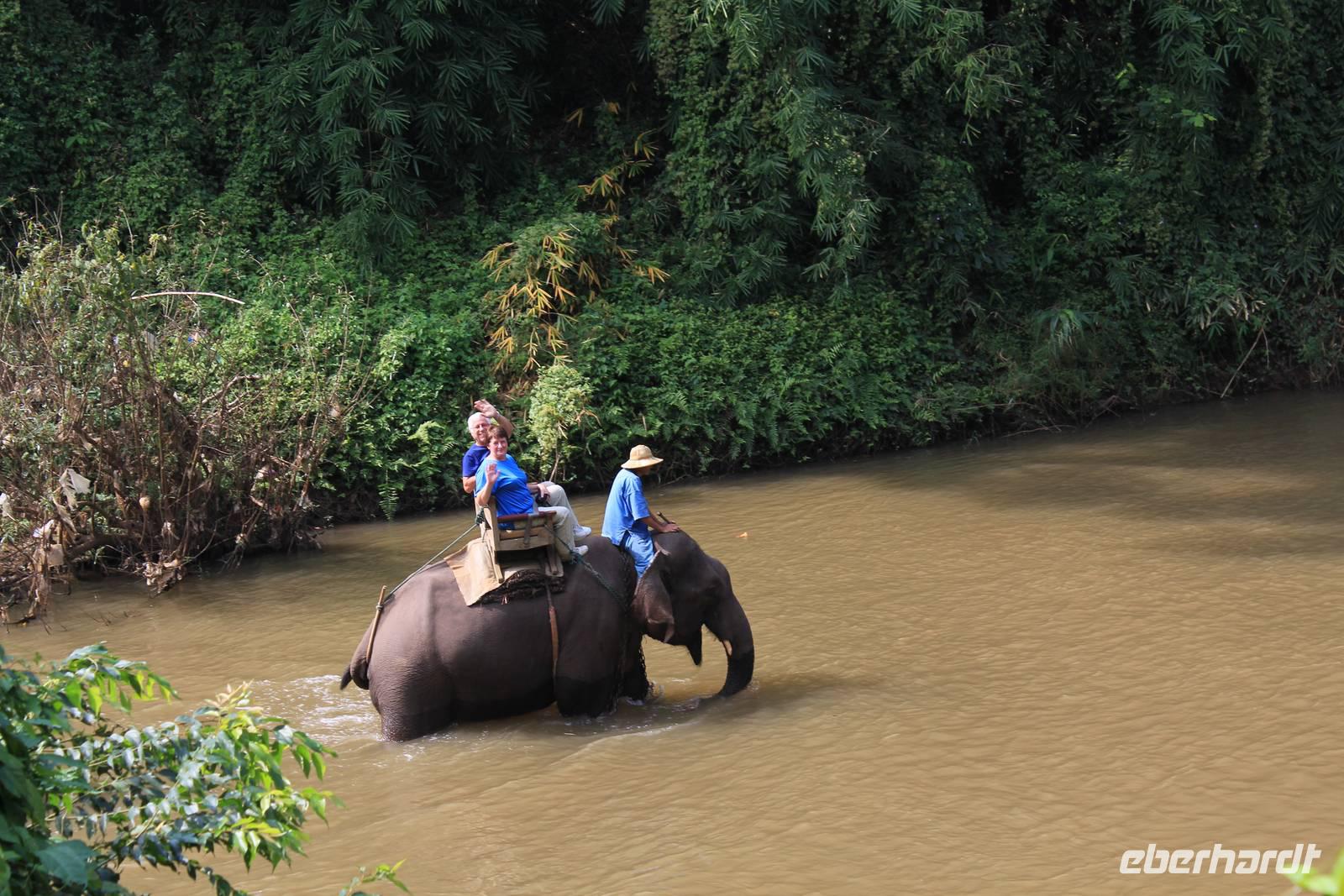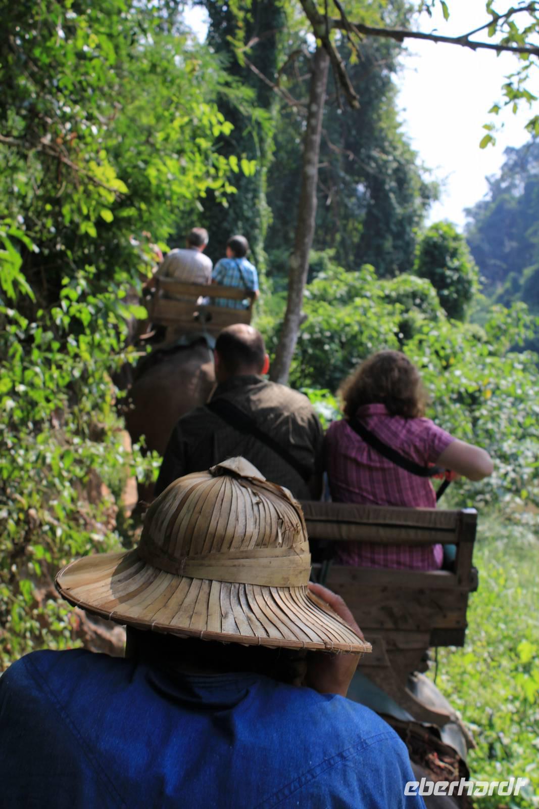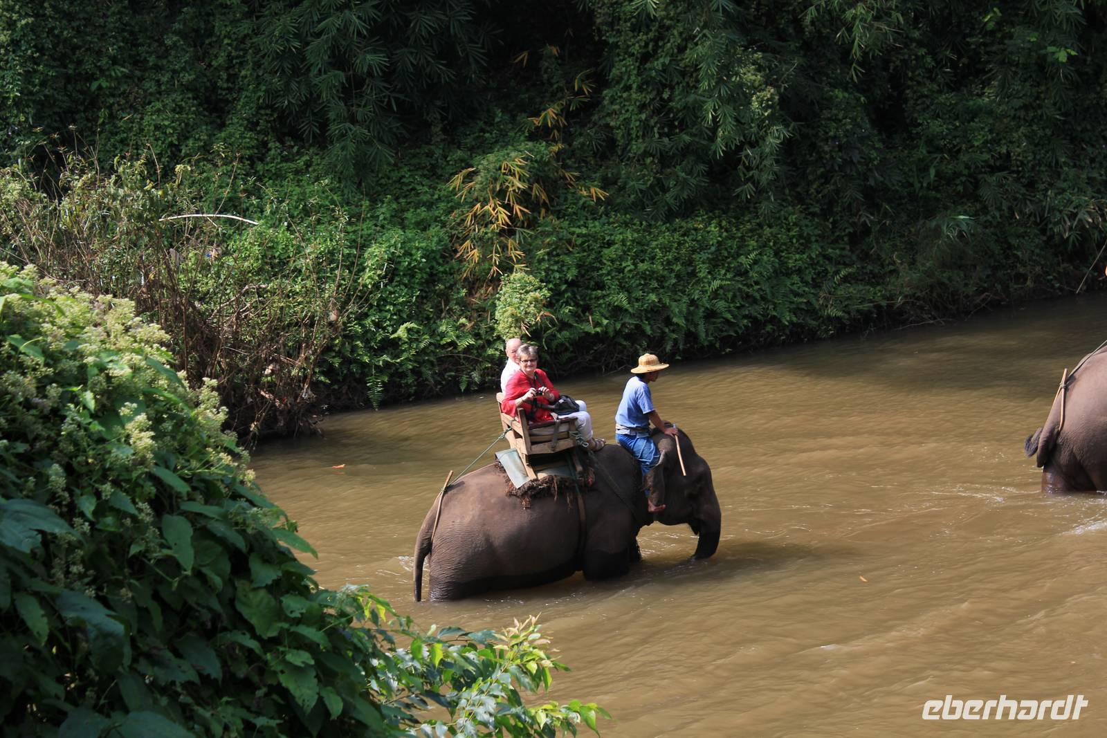 Schließlich geht es wesentlich spektakulärer weiter: Zeit für unseren Elefantenritt! Immer zu zweit besteigen wir die Holzbänkchen auf den Rücken der Dickhäuter, während vor uns der Mahout auf dem Kopf des Tieres sitzt und barfüßig den Weg geleitet. Wir schaukeln gemütlich über einen schmalen Dschungelpfad, dann das steile Ufer hinunter und hinein in den Fluss! Die großen Ohren schlackernd und den Rüssel immer wieder nach Grasbüscheln ausstreckend, tragen uns die freundlichen Wesen dahin und wir wollen am liebsten gar nicht wieder absteigen, sondern weiter bis nach Chiang Mai reiten.