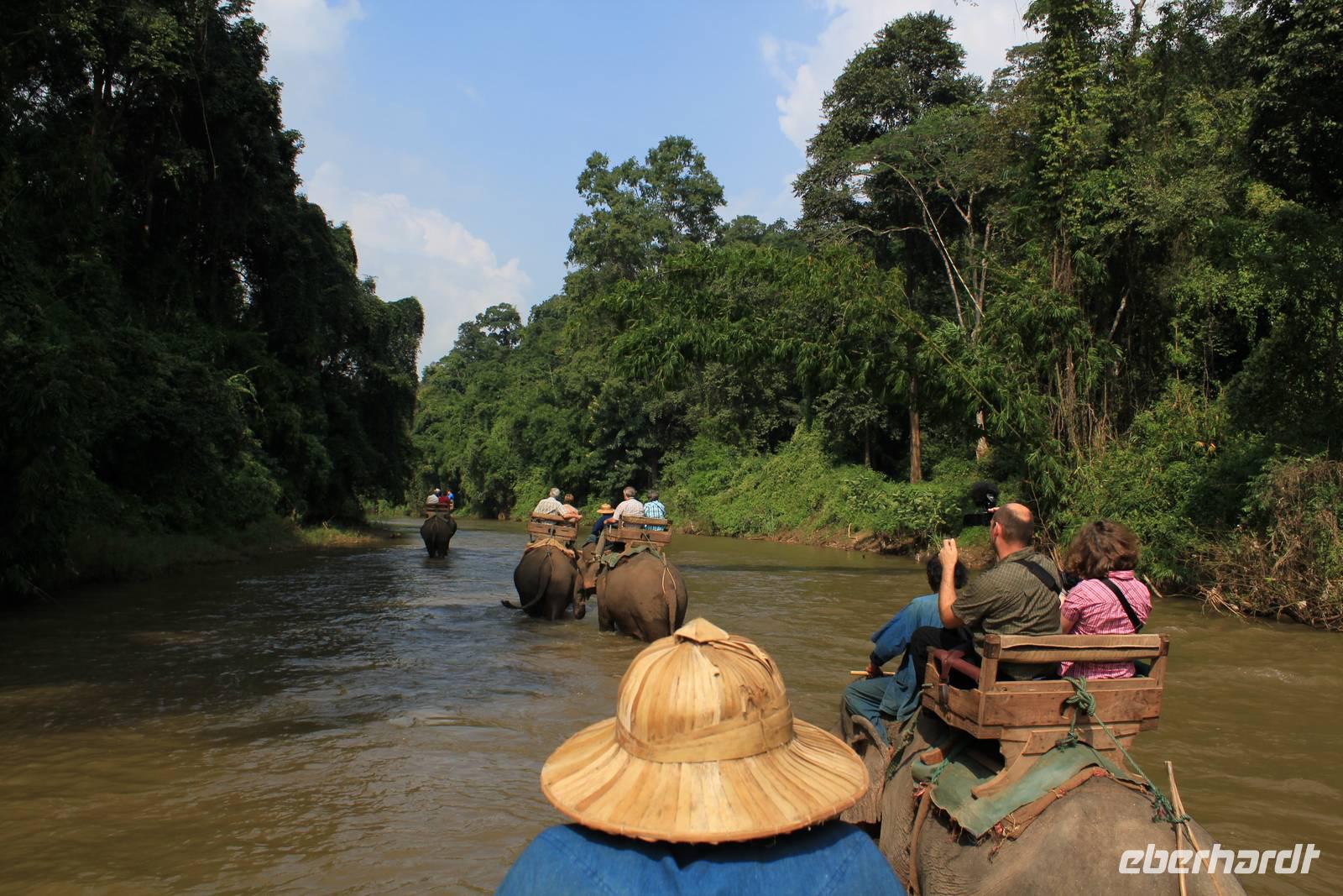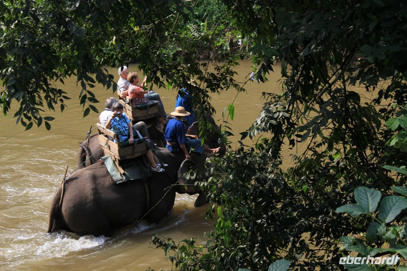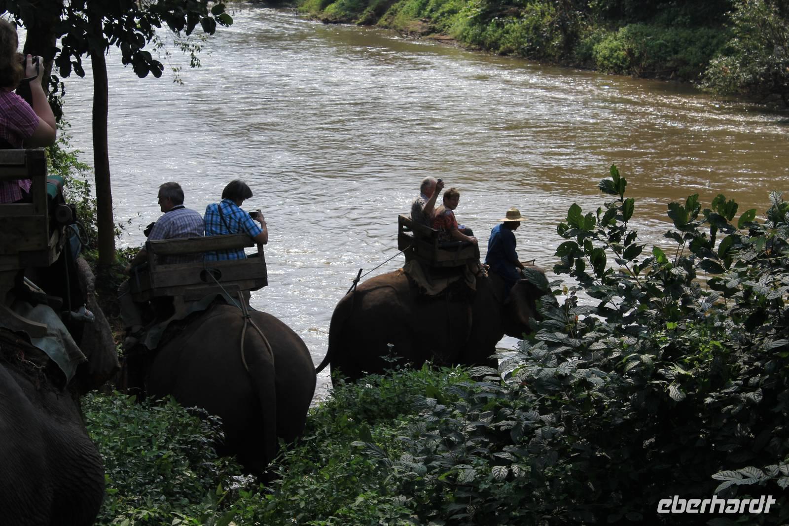 Schließlich geht es wesentlich spektakulärer weiter: Zeit für unseren Elefantenritt! Immer zu zweit besteigen wir die Holzbänkchen auf den Rücken der Dickhäuter, während vor uns der Mahout auf dem Kopf des Tieres sitzt und barfüßig den Weg geleitet. Wir schaukeln gemütlich über einen schmalen Dschungelpfad, dann das steile Ufer hinunter und hinein in den Fluss! Die großen Ohren schlackernd und den Rüssel immer wieder nach Grasbüscheln ausstreckend, tragen uns die freundlichen Wesen dahin und wir wollen am liebsten gar nicht wieder absteigen, sondern weiter bis nach Chiang Mai reiten.