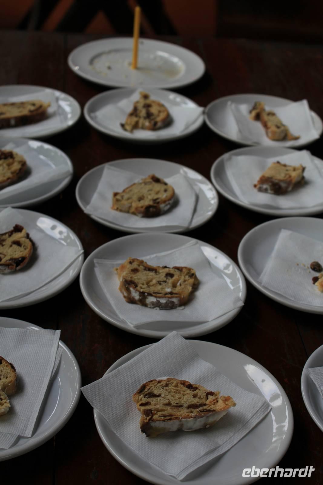 Da heute nicht irgendein Sonntag ist, sondern der 1. Advent, hält Elisa noch eine kleine Überraschung für uns bereit. Gemeinsam versetzen wir uns ein wenig in vorweihnachtliche Stimmung (was bei 27 Grad Außentemperatur, 80% Luftfeuchte und üppigem Grün gar nicht mal so leicht fällt) und zünden gemeinsam ein kleines Kerzlein ein. Echter Christstollen darf am 1. Advent auch nicht fehlen und *zack* da ist er auch schon und wir lassen uns Rosinen, Nelkengewürz und Puderzucker auf der Zunge zergehen... Mmmhh... Doch nun „zurück" nach Thailand und die nächsten erlebnisreichen Tage genießen!