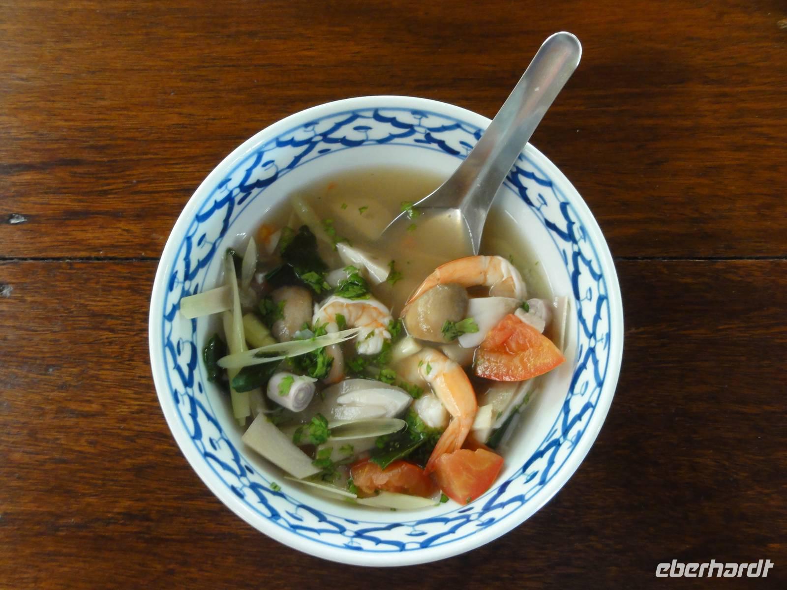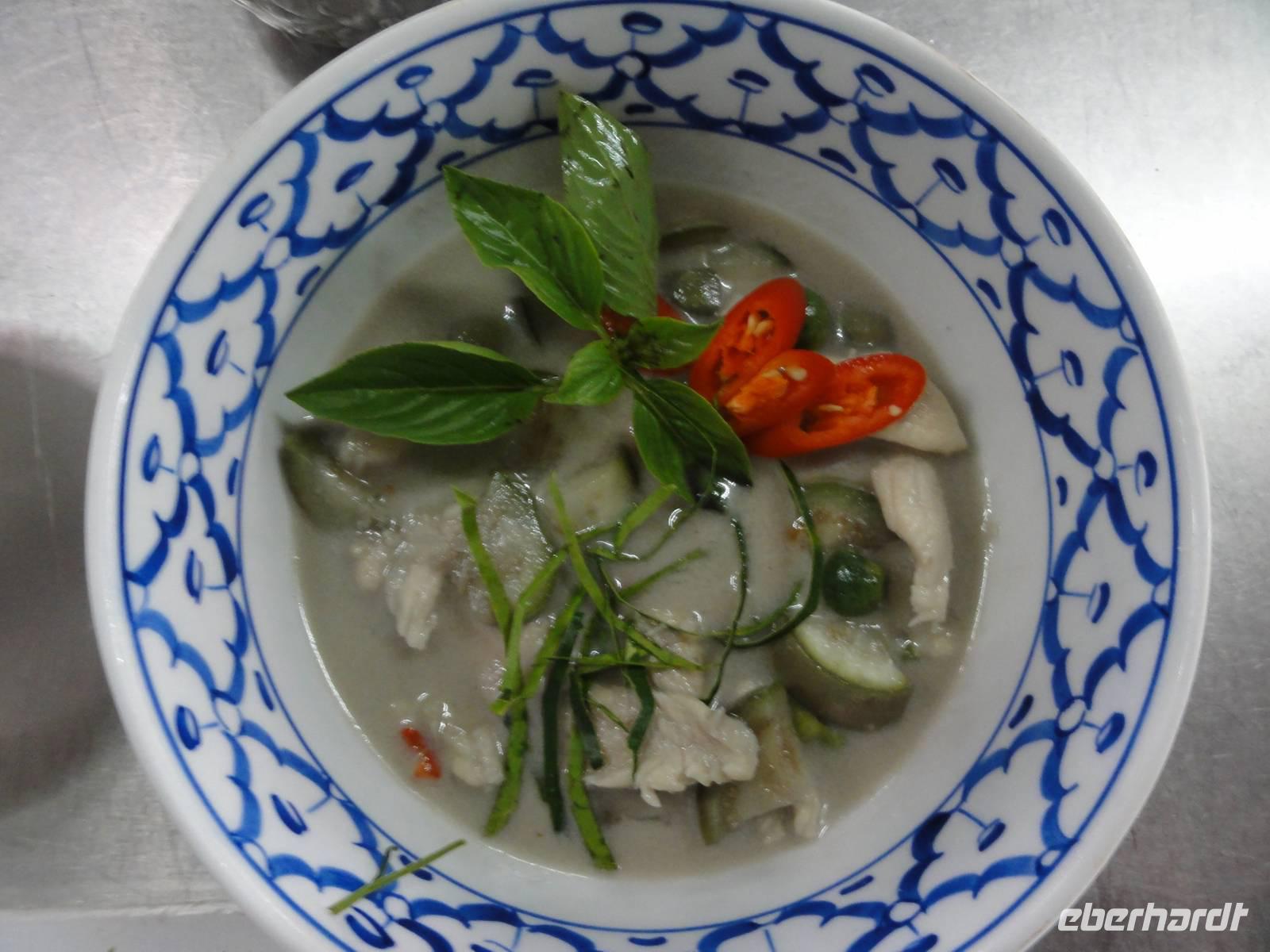 Mit der thailändischen Küche, der man nachsagt eine der besten und gesündesten der Welt zu sein, sind wir ja inzwischen schon vertraut. So wird es höchste Zeit unser „Wissen & Können" auf die nächste Stufe zu heben und selbst anzupacken! So führt uns die Fahrt heute zum Markt, wo wir auf unseren Kochlehrer stoßen, der uns „an die Hand nimmt" (Elisa zumindest) und sehr anschaulich durch die Marktreihen führt, um uns die Zutaten für unseren heutigen thailändischen Kochkurs zu zeigen und zu erläutern. Von Kokosraspeln über Reisnudeln und verschiedenste Gewürze bis hin zu fremden Pilzen, komisch geformten Auberginen und gewöhnungsbedürftigen Tofu ist alles dabei! Theoretisch wissen wir als schon Bescheid, dann kann es also weiter gehen in die Meisterkochschule. In herrlichem Ambiente, warten hier im Freien schon unsere Kochstellen auf uns! Jeder einzelne wird mit einer schmeichelnden Küchenschürze ausgestattet und macht sich mit seinem Arbeitsplatz und dem Werkzeug vertraut! 4 Gerichte stehen auf dem Speiseplan und mit dem Wissen, dass wir alles auch selbst essen müssen, zittern dem einen oder anderen doch schon etwas die Knie. Vor jedem Gang bekommen wir diesen im Schulungsraum vorgekocht und müssen gut aufpassen! Und dann: auf die Woks, fertig, los! Wir schnibbeln, rühren, mischen (und schimpfen ein bisschen) was das Zeug hält, haben aber jede Menge Spaß! Das Menü: als Vorspeise gibt es eine traditionelle Suppe mit exotischem Gemüse und Shrimps - „Tom Yan Goong", es folgt ein grünes Curry mit Hühnchen und gebratene Nudeln - Phad Thai und dem krönenden Abschluss liefert der warme gedämpfte Bananenkuchen. Klingt lecker? Ob es das auch ist liegt in unseren eigenen Händen! Wir lassen es uns schmecken und ein bisschen stolz können wir auch sein! Zum Abschied erhalten wir selbstverständlich noch offiziell unser Zertifikat in Form eines Kochbuches zum Nachkochen zu Hause. Die Weihnachtsgans kann dieses Jahr also wegfallen!