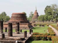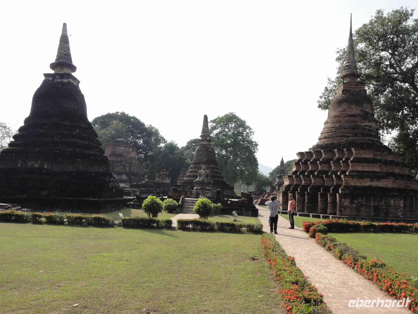 Eine sehr lange Fahrt von knapp 400 km liegt heute vor uns und so starten wir um 8 Uhr in Richtung Sukhothai. Langsam verändert sich die Landschaft, die dicht bewaldeten Hügel gehen in ebene Reisfelder über. 2 „Hasen jagen"- und „Blumen pflücken"-Pausen und eine Mittagspause später erreichen wir endlich unser Ziel. Sukhothai war die allererste Hauptstadt Thailands und 140 Jahre lang Mittelpunkt eines bedeutenden Königreichs. Wir schreiben das 13. und später 14. Jahrhundert als einer der 14 Könige, die das Reich während der Sukhothaiperiode regierten, das thailändische Alphabet erfand. Schließlich musste Sukhothai im Jahre 1378 an das Königreich Ayutthaya abgetreten werden. Nach einer schier endlos langen Zeit der Ruhe und des Vergessens wurde die verfallene Stadt schließlich wieder ausgegraben und teilweise rekonstruiert. Seit 1978 gehört das kunsthistorische Zentrum Sukhothai zum UNESCO Weltkulturerbe.