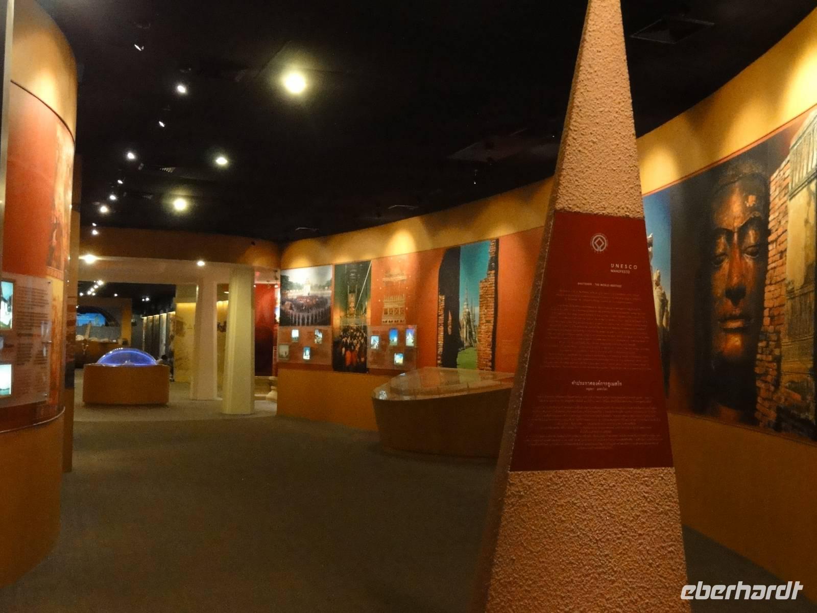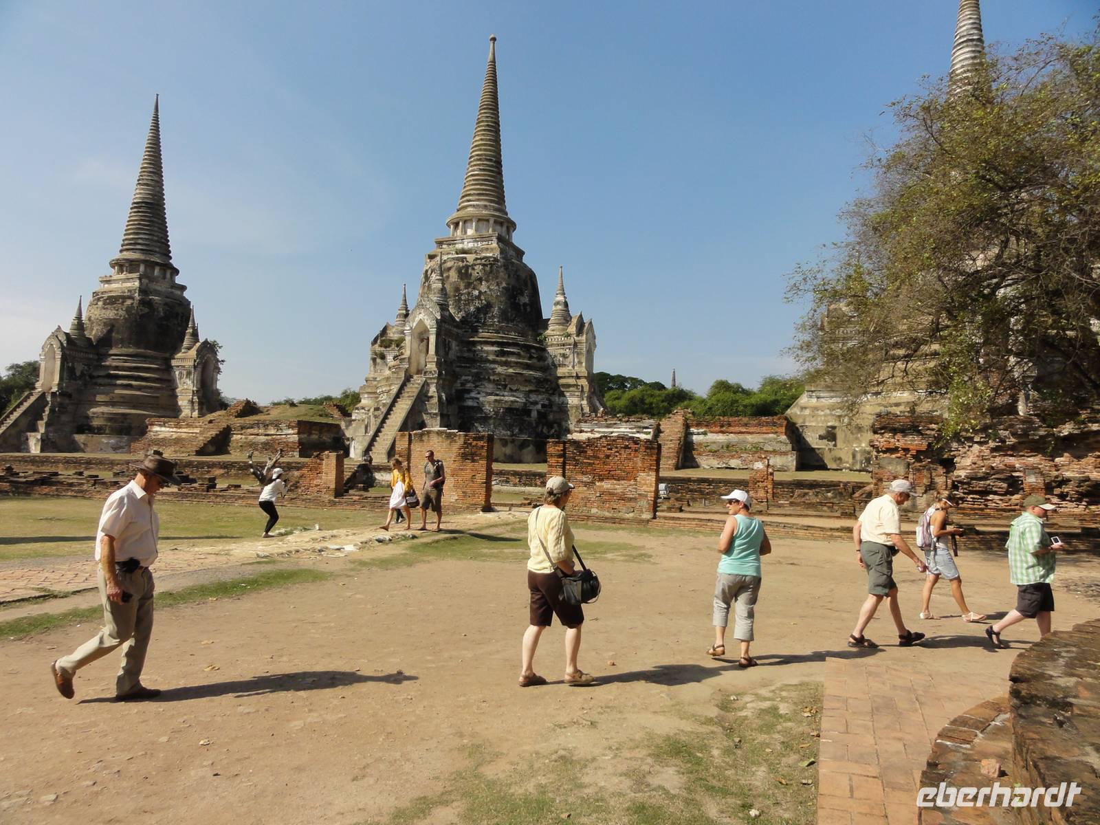 Nach unserer Mittagspause in einem Restaurant mit Blick über den Fluss Chaopraya erreichen wir zunächst das Kulturzentrum von Ayutthaya, indem wir uns einen Film über den historischen Schauplatz anschauen. Das kulturelle und historische Heiligtum ist heutzutage eine der eindrucksvollsten Ruinenstätte Asiens, in der weiten Ebene des Menam Chao Phraya an einer Flussschleife gelegen. Im Jahre 1350 von König U Thong zu seinem eigenen Staat ausgerufen, war Ayutthaya bis 1767 Hauptstadt des Königreichs Siam und die zweite überhaupt in der Landesgeschichte. Das Zeitalter war bestimmt von 33 Königen und wurde weltbekannt als blühendes Kulturzentrum und wichtiger Handelsplatz auch für europäische Handelshäuser. Nach 417 Jahren haben die Birmamen Ayutthaya dem Erdboden gleichgemacht, was den temporären Niedergang der siamesischen Monarchie bedeutete. In 15 Jahren der Besetzung durch die Birmanen, die wie die Vandalen wütenden, blieb nix verschont, kein Tempel, kein Königspalast und tausenden Buddha-Figuren wurden die Köpfe abgeschlagen als Zeichen der Beraubung ihrer Seelen.