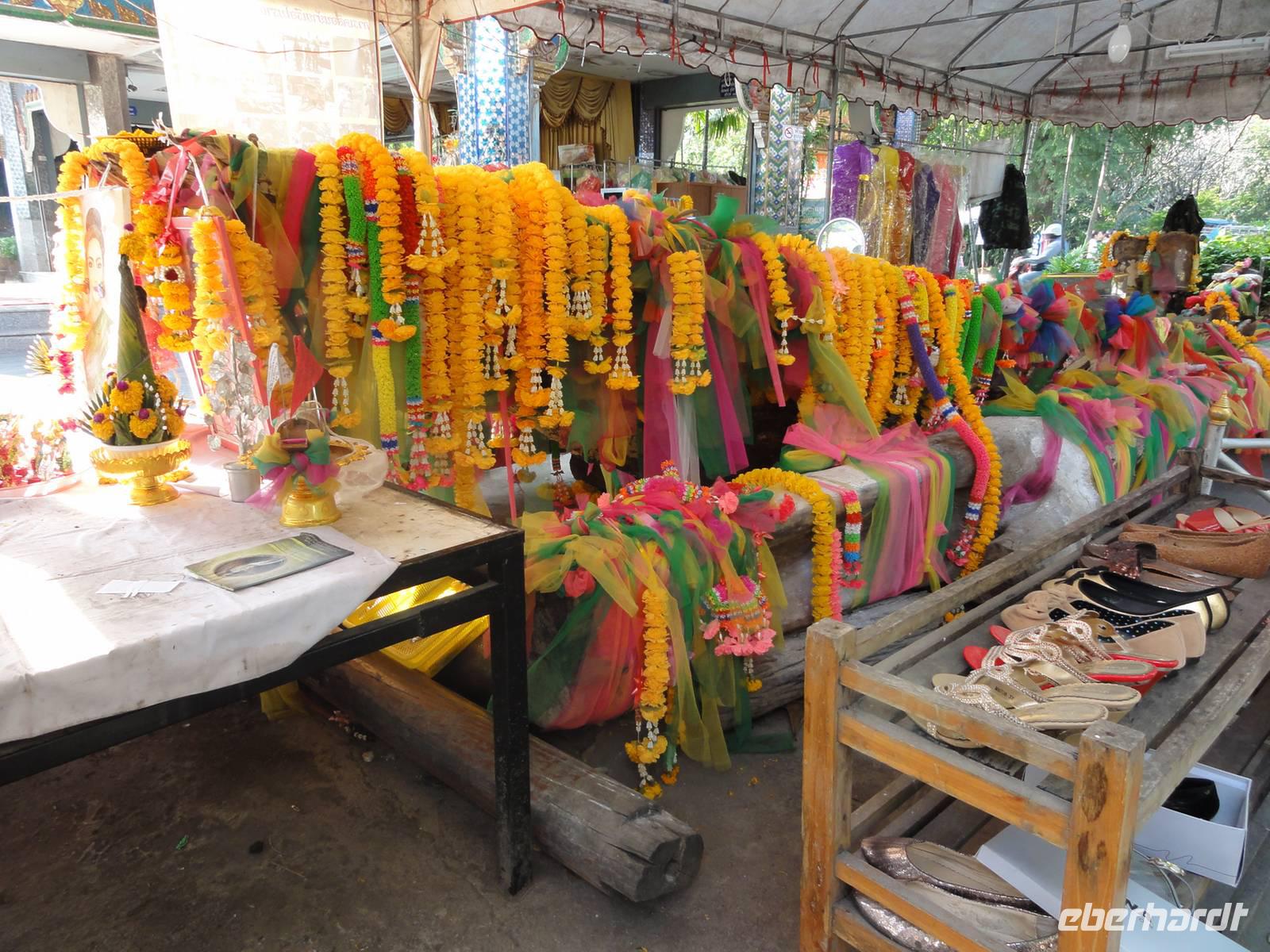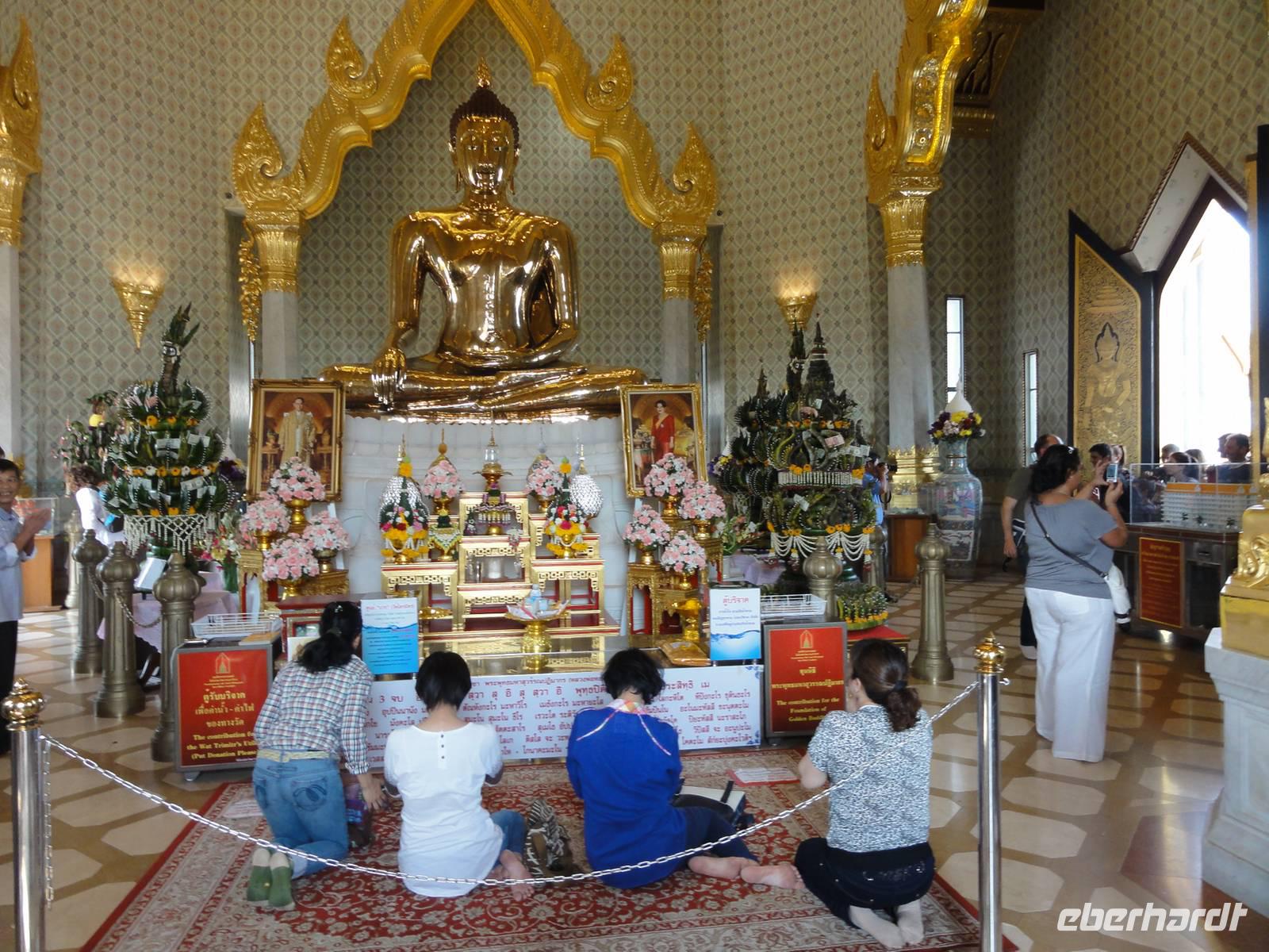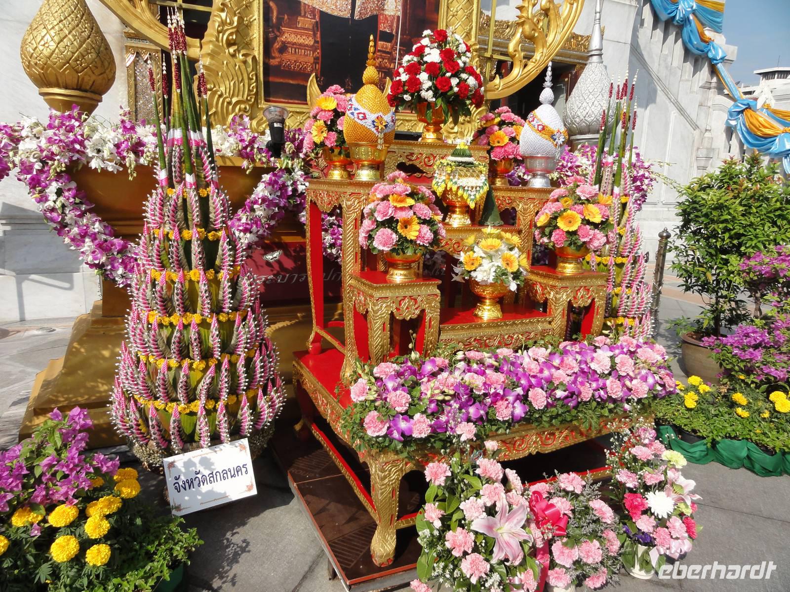 Unseren ersten Besuch widmen wir dem Wat Traimitr, oder „Tempel des Goldenen Buddhas". Höhepunkt der herrlichen spitz zulaufenden, weißen Tempelanlage ist wie der Name schon sagt, die 3,5 Meter hohe Buddha-Figur, die aus 5,5 Tonnen massivem Gold gegossen wurde! Wo das Prunkstück herkommt ist bis heute unklar, hindert uns aber nicht daran uns an der beeindruckenden Figur zu erfreuen. Den Tempel umgibt noch der Glanz der gestrigen Feierlichkeiten. Gelb-Blaue Tücher zieren die Geländer und kunstvoll geformte Blumenpyramiden aus gedrehten Palmenblättern, Nelken und anderem Blumenschmuck verschönern das Innere und Äußere des Tempels.