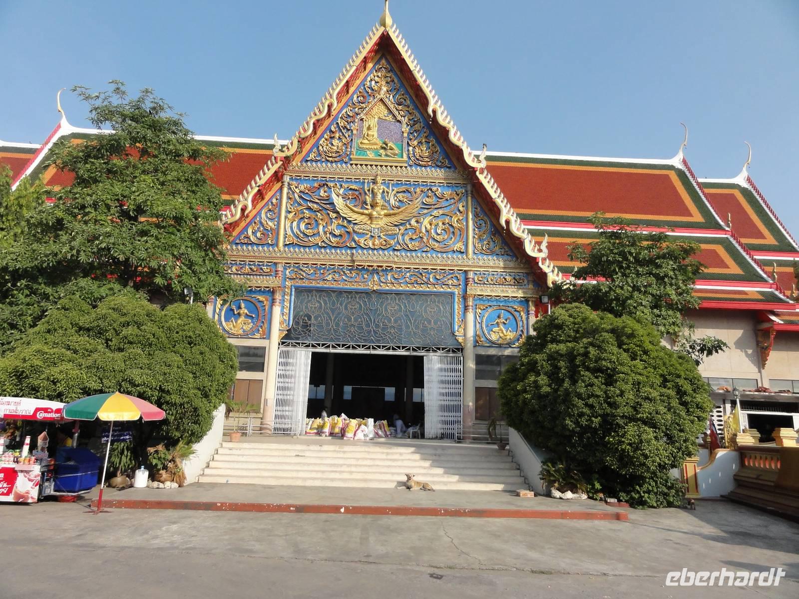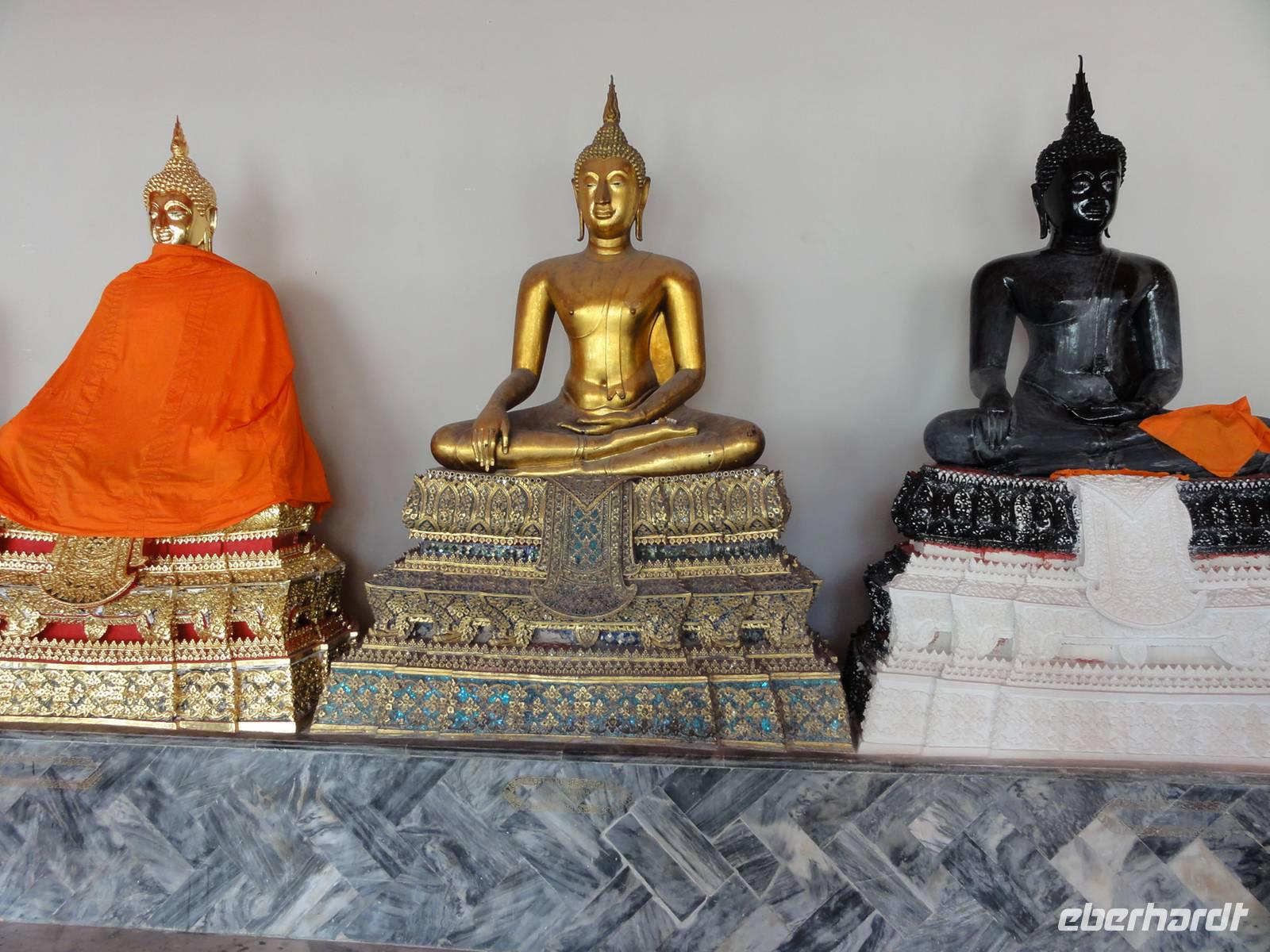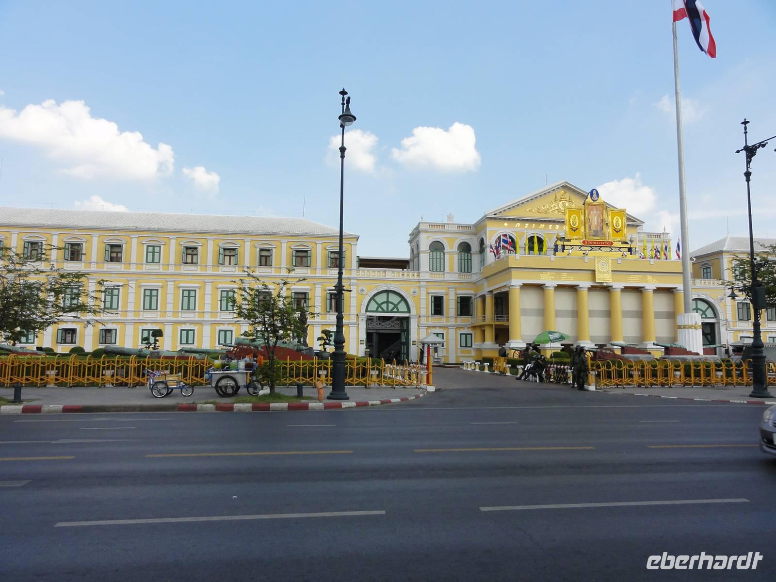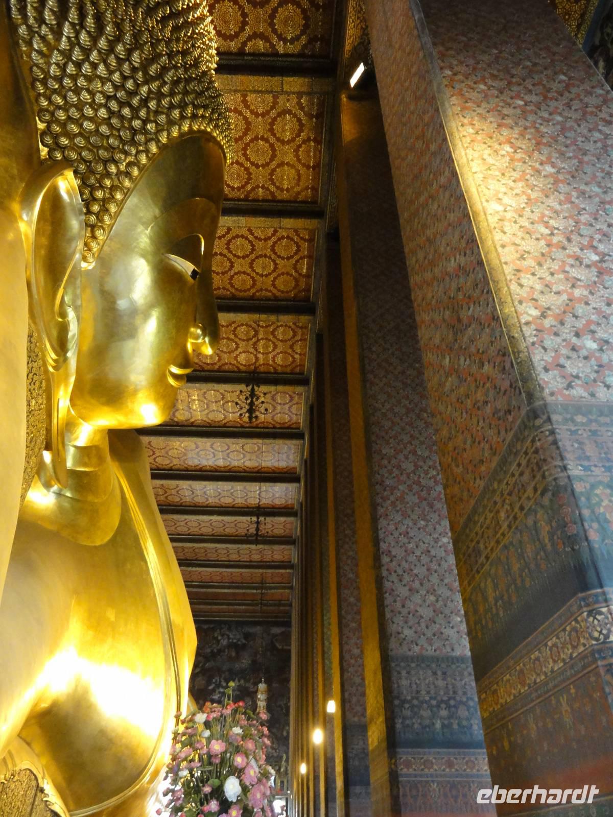 Unseren ersten Besuch widmen wir dem Wat Traimitr, oder „Tempel des Goldenen Buddhas". Höhepunkt der herrlichen spitz zulaufenden, weißen Tempelanlage ist wie der Name schon sagt, die 3,5 Meter hohe Buddha-Figur, die aus 5,5 Tonnen massivem Gold gegossen wurde! Wo das Prunkstück herkommt ist bis heute unklar, hindert uns aber nicht daran uns an der beeindruckenden Figur zu erfreuen. Den Tempel umgibt noch der Glanz der gestrigen Feierlichkeiten. Gelb-Blaue Tücher zieren die Geländer und kunstvoll geformte Blumenpyramiden aus gedrehten Palmenblättern, Nelken und anderem Blumenschmuck verschönern das Innere und Äußere des Tempels.