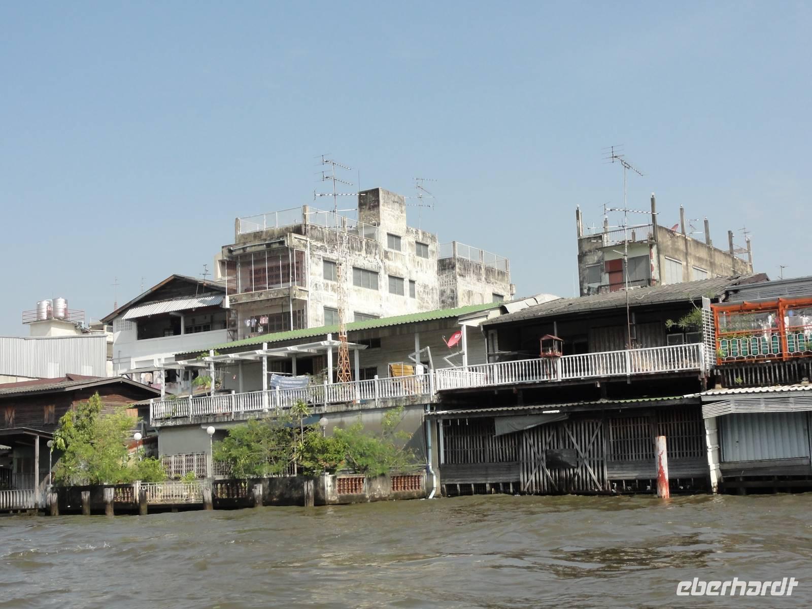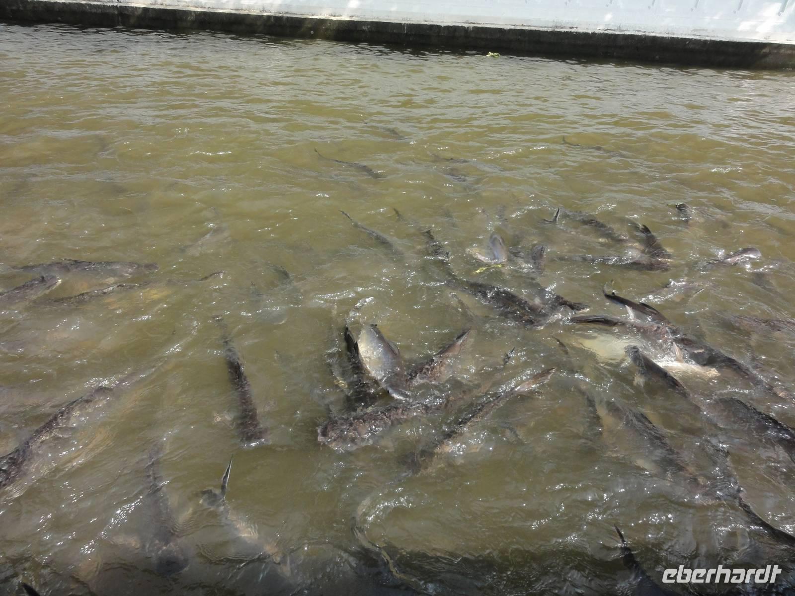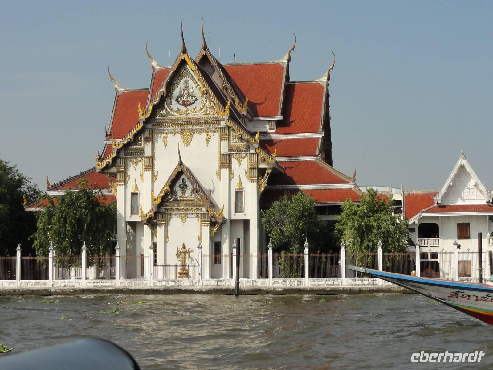 Um 10 Uhr finden wir uns am Ufer des Chao Phraya Flusses ein, um eine erfrischende Bootstour zu unternehmen. Rauschend passieren wir einige der ca. 400 Tempel Bangkoks, die herrlich am Wasser liegen. Auch erhalten wir einen Einblick in die kargen Wohnverhältnisse der Menschen, die ihre hölzernen „Behausungen" teilweise auf Stelzen fast in den Fluss hinein gebaut haben. Noch eben ein paar Welse mit Weißbrot gefüttert (tja, das nächste Mal essen wir EUCH dann wieder...) und zurück geht die Fahrt, bei der wir uns die herrliche Brise um die Nasen wehen lassen.