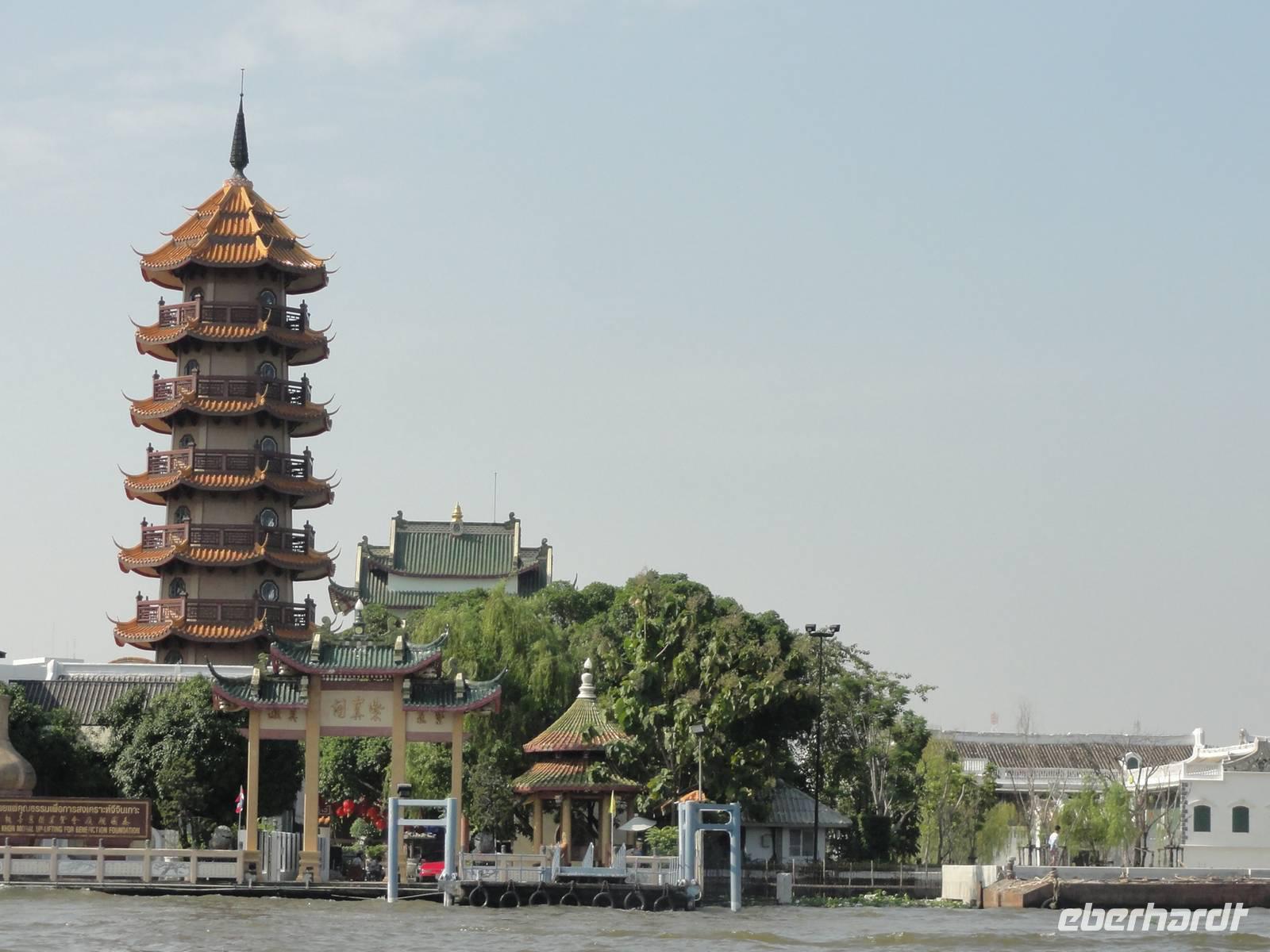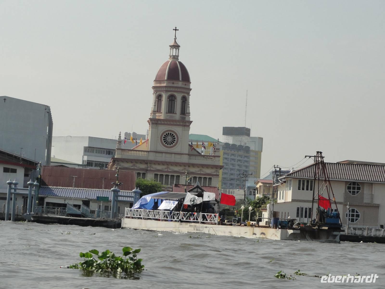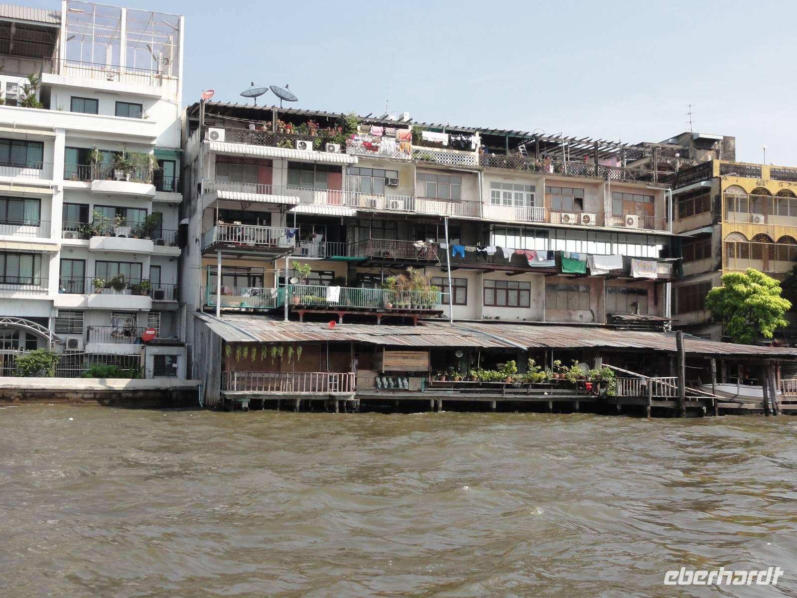 Um 10 Uhr finden wir uns am Ufer des Chao Phraya Flusses ein, um eine erfrischende Bootstour zu unternehmen. Rauschend passieren wir einige der ca. 400 Tempel Bangkoks, die herrlich am Wasser liegen. Auch erhalten wir einen Einblick in die kargen Wohnverhältnisse der Menschen, die ihre hölzernen „Behausungen" teilweise auf Stelzen fast in den Fluss hinein gebaut haben. Noch eben ein paar Welse mit Weißbrot gefüttert (tja, das nächste Mal essen wir EUCH dann wieder...) und zurück geht die Fahrt, bei der wir uns die herrliche Brise um die Nasen wehen lassen.