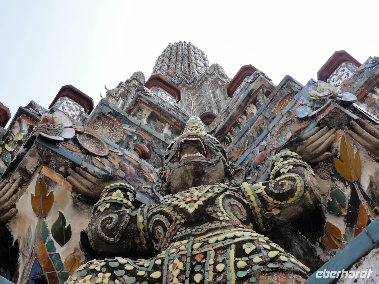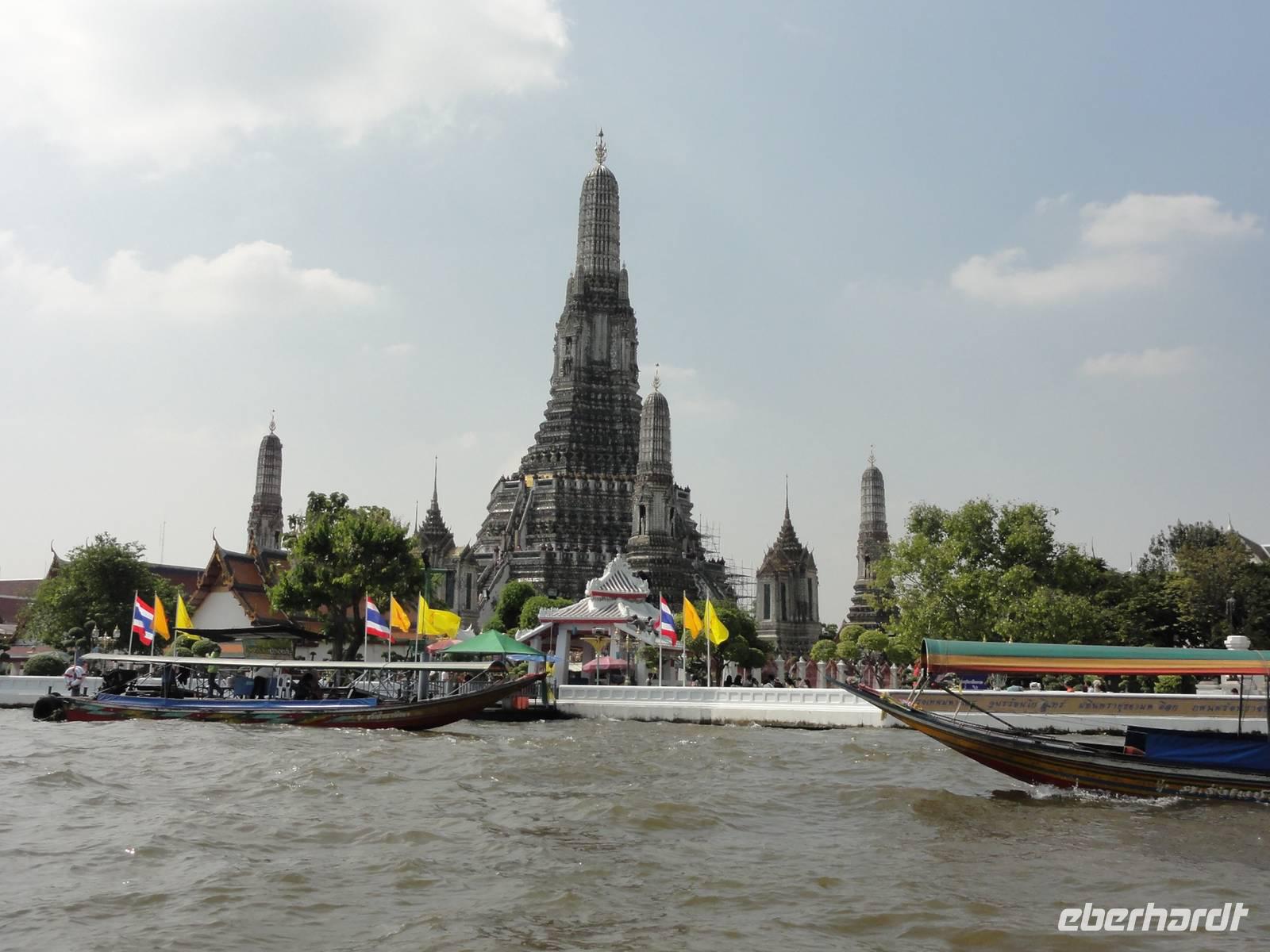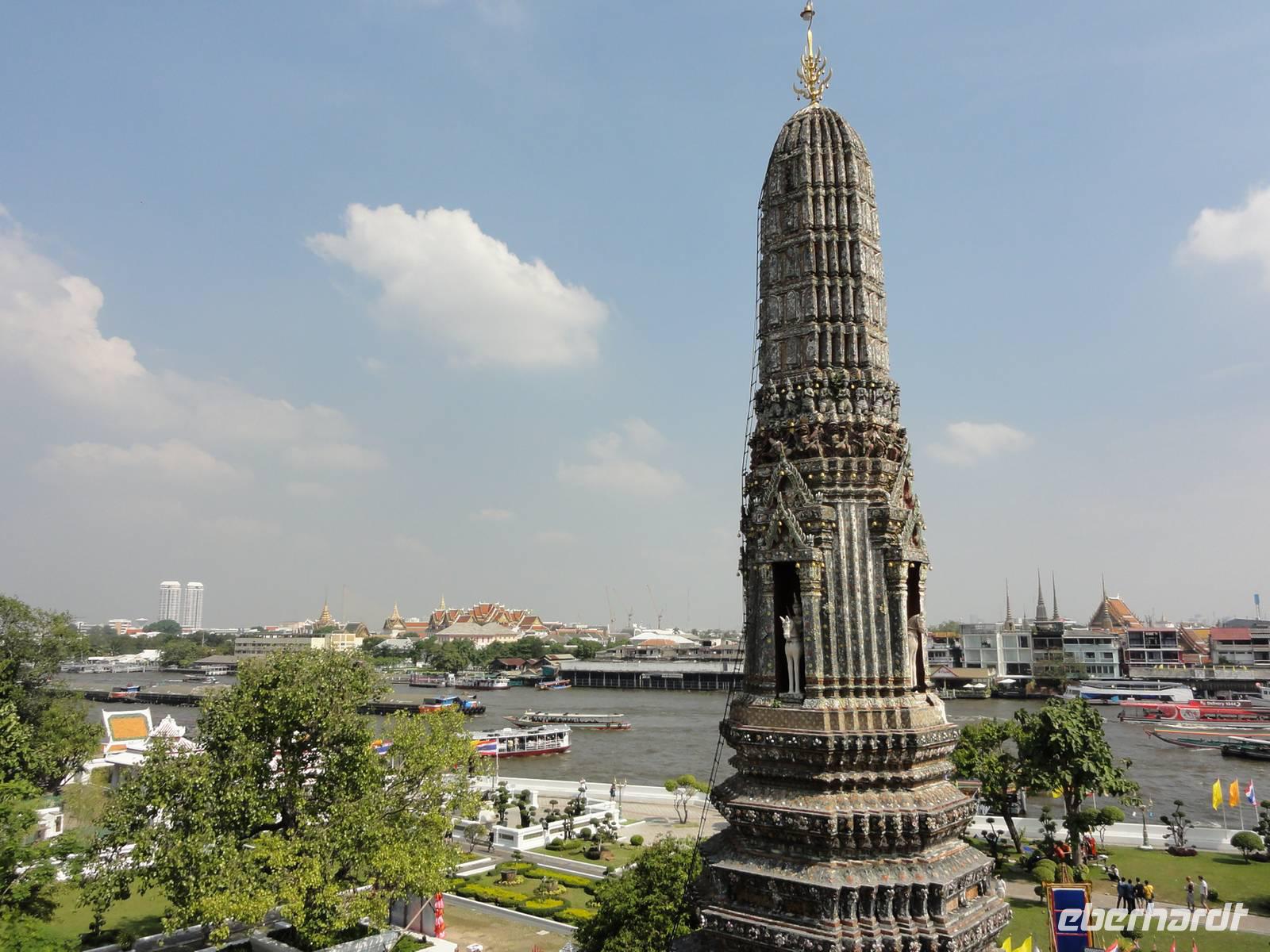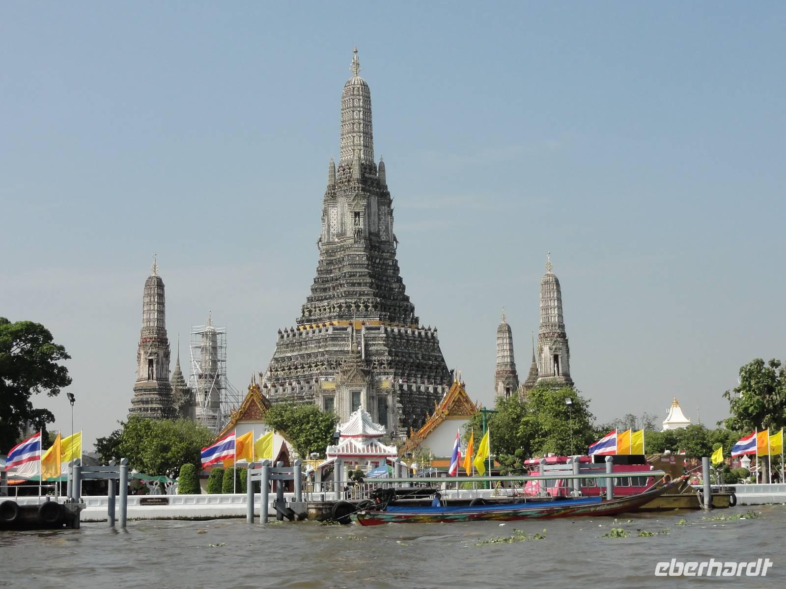 Unser nächster Besuch gilt dem höchst eindrucksvollen Wat Arun („Tempel der Morgenröte"), der bereits von weiten mit seinem 86 Meter hohen Prang, der mit unzähligen Porzellanstücken verziert ist, unsere Blicke einfängt. Nach dem Untergang Ayutthayas marschierte der letzte General mit seinem Gefolge so lange „bis die Sonne wieder aufgeht", um dort einen neuen Tempel zu errichten. An besagter Stelle finden wir heute das im Khmer-Stil mit thailändischen Einflüssen errichtete Prachtstück. Sowohl buddhistische als auch hinduistische Merkmale weist der Tempel auf. Mühsam bewältigen einige von uns die riesigen, steil nach oben führenden Stufen auf den Tempel hinauf, doch es lohnt sich: ein ausgezeichneter Blick über die Stadt, den Fluss und die geschmückten Straßen bietet sich uns.