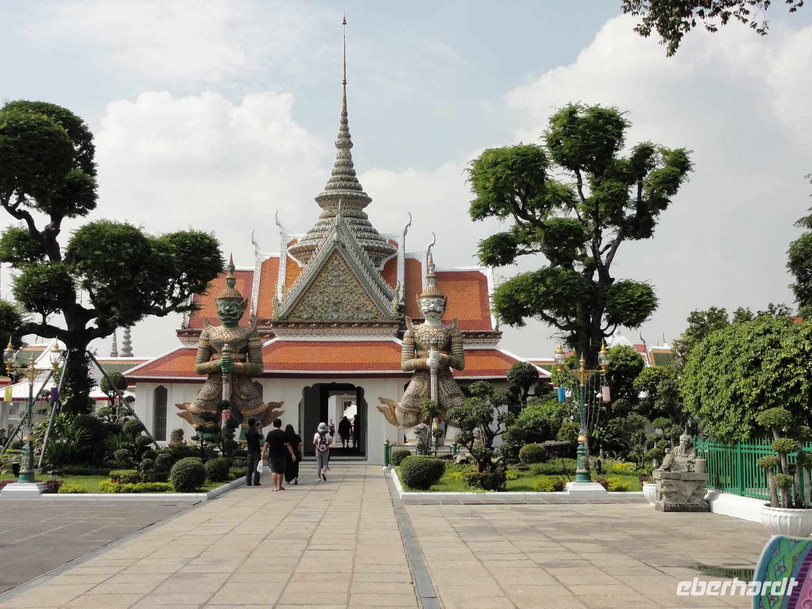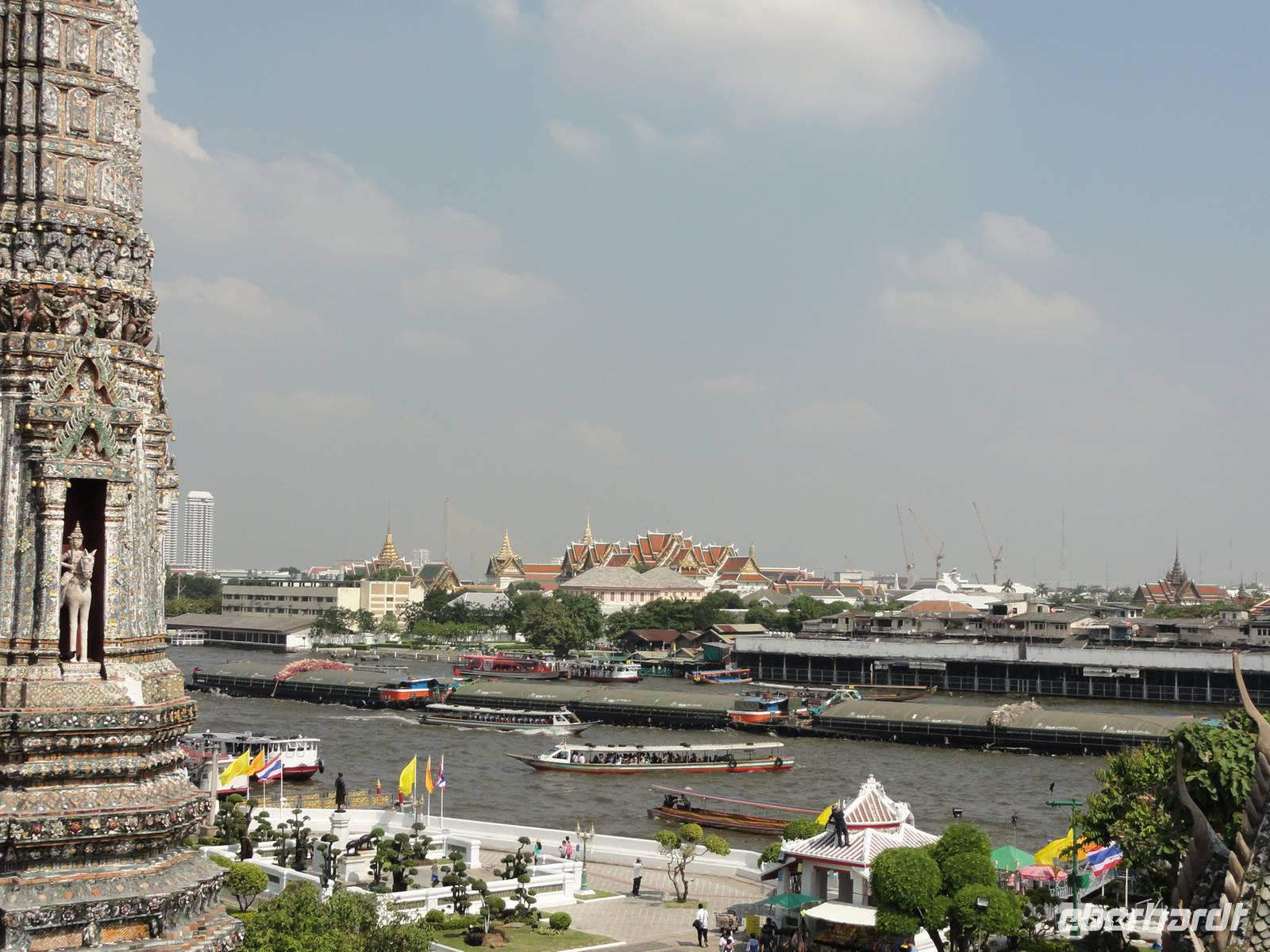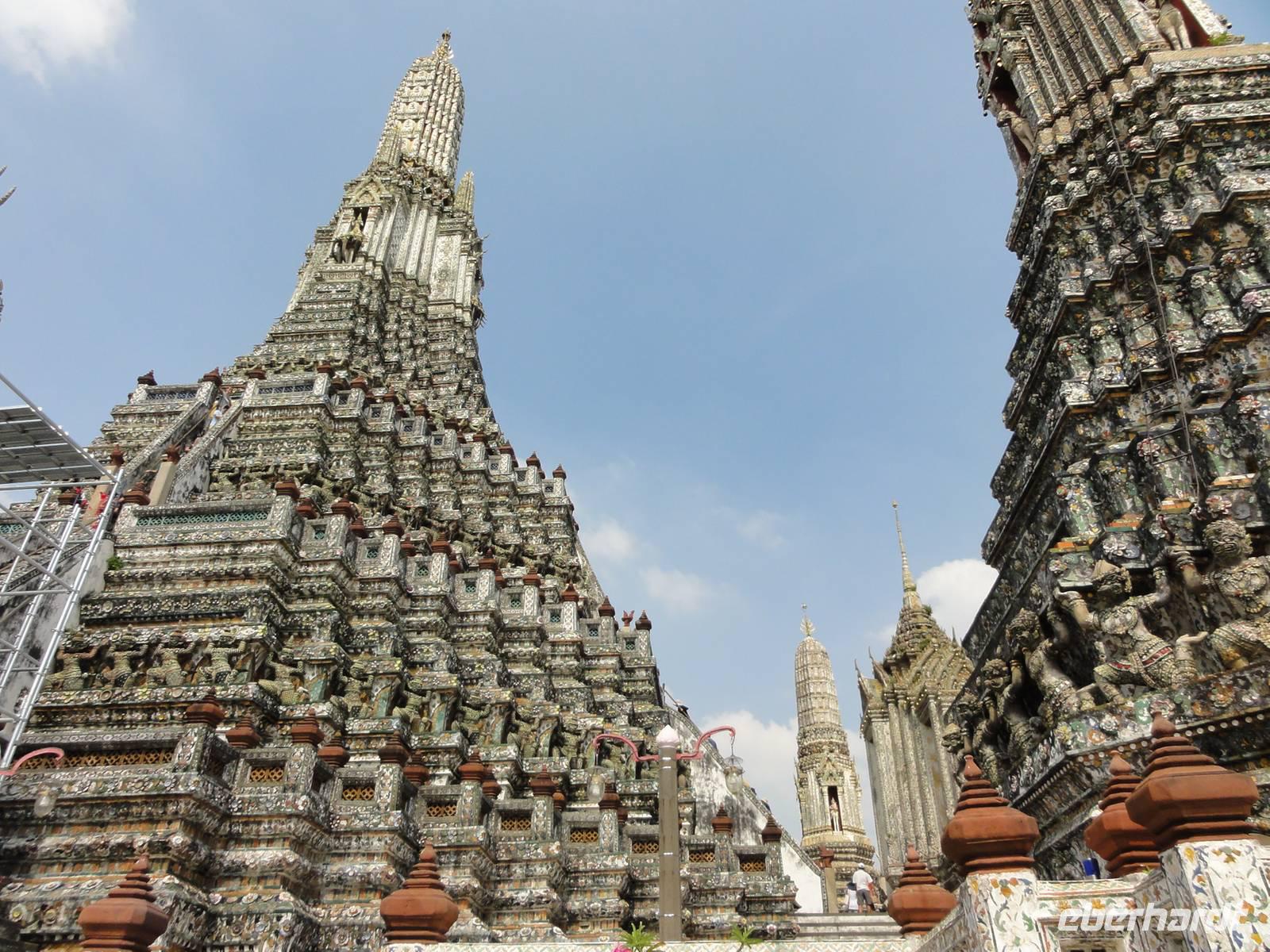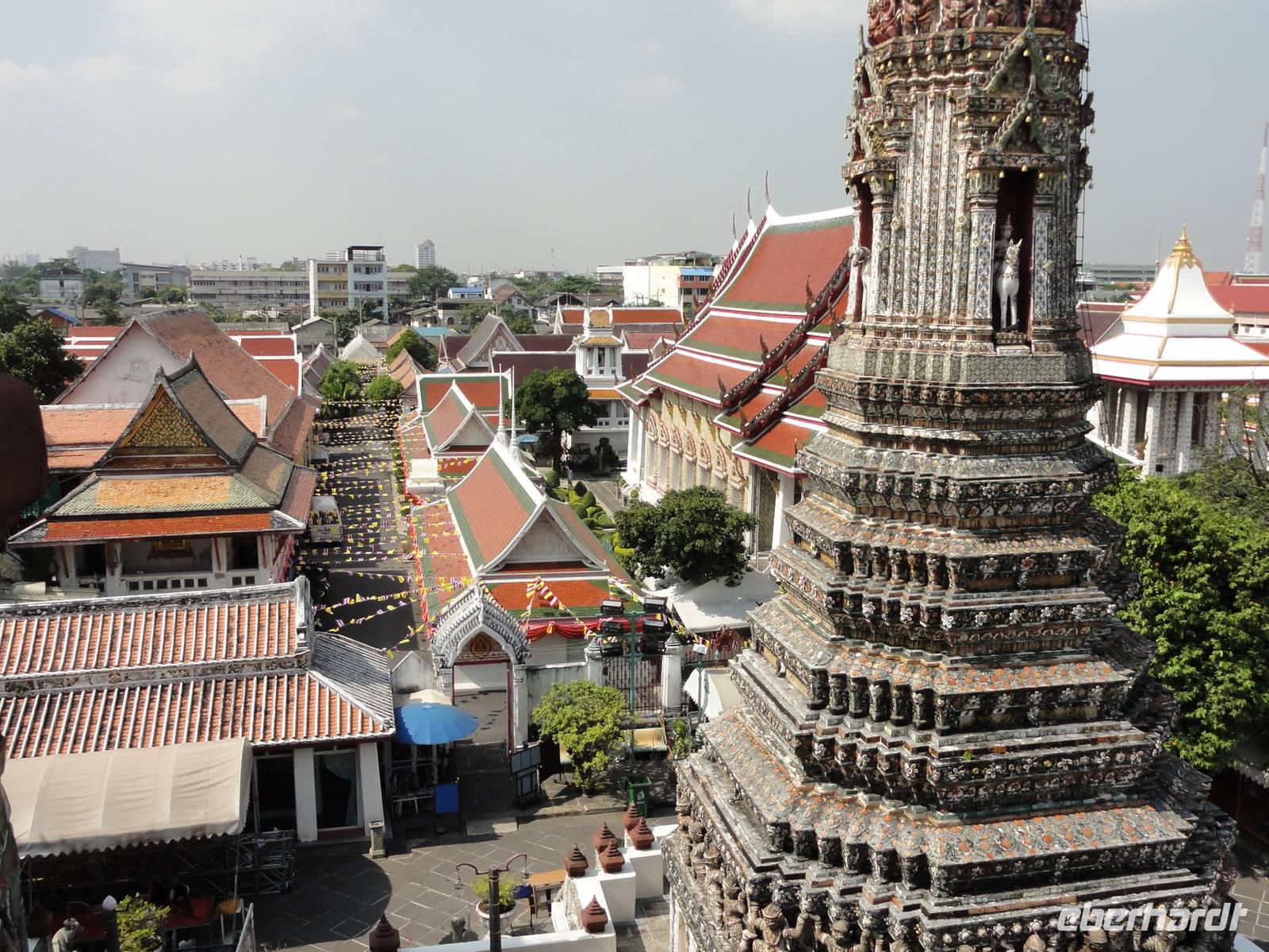 Unser nächster Besuch gilt dem höchst eindrucksvollen Wat Arun („Tempel der Morgenröte"), der bereits von weiten mit seinem 86 Meter hohen Prang, der mit unzähligen Porzellanstücken verziert ist, unsere Blicke einfängt. Nach dem Untergang Ayutthayas marschierte der letzte General mit seinem Gefolge so lange „bis die Sonne wieder aufgeht", um dort einen neuen Tempel zu errichten. An besagter Stelle finden wir heute das im Khmer-Stil mit thailändischen Einflüssen errichtete Prachtstück. Sowohl buddhistische als auch hinduistische Merkmale weist der Tempel auf. Mühsam bewältigen einige von uns die riesigen, steil nach oben führenden Stufen auf den Tempel hinauf, doch es lohnt sich: ein ausgezeichneter Blick über die Stadt, den Fluss und die geschmückten Straßen bietet sich uns.