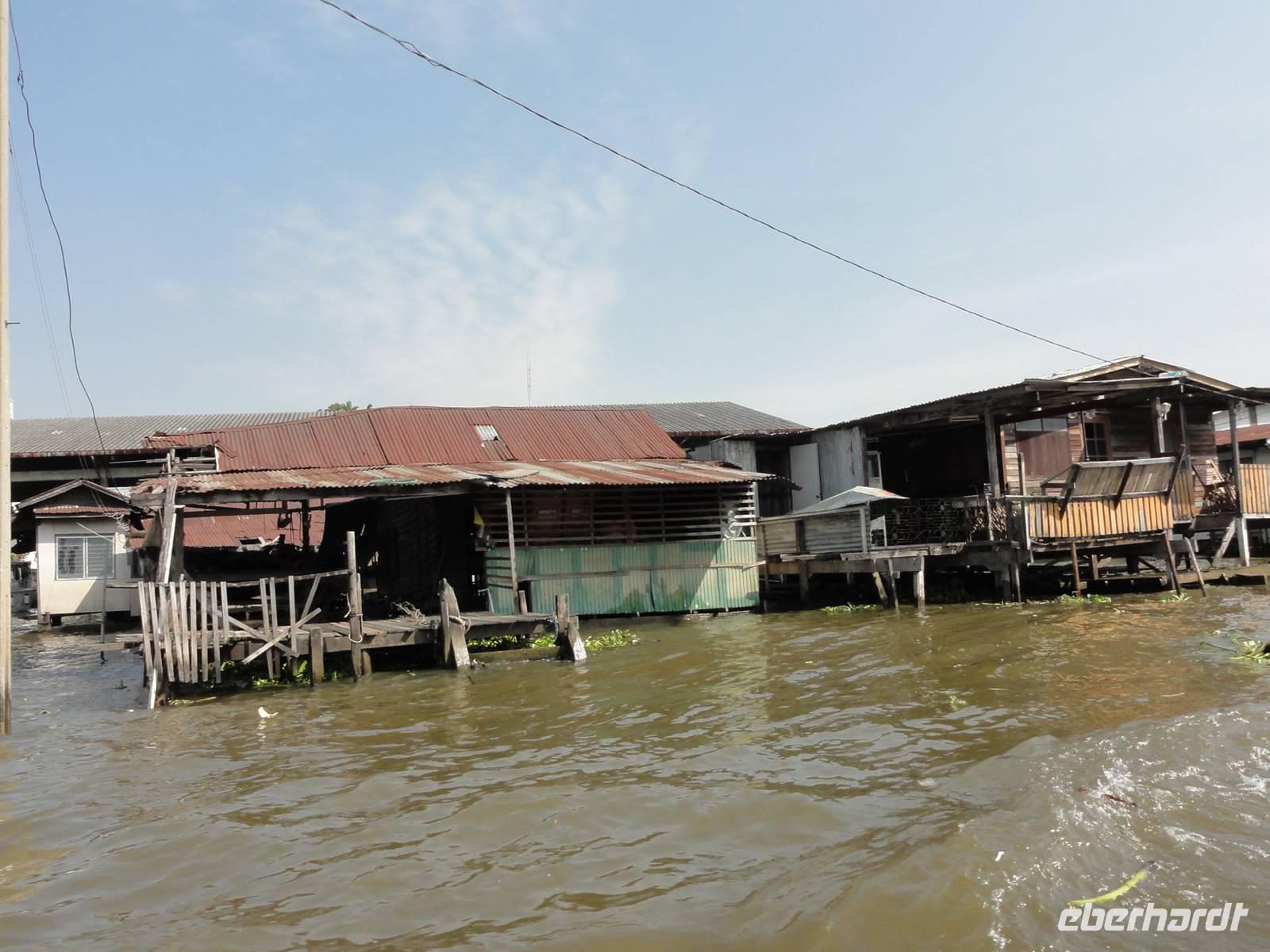 Nach etwas Zeit für einen Bummel durch das Getümmel treten wir die Rückfahrt nach Bangkok an und sehen unterwegs auch die zahlreichen Slums am Stadtrand der Metropole. Die teilweise menschenunwürdig wirkenden Behausungen sind mit einfachen Wellblechdächern gedeckt und massenweise Müllberge rücken immer wieder in unser Blickfeld. Im Hintergrund sind die millionenschweren Wolkenkratzer der Stadt unübersehbar. Uns wird zunehmend klar, dass wir es hier mit einer Weltstadt zu tun haben, die modern, fortschrittlich und innovativ zu sein versucht, tatsächlich aber noch meilenwert davon entfernt ist. Eine Weltstadt, die das Abwasser von 10 Millionen Menschen ohne Kläranlage in einen einzigen Fluss leitet und gleichzeitig massivgoldene Buddhas in prunkvollen Tempeln beherbergt. Eine Stadt in der es keine Mittelschicht zwischen arm und reicht gibt. Hypermodern, traditionsbewusst und „ursprünglich" im negativen Sinne zugleich.
