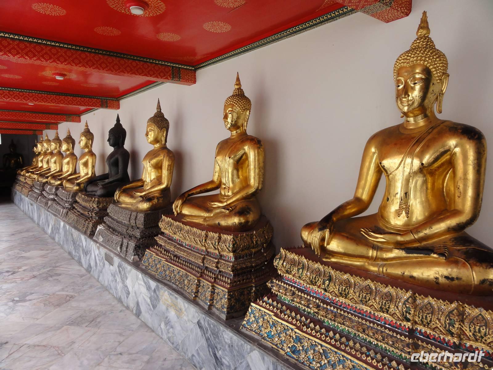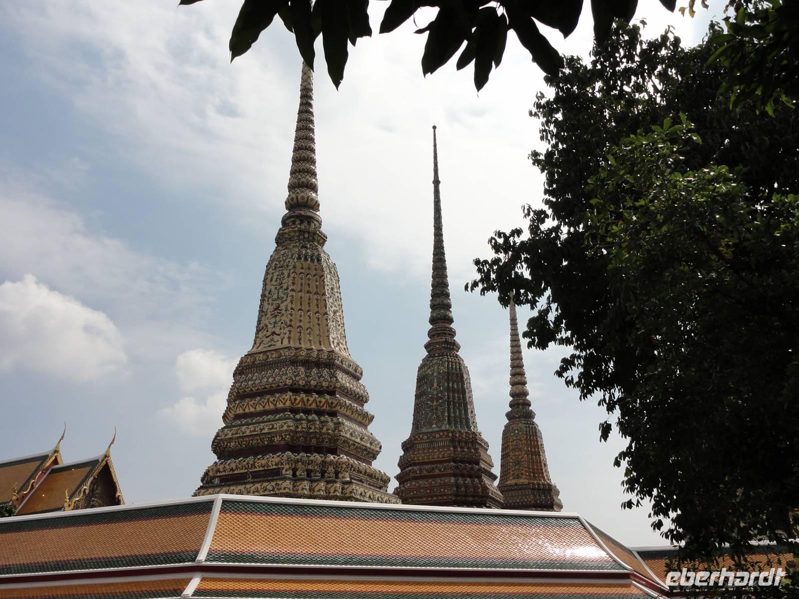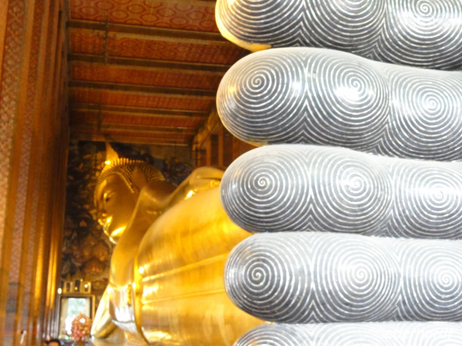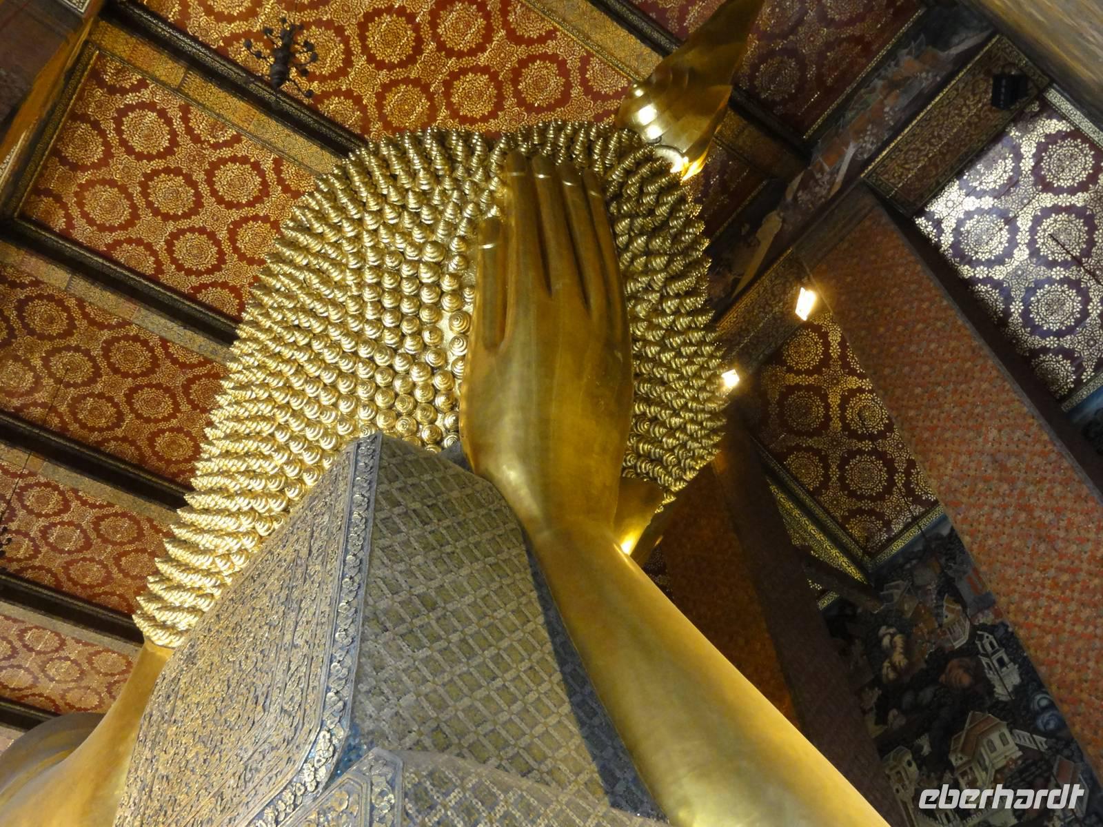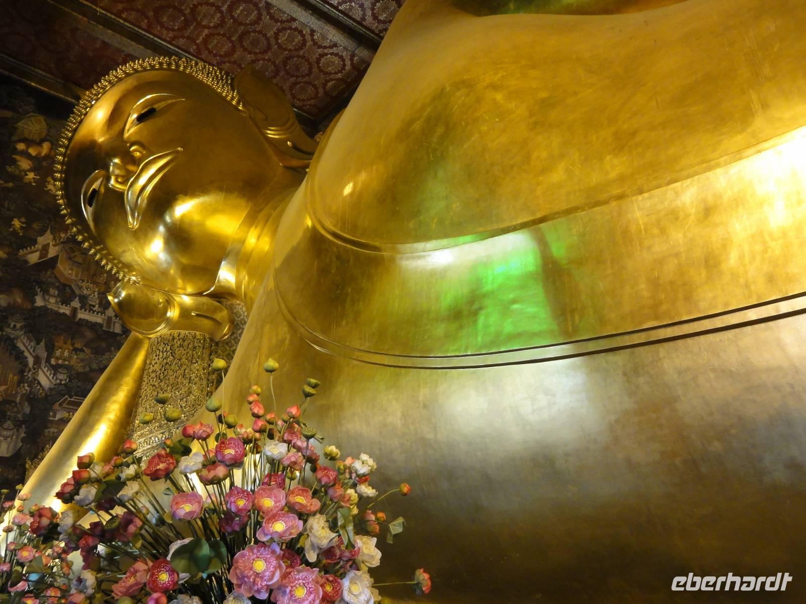 Mit der Fähre setzen wir auf die andere Seite des Flusses über, erfrischen uns kurz mit ein wenig Ananas und schon steht der nächste Tempel an: der Wat Pho ist der älteste und größte Tempel der Stadt und sogar Sitz einer weltbekannten Schule für die Kunst der Fußreflexzonen-Massage. Insgesamt 91 Prangs und Chedis befinden sich in der weitläufigen Anlage, eines prunkvoller und glitzernder als das nächste. Wir bewundern zunächst den 45 Meter langen und 15 hohen liegenden Buddha - eine Monumentalfigur mit Fußsohlen die mit Edelsteinen verziert sind und Ereignisse aus dem Leben Buddhas darstellen. Die vorherrschenden Farben Gold und Rot ziehen sich durch die gesamte Anlage, die wir mit Gang vorne weg ehrfürchtig durchschreiten.