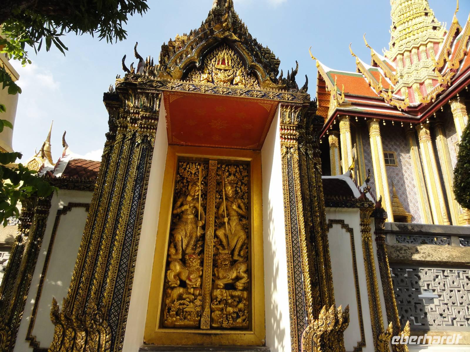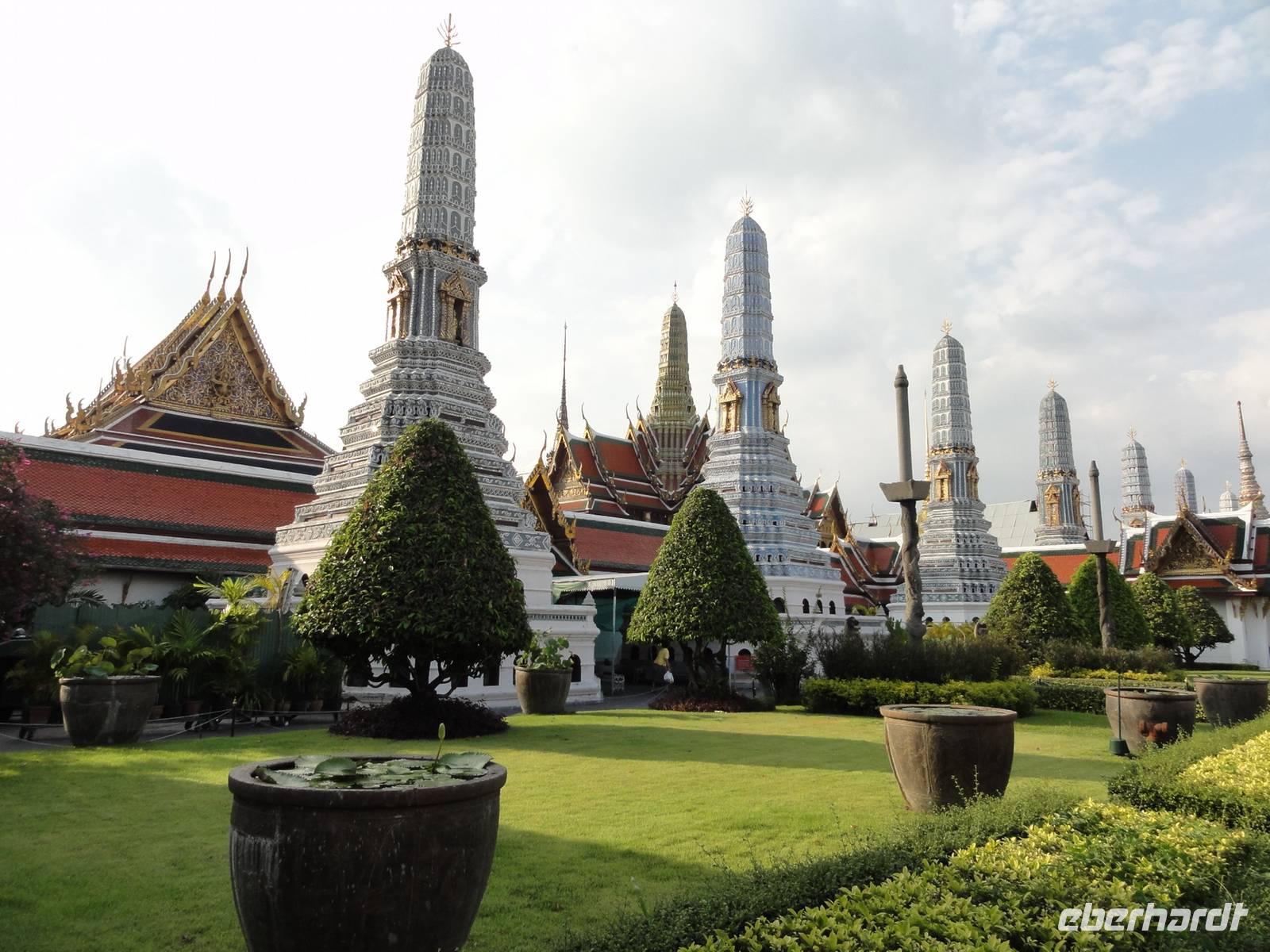 Nach so viel Kultur bei 32 Grad kommt uns eine Pause gerade recht und diese genießen wir am Flussufer mit fruchtiger Untermalung, mit der wir noch einmal auf den Nikolaus anstoßen. Anschießend gelangen wir auf dem Wasserweg zurück zum Königspalast, dessen Tore uns aber leider verschlossen bleiben sollten, wegen des gestrigen Geburtstags ihrer Majestät. So haben wir mehr Zeit uns den Wat Phra Keo, „Tempel des Smaragd-Buddhas", näher zu betrachten. Ein riesig-hoher Sockel erhebt sich im Inneren, auf dem der nur 75 cm große Jade-Buddha thront - die heiligste, wertvollste und schönste Buddha-Figur des Landes und Thailands ganzer Stolz! Neben herrlichen Wandgemälden, die die Galerie des Wat Phra Keo zieren, befinden sich noch so weitere Kostbarkeiten im Palastbezirk. Ein goldener Stupa stellt die Nachbildung einer der 3 zerstörten Ayutthaya-Stupas dar und ist mit italienischem Gold-Mosaik besetzt. Direkt daneben befindet sich die glitzernde Bibliothek, in der die auf Blattgold niedergeschriebenen heiligen Schriften des Buddhismus verwahrt sind. Wiederum daneben staunen wir über die „Pension der verstorbenen Könige", in der bereits die Könige Rama I. - IIX. ihre letzte Ruhestätte fanden. Gang führt uns bedächtig über das Gelände, auf dem es nicht nur vor Menschen, sondern auch vor Gold, Glanz und „Bling, Bling" wimmelt!