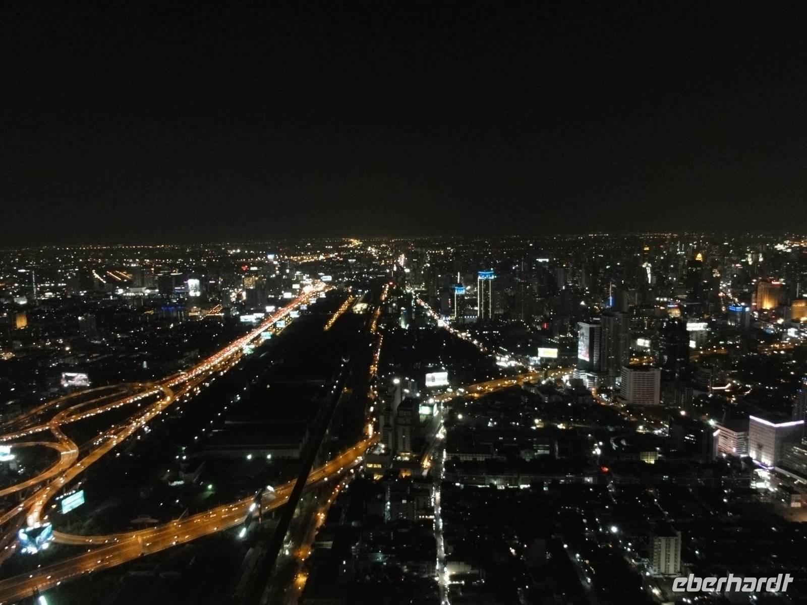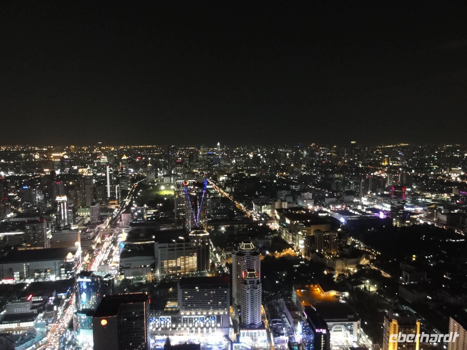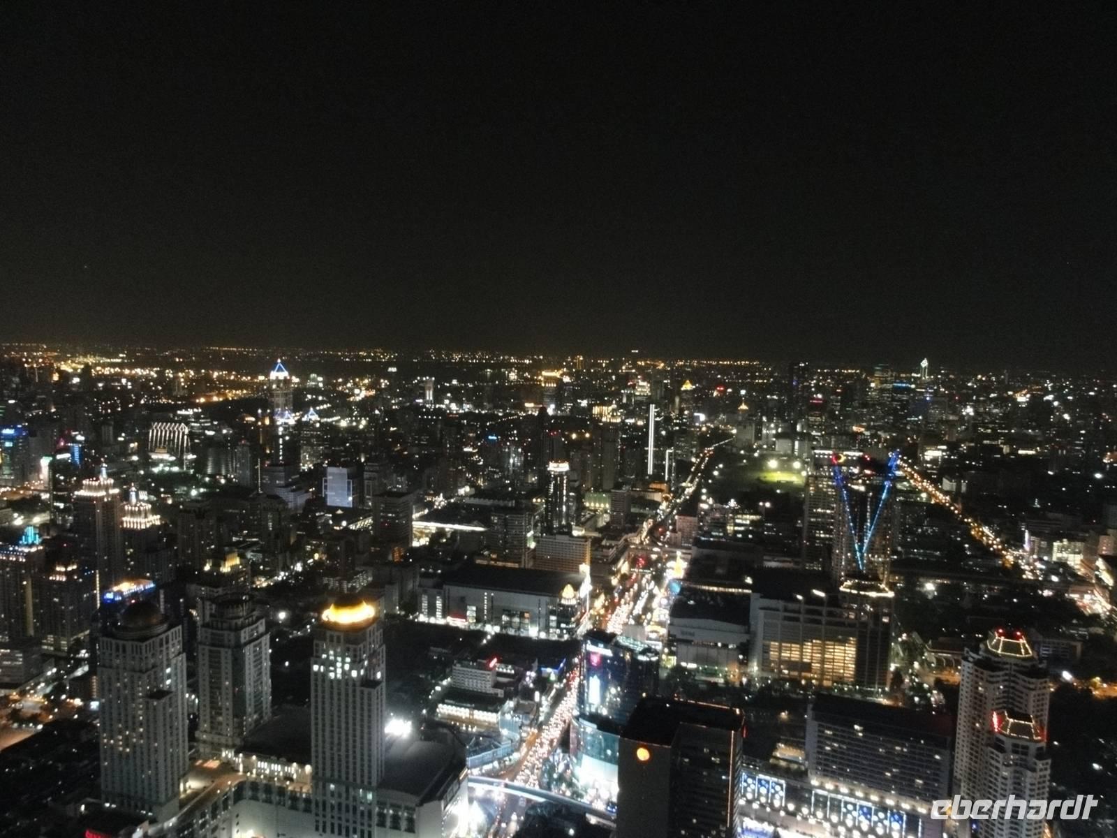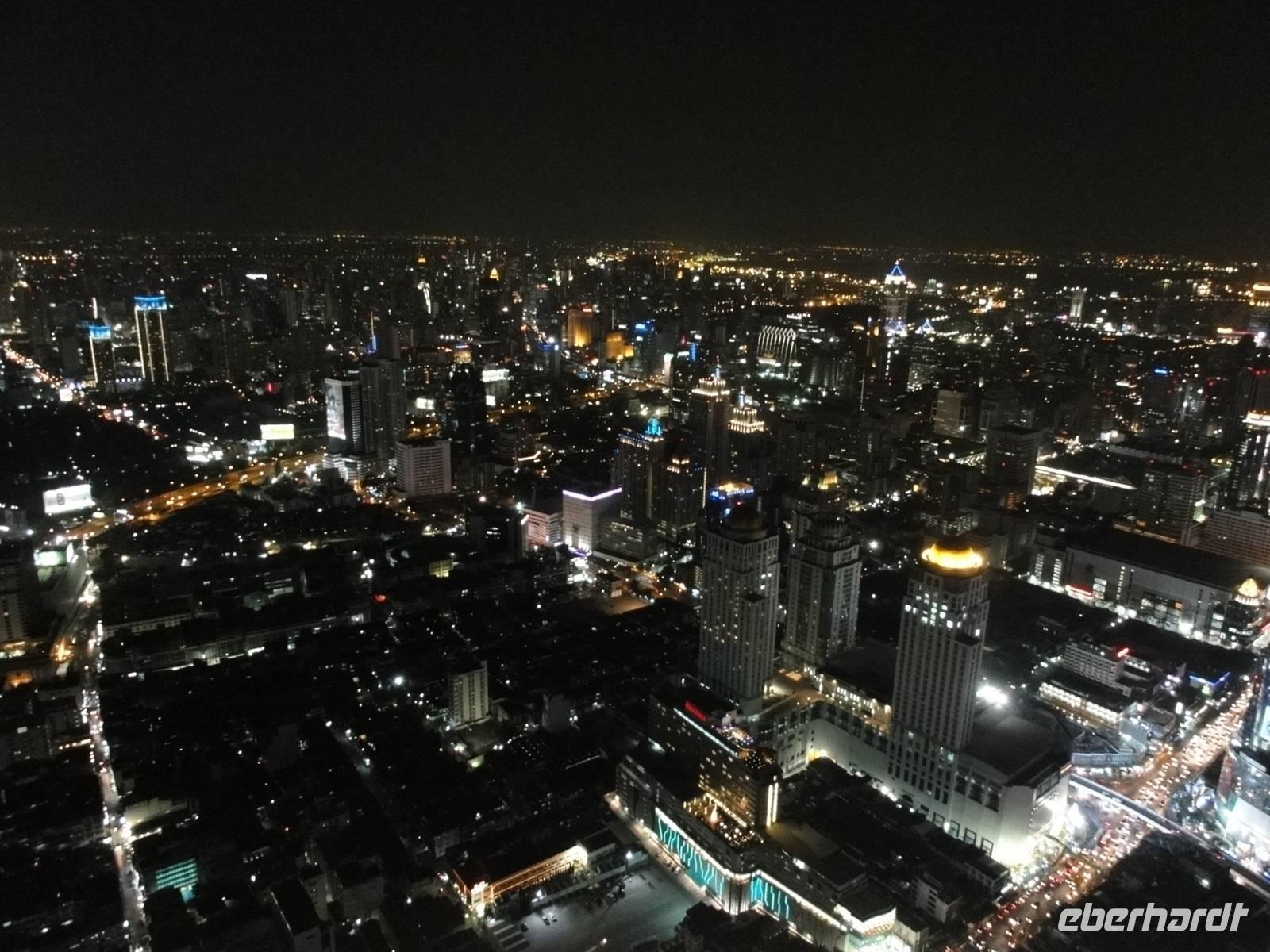 Von so viel Glitzer und Gefunkel müssen wir uns erst mal erholen und wie ginge das besser als bei einem Abendessen in schwindelerregender Höhe mit Blick über die Weite der Metropole. Ziel ist das höchste Gebäude Thailands, der 309 Meter hohe „Baiyoke Sky Tower", wo wir mit dem Fahrstuhl zunächst auf die Aussichtsplattform in der 84. Etage fahren. WOW! Die Aussicht haut uns nahezu um! Ganz Bangkok können wir überblicken und mit langsam schwindender Sonne die sich üpber die Stadt legende Dämmerung genießen. Als sich doch so langsam wieder ein Hungergefühl einstellt nehmen wir unsere Plätze im Restaurant der 78. Etage ein und schon wieder können wir nur WOW sagen, denn das Buffet, das wohl aus dem Schlaraffenland entsprungen ist, lässt keine Wünsche offen! Endlich können wir uns mal so richtig satt essen. Zufrieden fahren wir zum Abschluss nochmal hinauf, wo uns in ein dunkles Schwarz gehüllt, Bangkoks Lichtermeer zu Füßen liegt! Eine fantastische letzte Nacht einer fantastischen Reise!