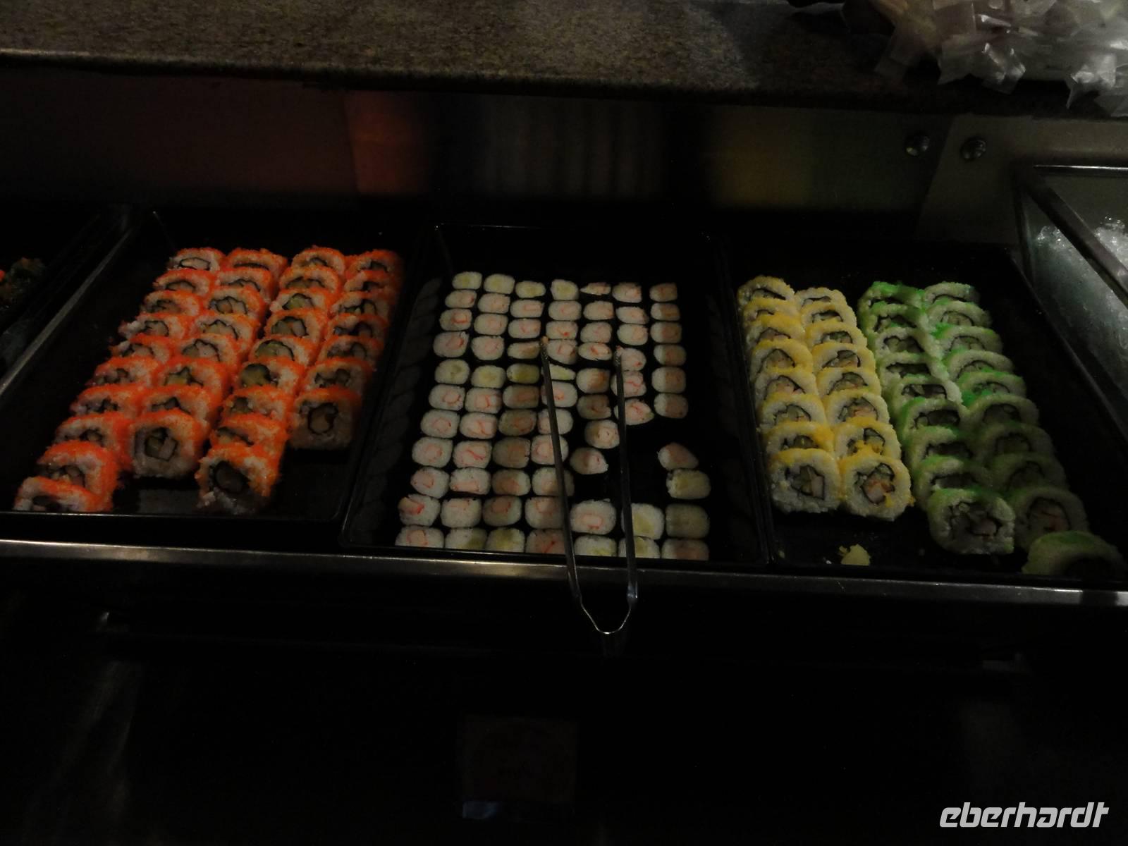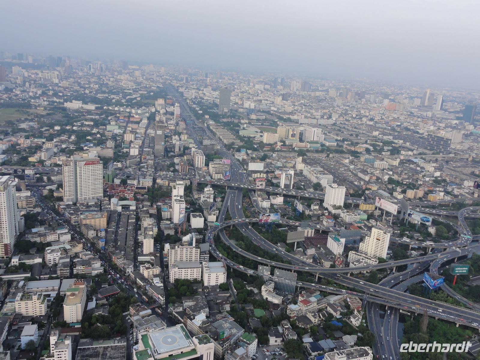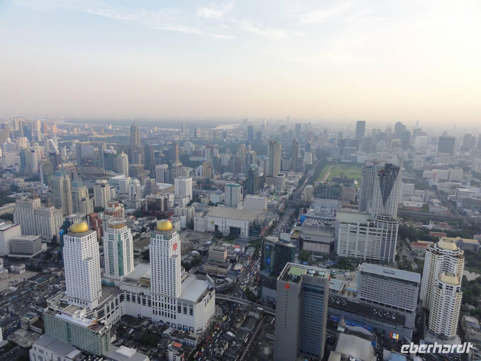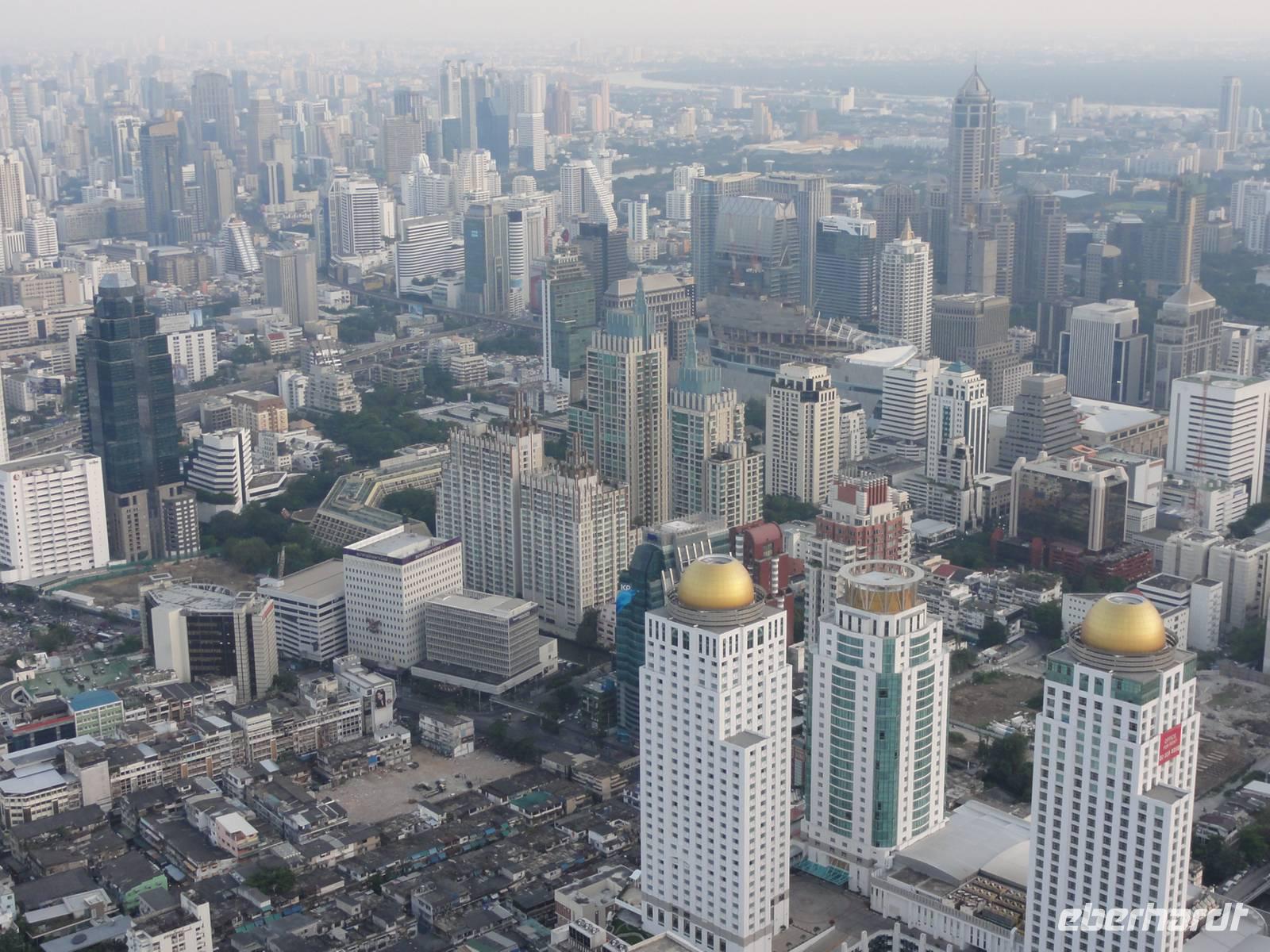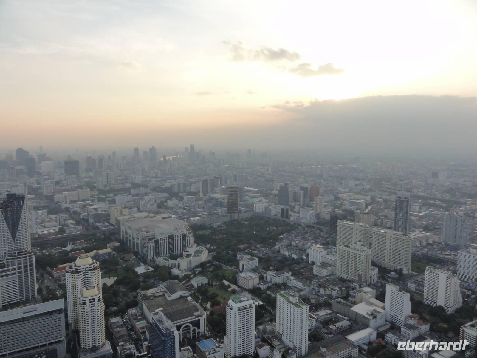 Von so viel Glitzer und Gefunkel müssen wir uns erst mal erholen und wie ginge das besser als bei einem Abendessen in schwindelerregender Höhe mit Blick über die Weite der Metropole. Ziel ist das höchste Gebäude Thailands, der 309 Meter hohe „Baiyoke Sky Tower", wo wir mit dem Fahrstuhl zunächst auf die Aussichtsplattform in der 84. Etage fahren. WOW! Die Aussicht haut uns nahezu um! Ganz Bangkok können wir überblicken und mit langsam schwindender Sonne die sich üpber die Stadt legende Dämmerung genießen. Als sich doch so langsam wieder ein Hungergefühl einstellt nehmen wir unsere Plätze im Restaurant der 78. Etage ein und schon wieder können wir nur WOW sagen, denn das Buffet, das wohl aus dem Schlaraffenland entsprungen ist, lässt keine Wünsche offen! Endlich können wir uns mal so richtig satt essen. Zufrieden fahren wir zum Abschluss nochmal hinauf, wo uns in ein dunkles Schwarz gehüllt, Bangkoks Lichtermeer zu Füßen liegt! Eine fantastische letzte Nacht einer fantastischen Reise!