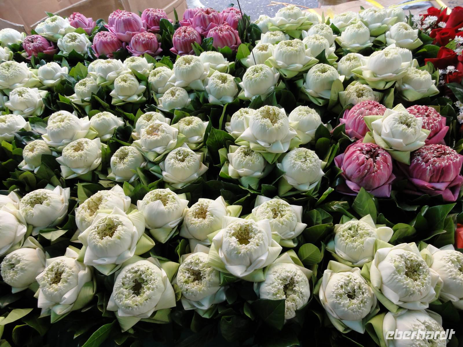 Nach einer Mittagspause wollen wir noch Bangkoks Blumenmarkt unsicher machen, auf dem wir herrliche Gestecke und künstlerische Kreationen aus Palmenblättern, Nelken, Rosen und allerlei anderer exotischer Blumen und Pflanzen bewundern. Ein letztes Mal bahnen wir uns unseren Weg zwischen den Händlern und ihren Garküchen hindurch, laufen von einer Geruchswolke in die nächste und lassen uns vom Strom der hektischen Menschenmassen treiben.