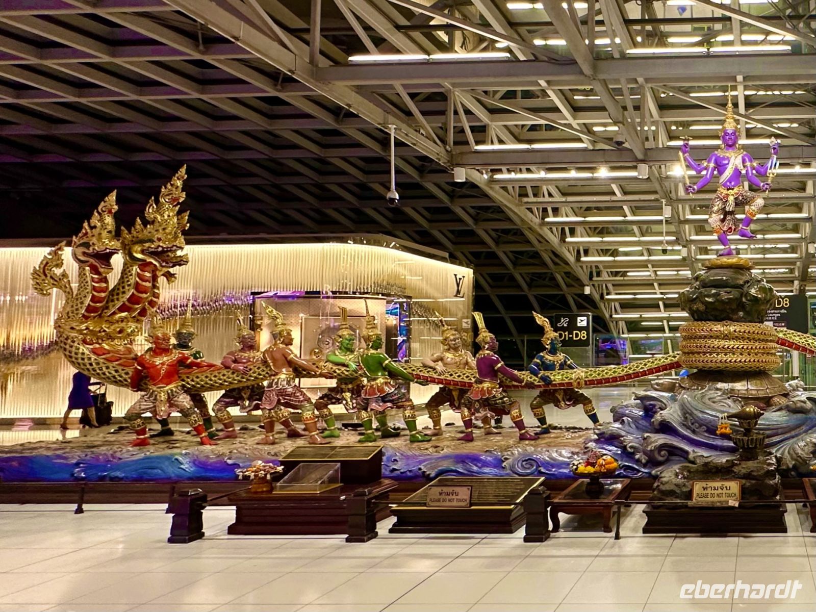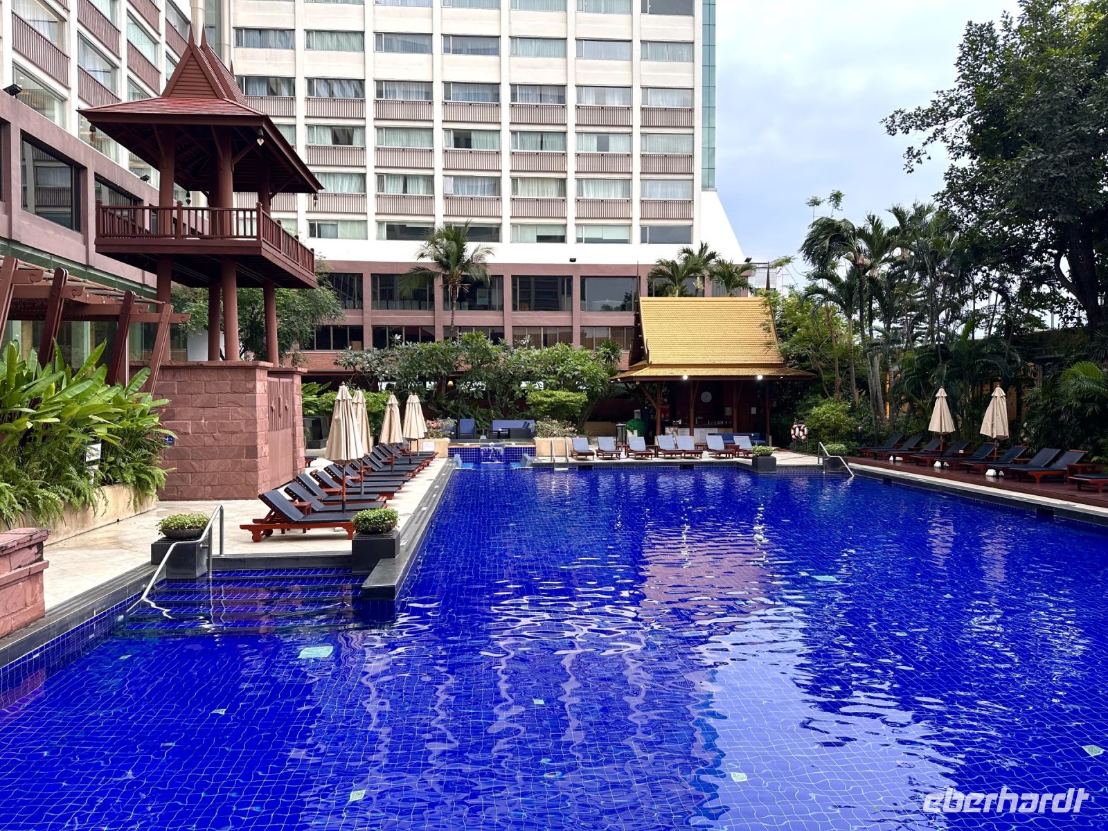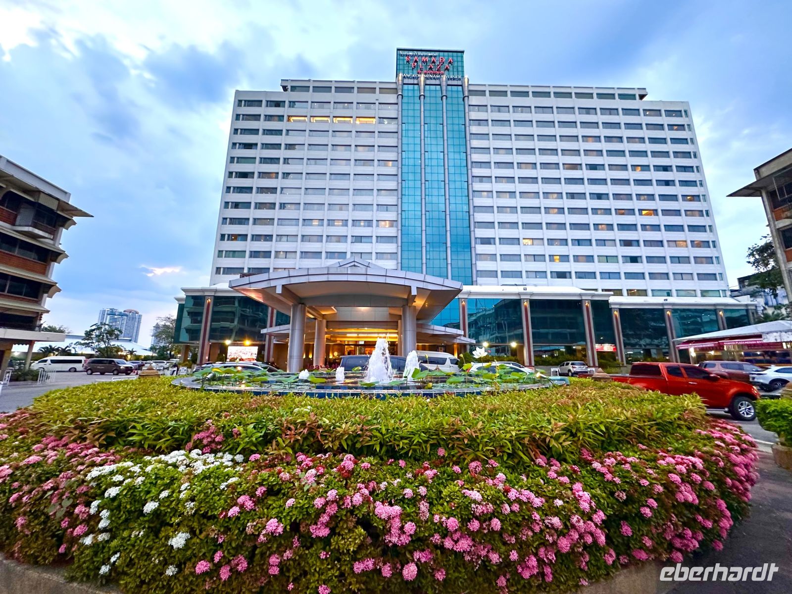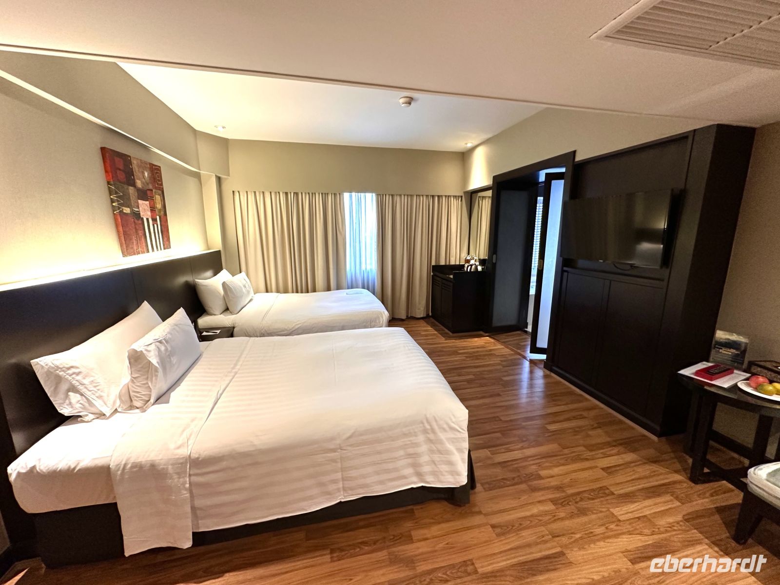 Nach 11 Stunden Flugzeit kommen wir in Bangkok an als es da bereits nach dem Mittag ist. Unser örtlicher Reiseleiter Taam nimmt uns in Empfang und wir fahren mit unseren beiden Minibussen quer durch Bangkok direkt ins Hotel im Zentrum.