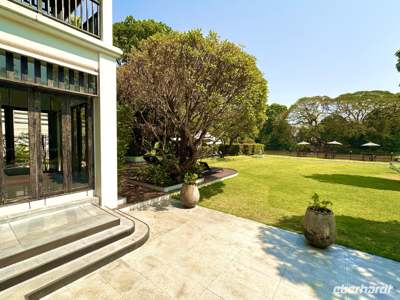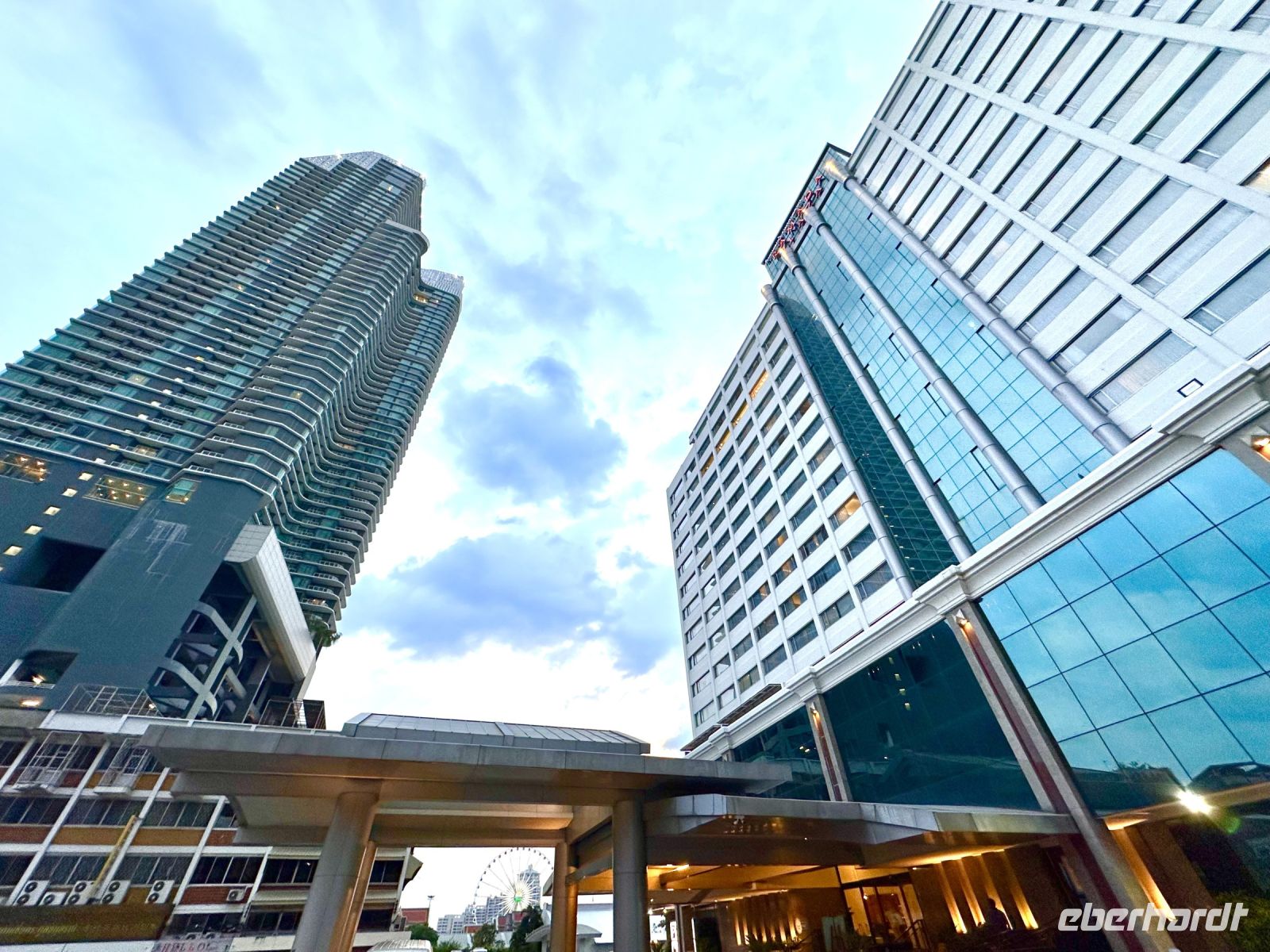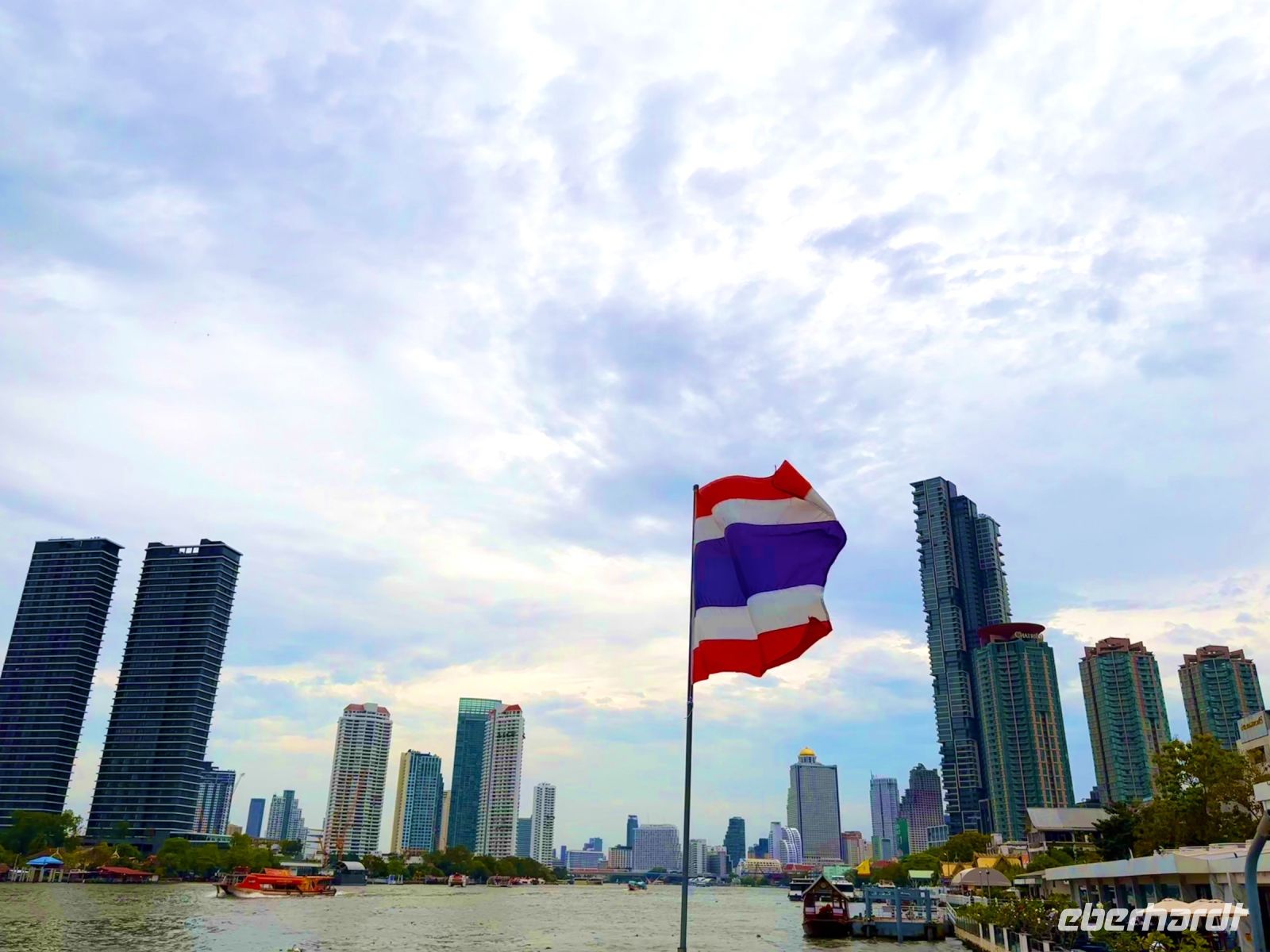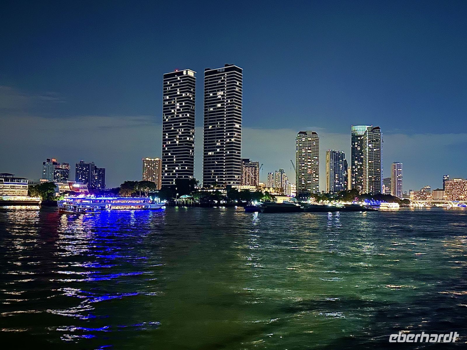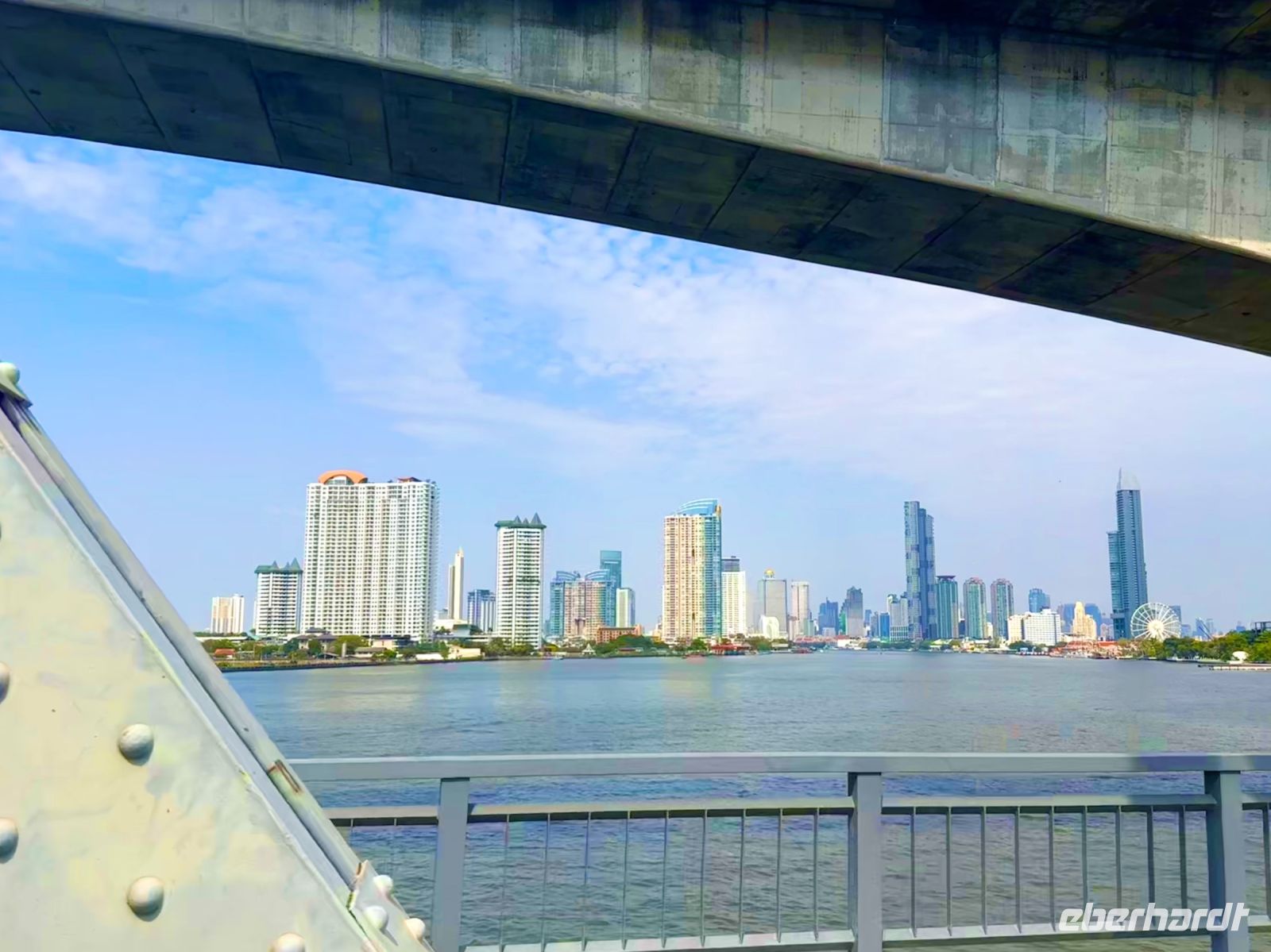Auf geht’s zum riesigen Frühstücksbuffet auf der Terrasse direkt am Flussufer mit herrlichem Ausblick auf Teile der Bangkoker Skyline.