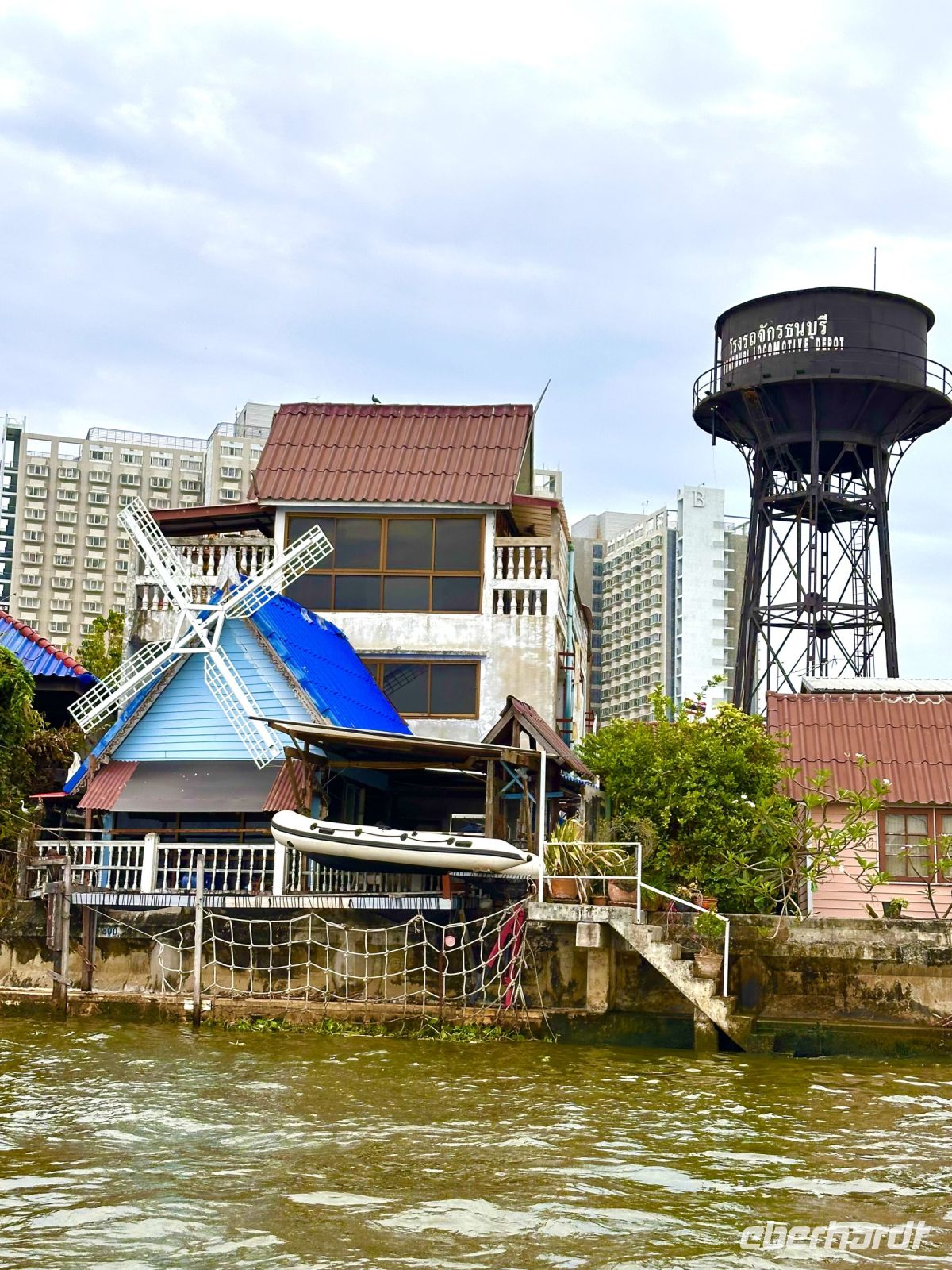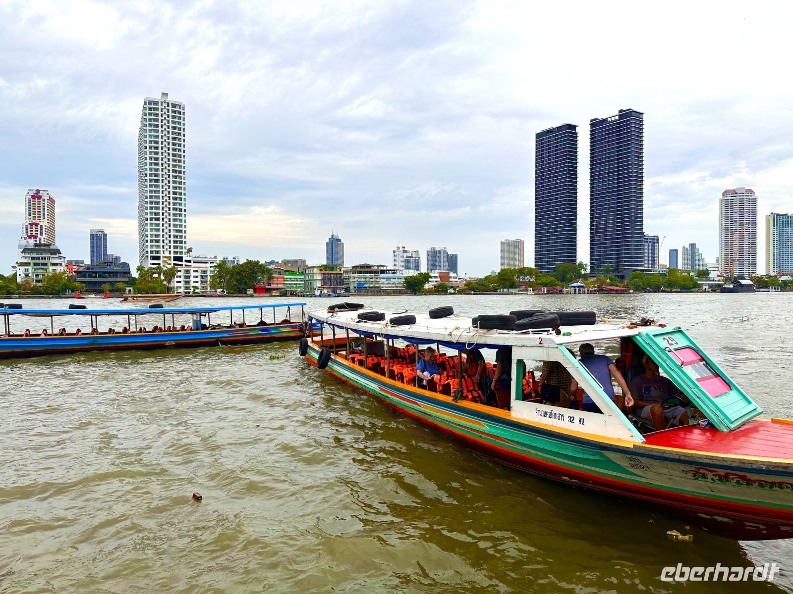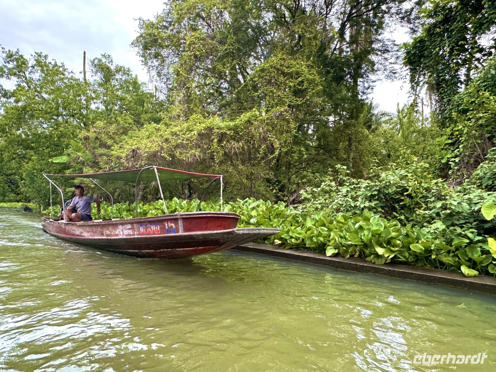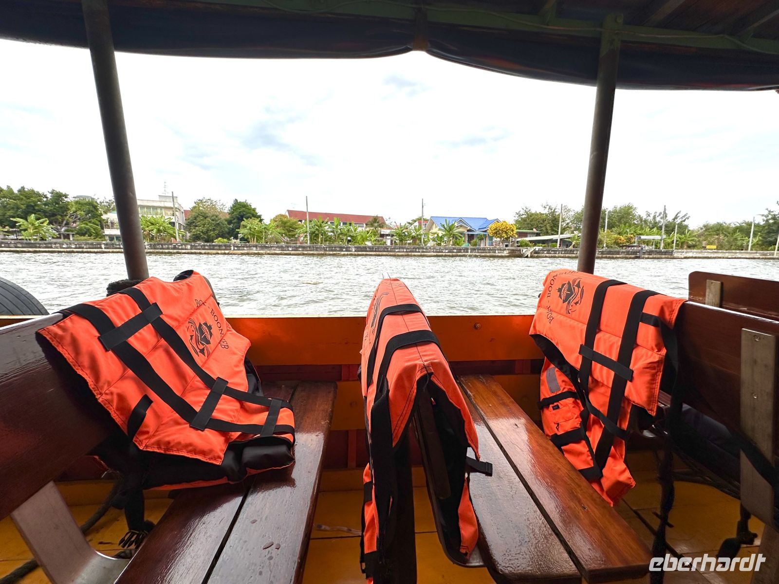 Wir starten am Hotel-Bootsanleger mit einer Fahrt auf dem Chao Phraya River welcher einmal quer durch Bangkok führt und ein sehr wichtiger Transportweg der Stadt ist. Das Longtailboot ist nur für unsere kleine Gruppe gebucht und kann uns so in aller Ruhe auf der ausgewählten Strecke alle Sehenswürdigkeiten zeigen.