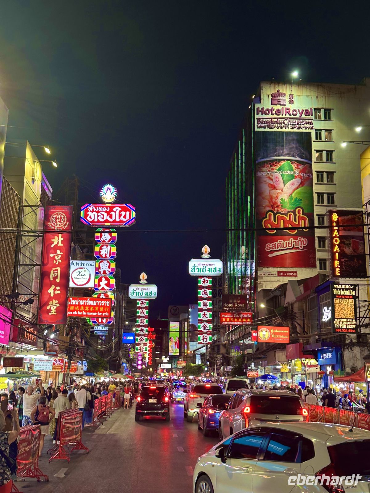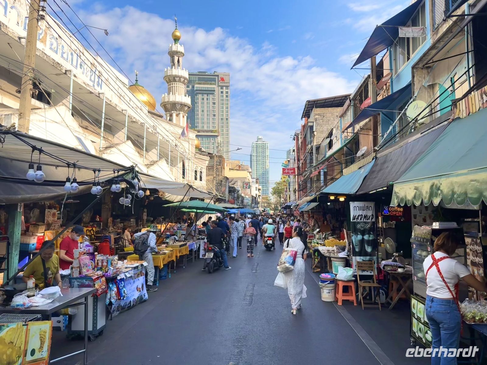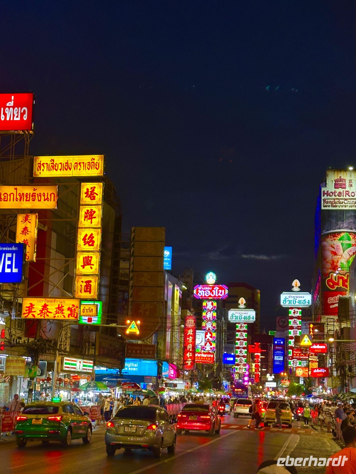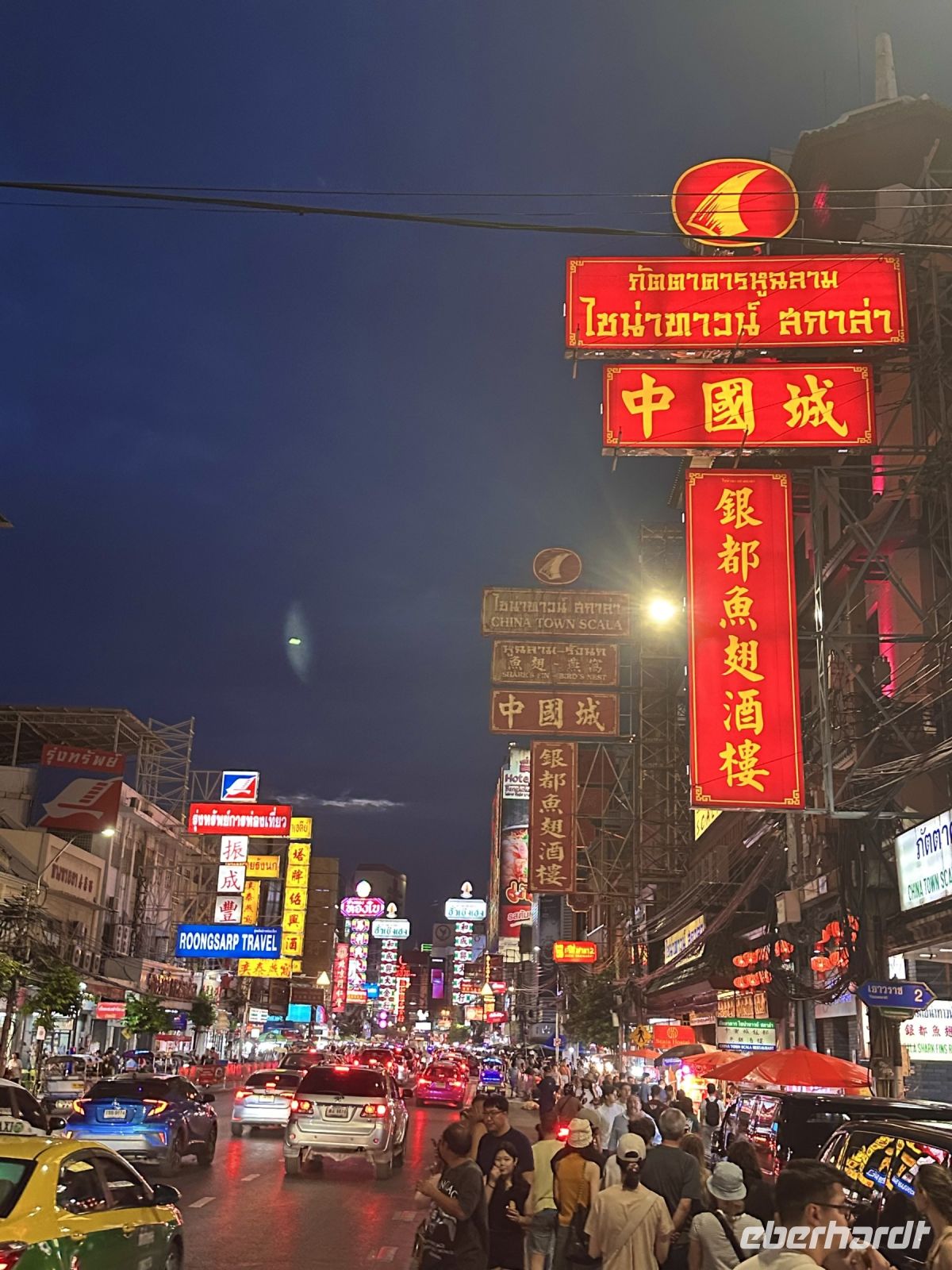 Nach unserer Ankunft zurück in Bangkok haben wir noch kurz Zeit um in den Pool zu springen und fahren anschließend mit unserem örtliche Reiseleiter Taam nach China-Town. Die Hauptstraße von China-Town, die Yaowarat Road, verwandelt sich jeden Abend zu einem riesigen Street-Food-Market mit unzähligen Ständen bis in die kleinen Nebengassen hinein. Wir futtern uns einmal durch den ganzen Markt, von Stand zu Stand. Wir wollen alles mal testen und probieren es in der Gruppe, jeder wie er mag.