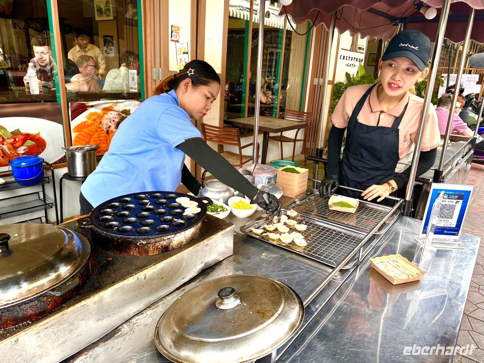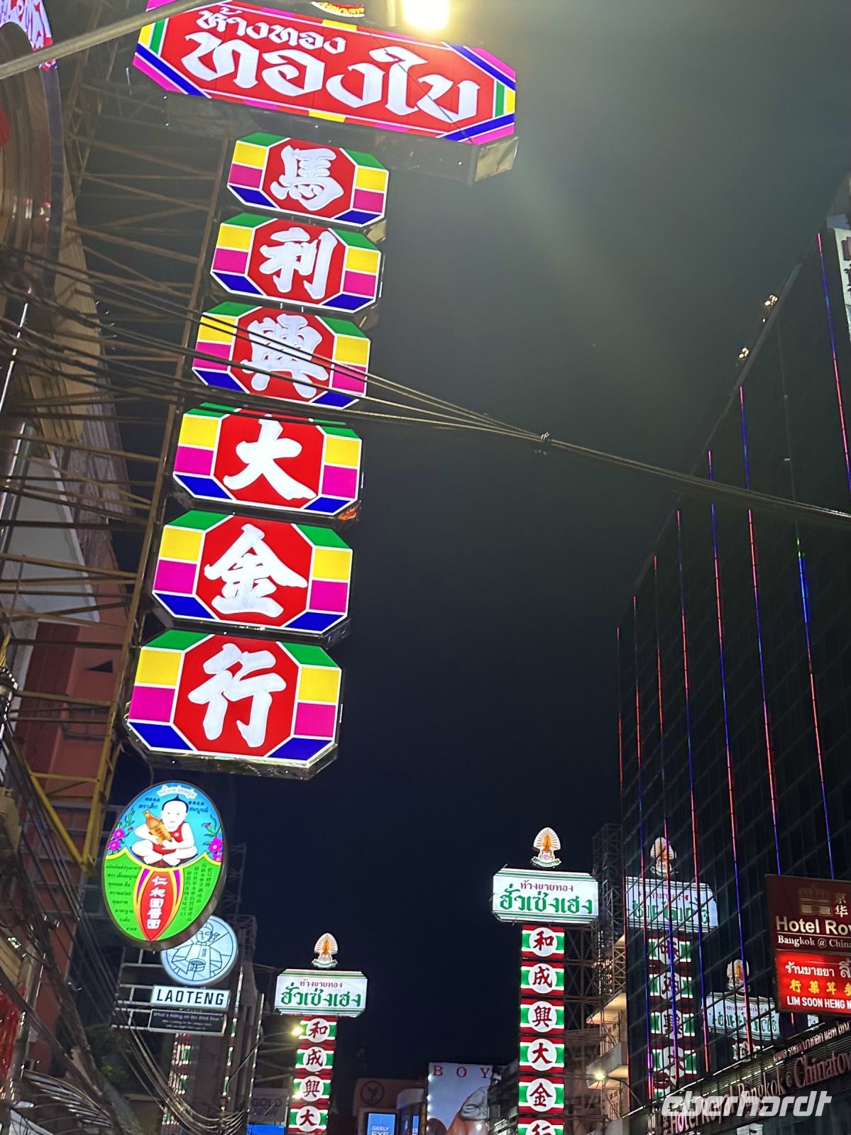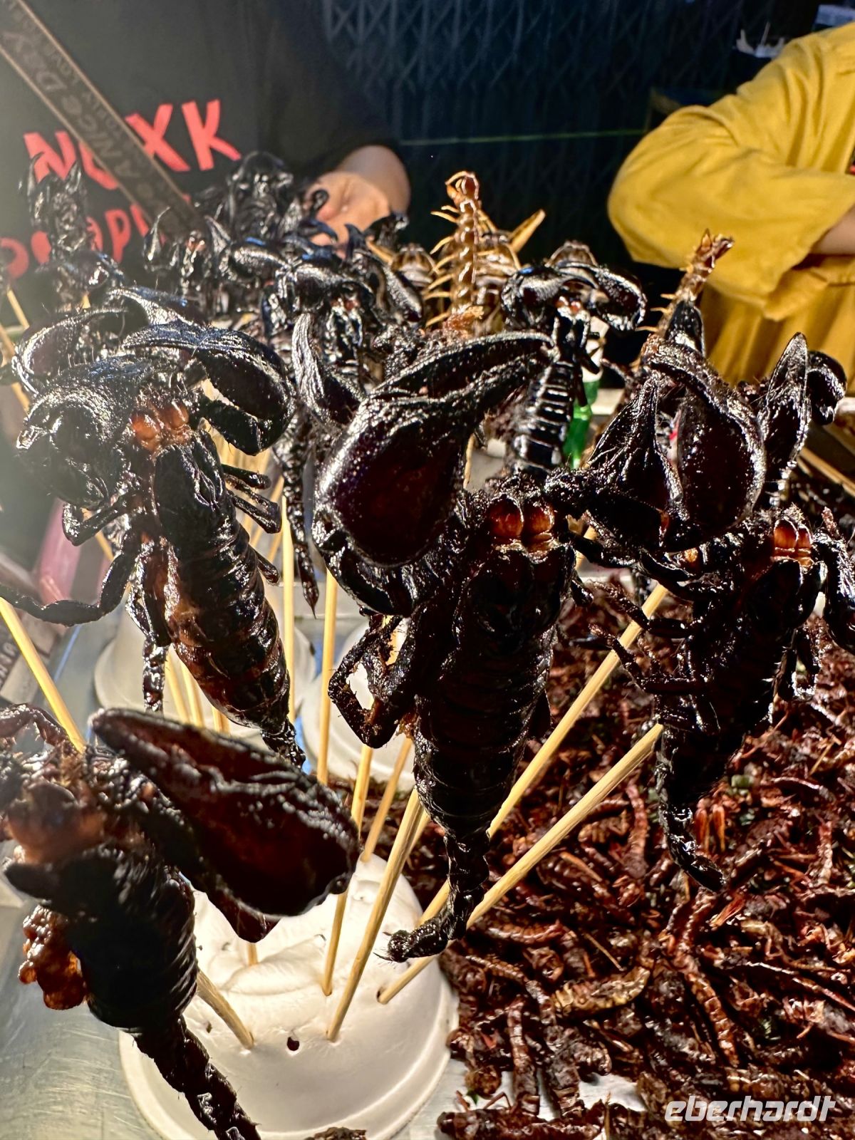 Nach unserer Ankunft zurück in Bangkok haben wir noch kurz Zeit um in den Pool zu springen und fahren anschließend mit unserem örtliche Reiseleiter Taam nach China-Town. Die Hauptstraße von China-Town, die Yaowarat Road, verwandelt sich jeden Abend zu einem riesigen Street-Food-Market mit unzähligen Ständen bis in die kleinen Nebengassen hinein. Wir futtern uns einmal durch den ganzen Markt, von Stand zu Stand. Wir wollen alles mal testen und probieren es in der Gruppe, jeder wie er mag.