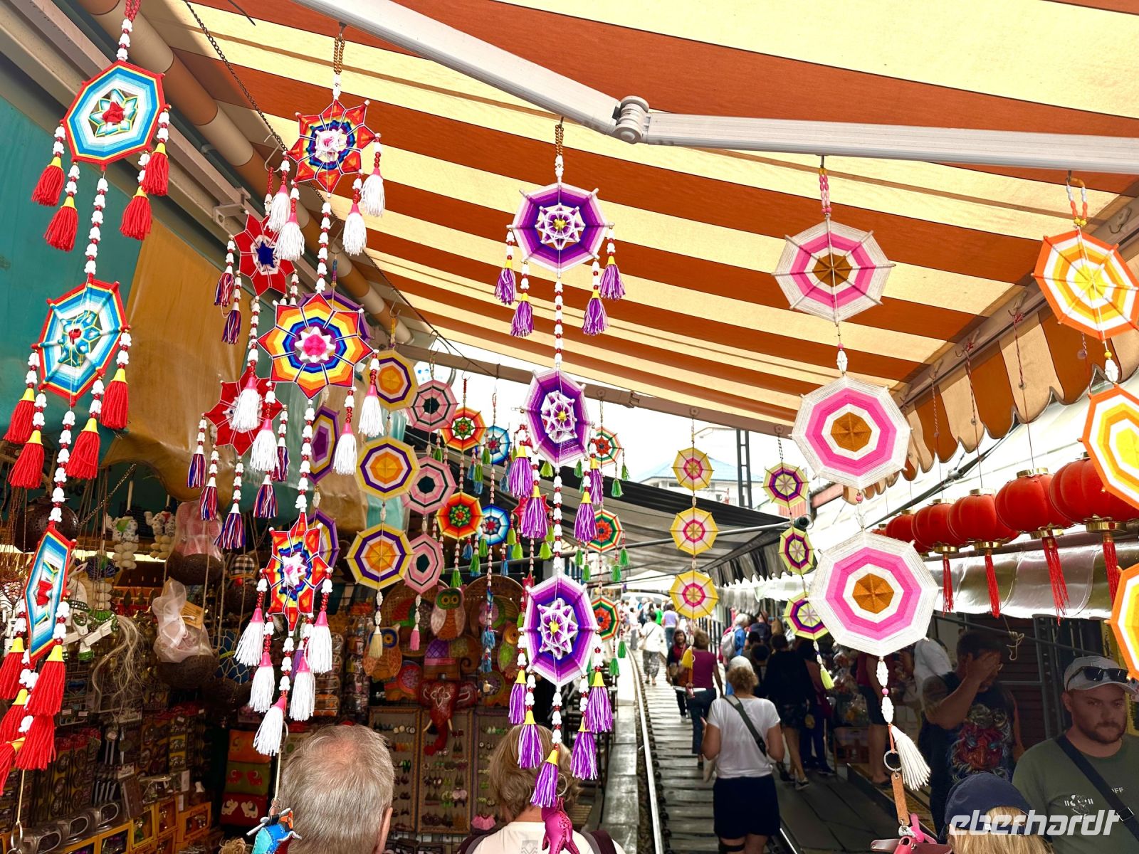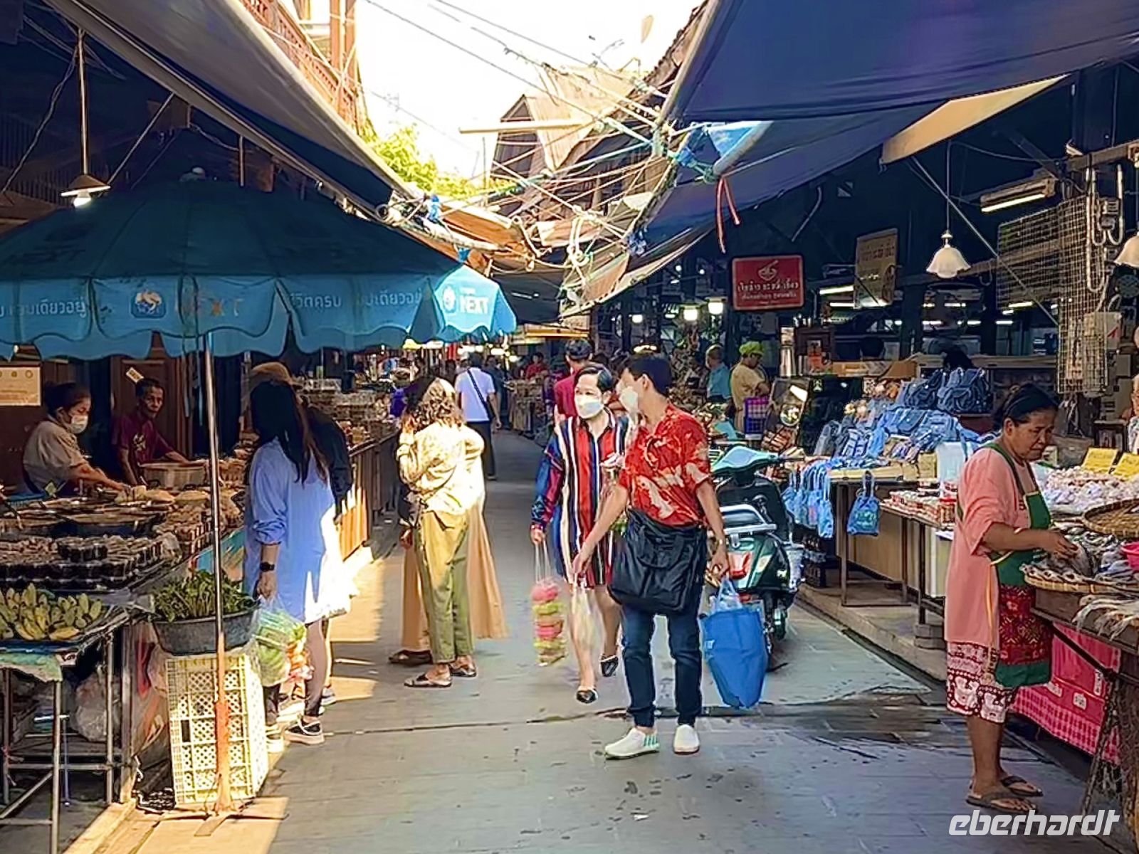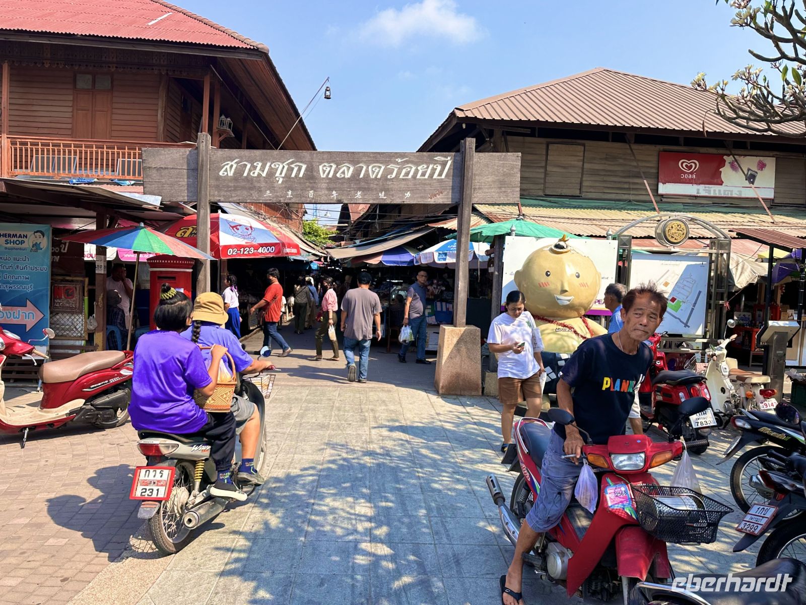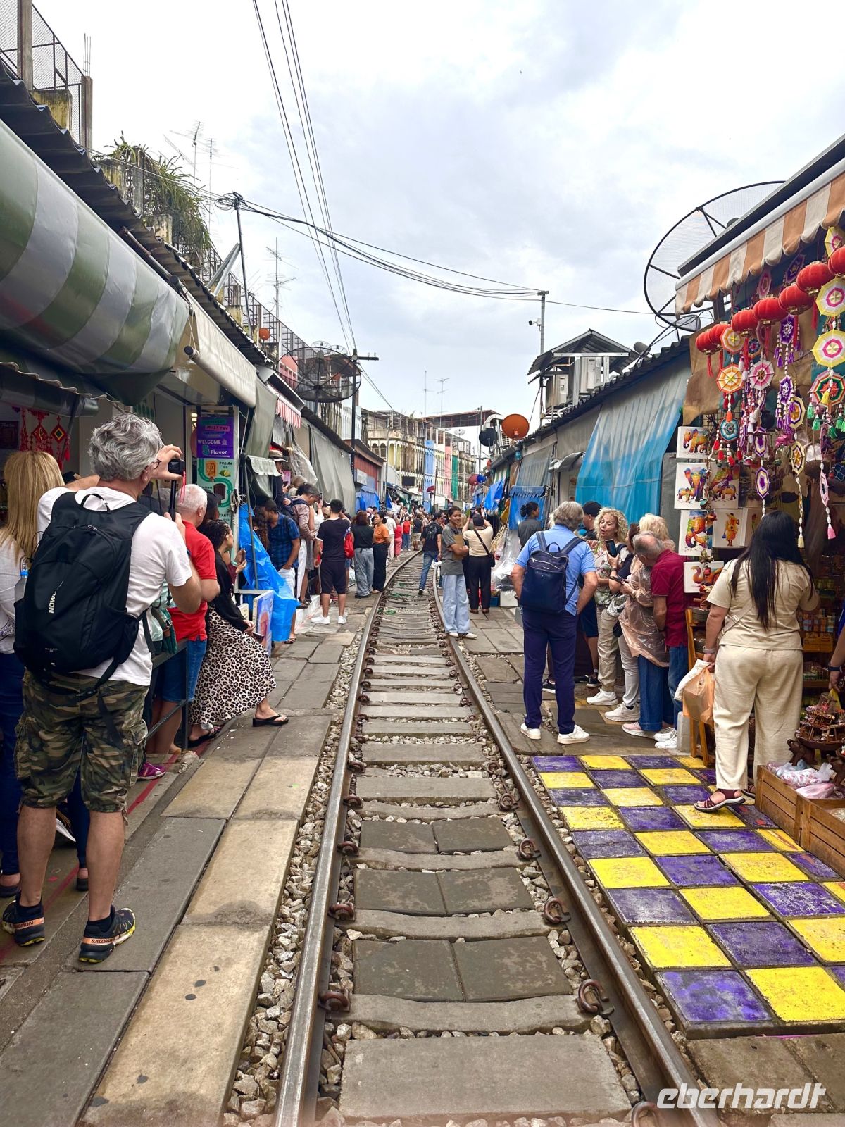 Wir fahren raus ins Bangkoker Umland zu dem berühmten Train Market. Der Markt hat sich da entlang der Bahnlinie etabliert, und der Zug fährt quasi quer durch den Markt. Die Stände sind so dicht an das Bahngleis gebaut, dass die Auslagen und Markisen der stände jedes Mal schnell zurückgebaut werden müssen wenn ein Zug einrollt. Dies geschieht alles in Windeseile und ist geübte tägliche Praxis der Standbetreiber. Wir schauen dem Schauspiel zu und erkunden anschließend den Markt, bis der nächste Zug kommt und das Schauspiel von vorn beginnt.