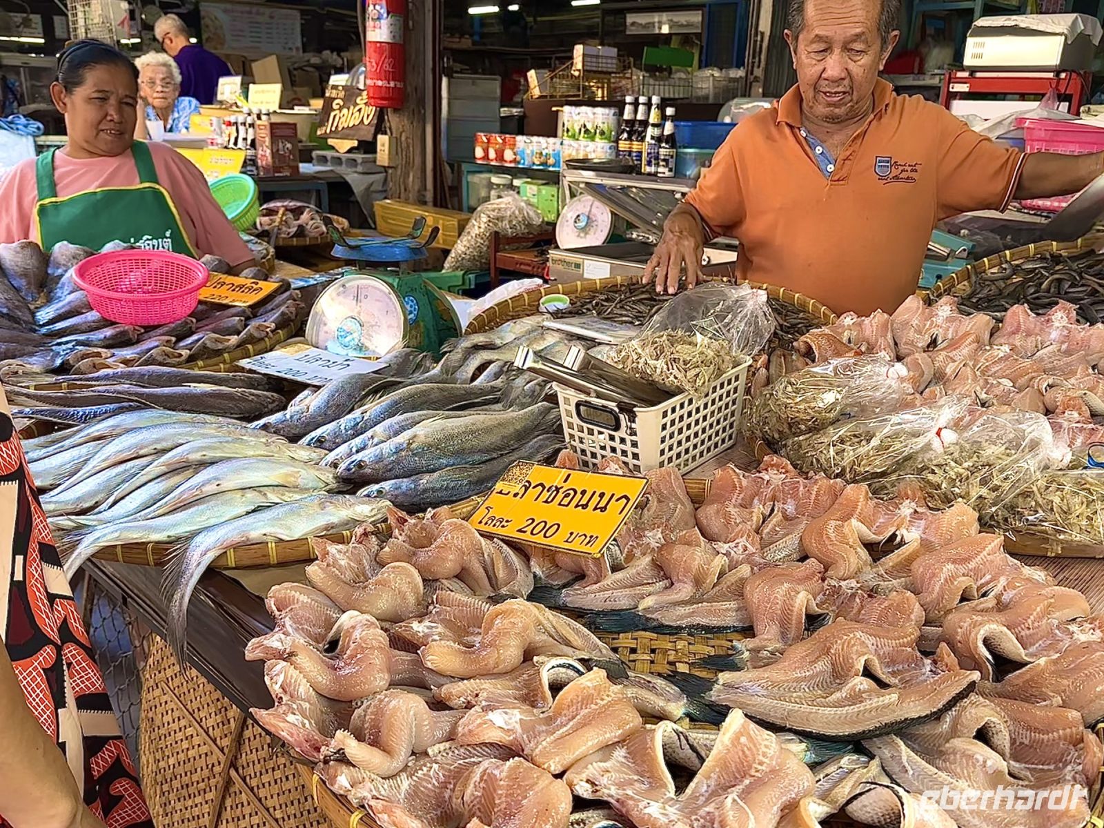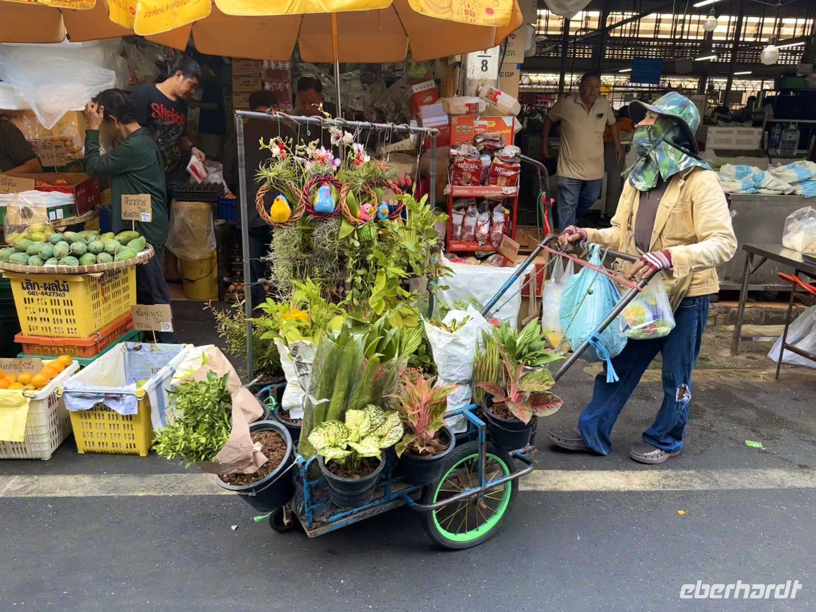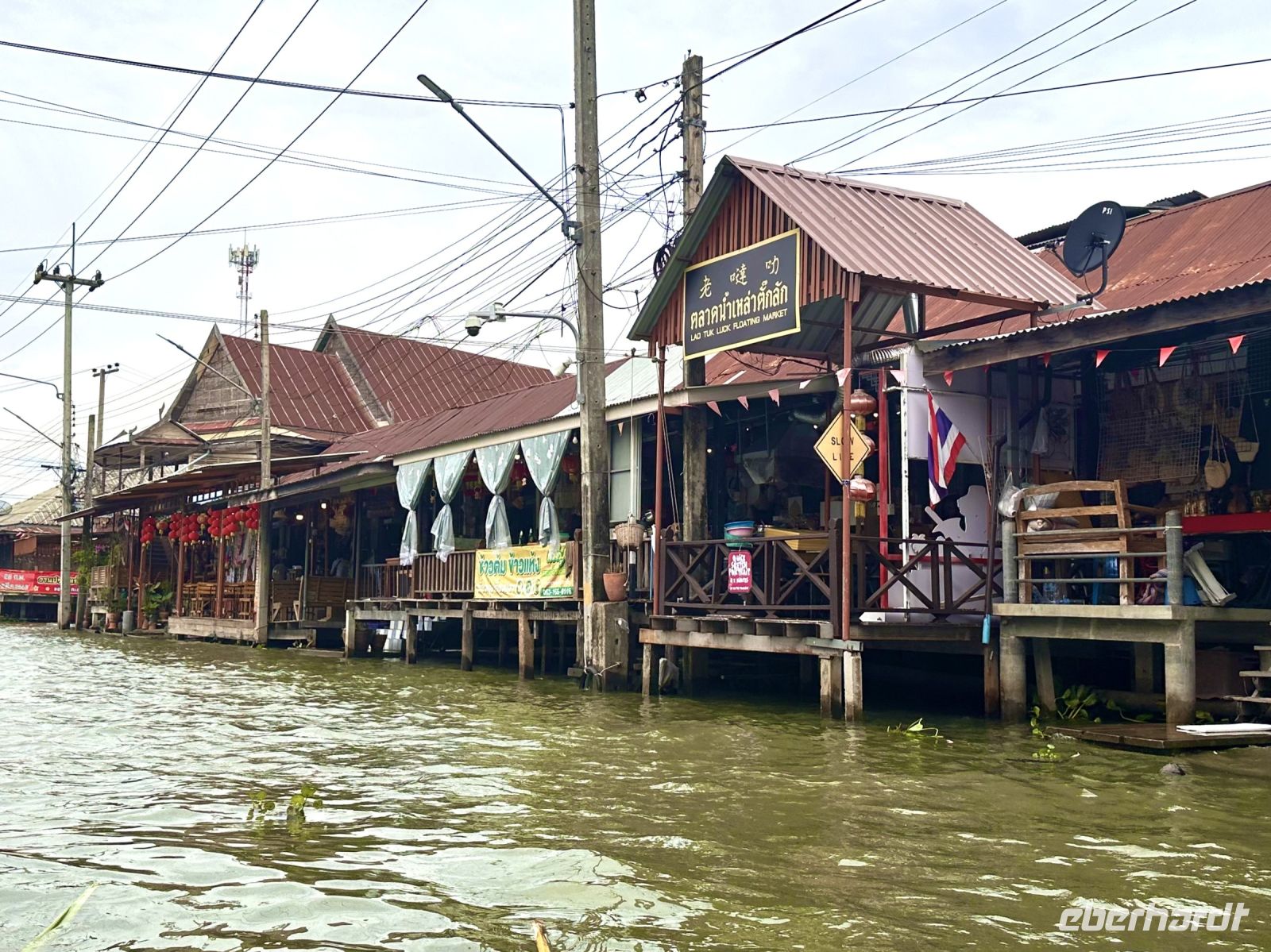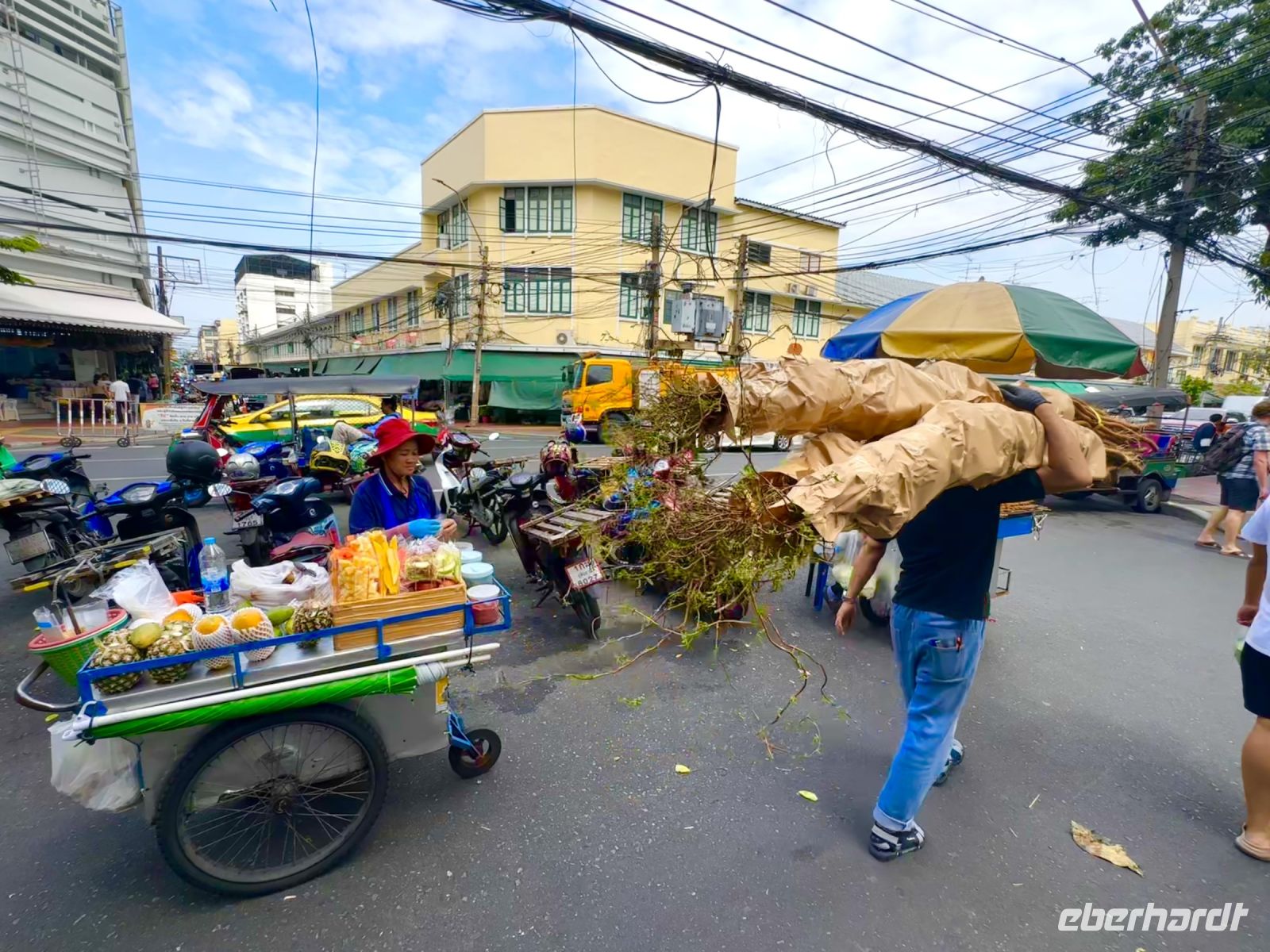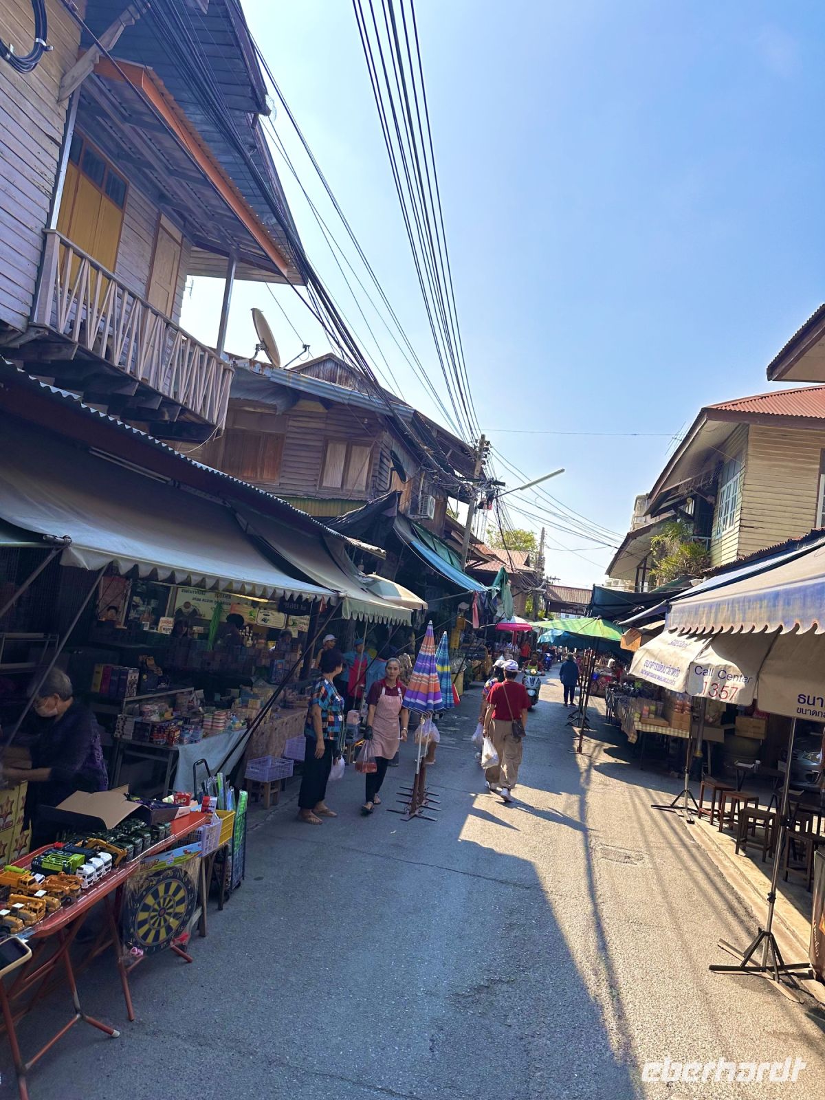 Wir fahren raus ins Bangkoker Umland zu dem berühmten Train Market. Der Markt hat sich da entlang der Bahnlinie etabliert, und der Zug fährt quasi quer durch den Markt. Die Stände sind so dicht an das Bahngleis gebaut, dass die Auslagen und Markisen der stände jedes Mal schnell zurückgebaut werden müssen wenn ein Zug einrollt. Dies geschieht alles in Windeseile und ist geübte tägliche Praxis der Standbetreiber. Wir schauen dem Schauspiel zu und erkunden anschließend den Markt, bis der nächste Zug kommt und das Schauspiel von vorn beginnt.