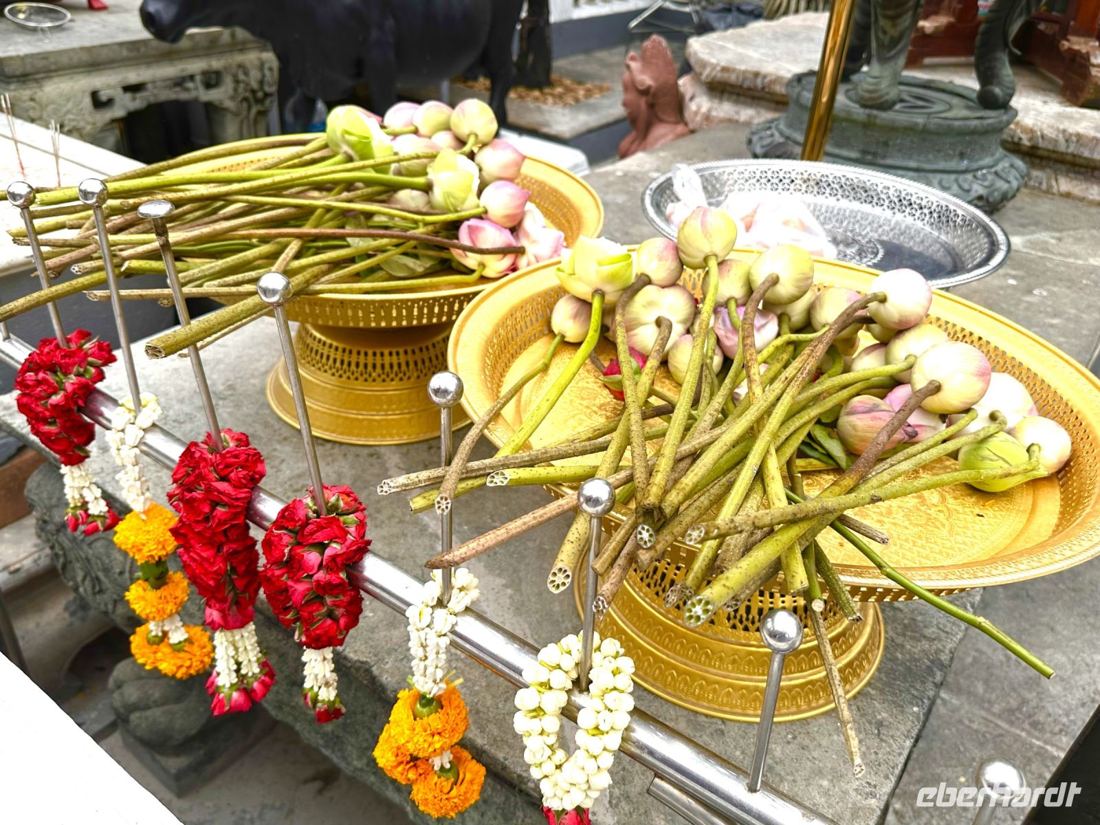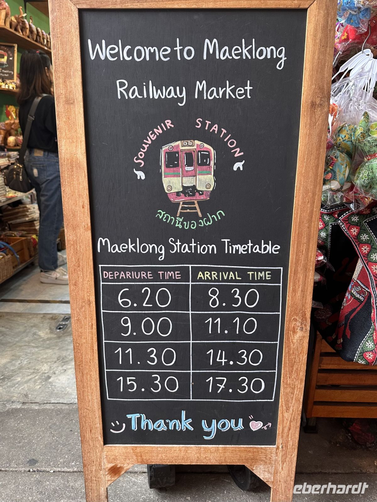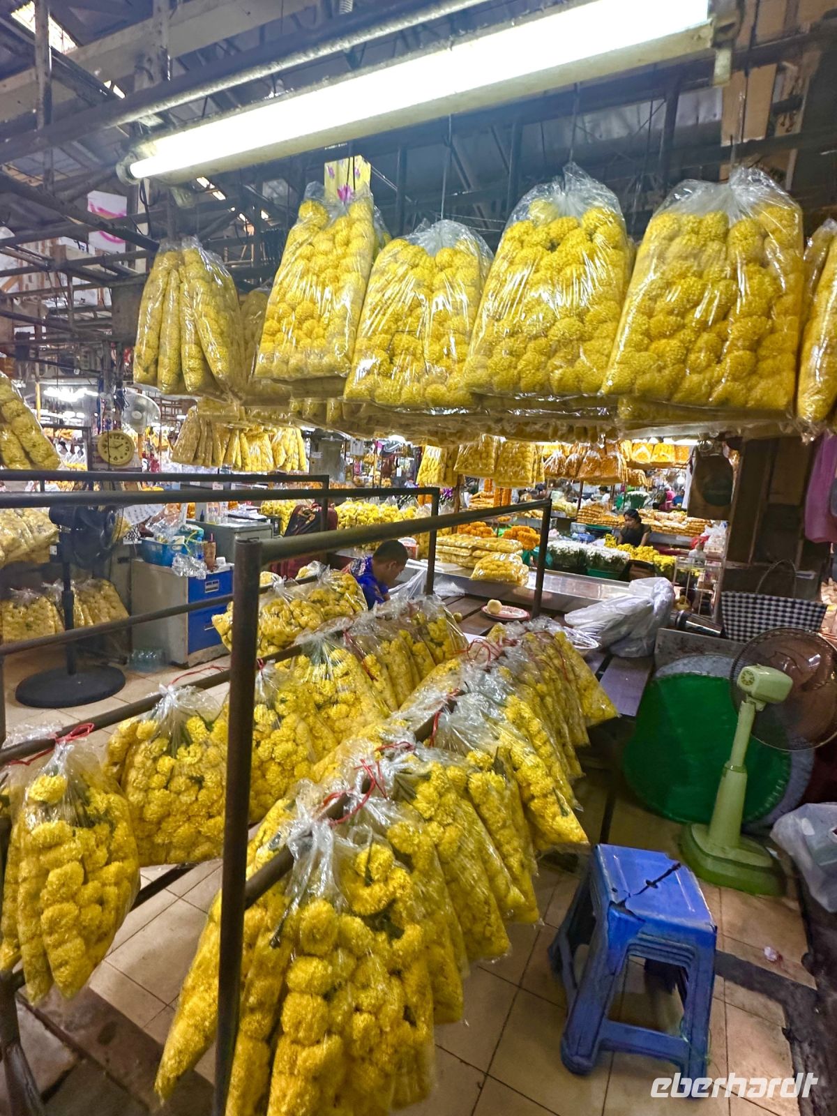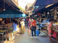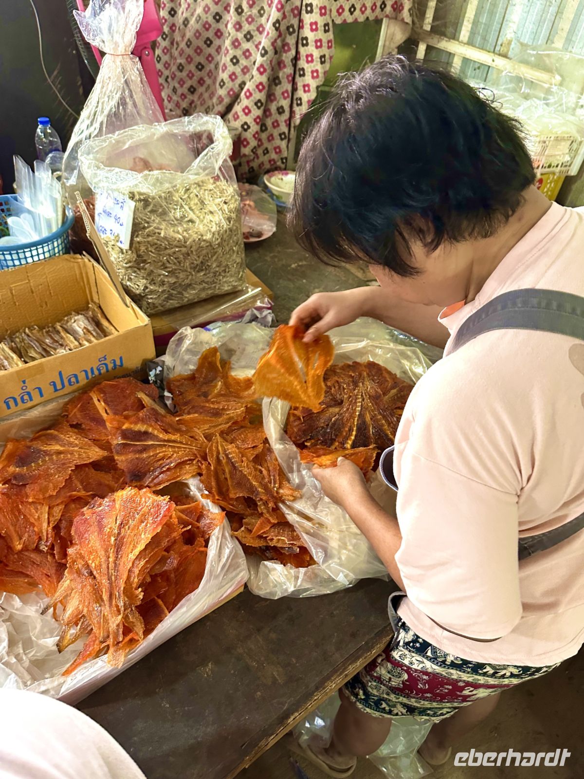 Wir fahren raus ins Bangkoker Umland zu dem berühmten Train Market. Der Markt hat sich da entlang der Bahnlinie etabliert, und der Zug fährt quasi quer durch den Markt. Die Stände sind so dicht an das Bahngleis gebaut, dass die Auslagen und Markisen der stände jedes Mal schnell zurückgebaut werden müssen wenn ein Zug einrollt. Dies geschieht alles in Windeseile und ist geübte tägliche Praxis der Standbetreiber. Wir schauen dem Schauspiel zu und erkunden anschließend den Markt, bis der nächste Zug kommt und das Schauspiel von vorn beginnt.