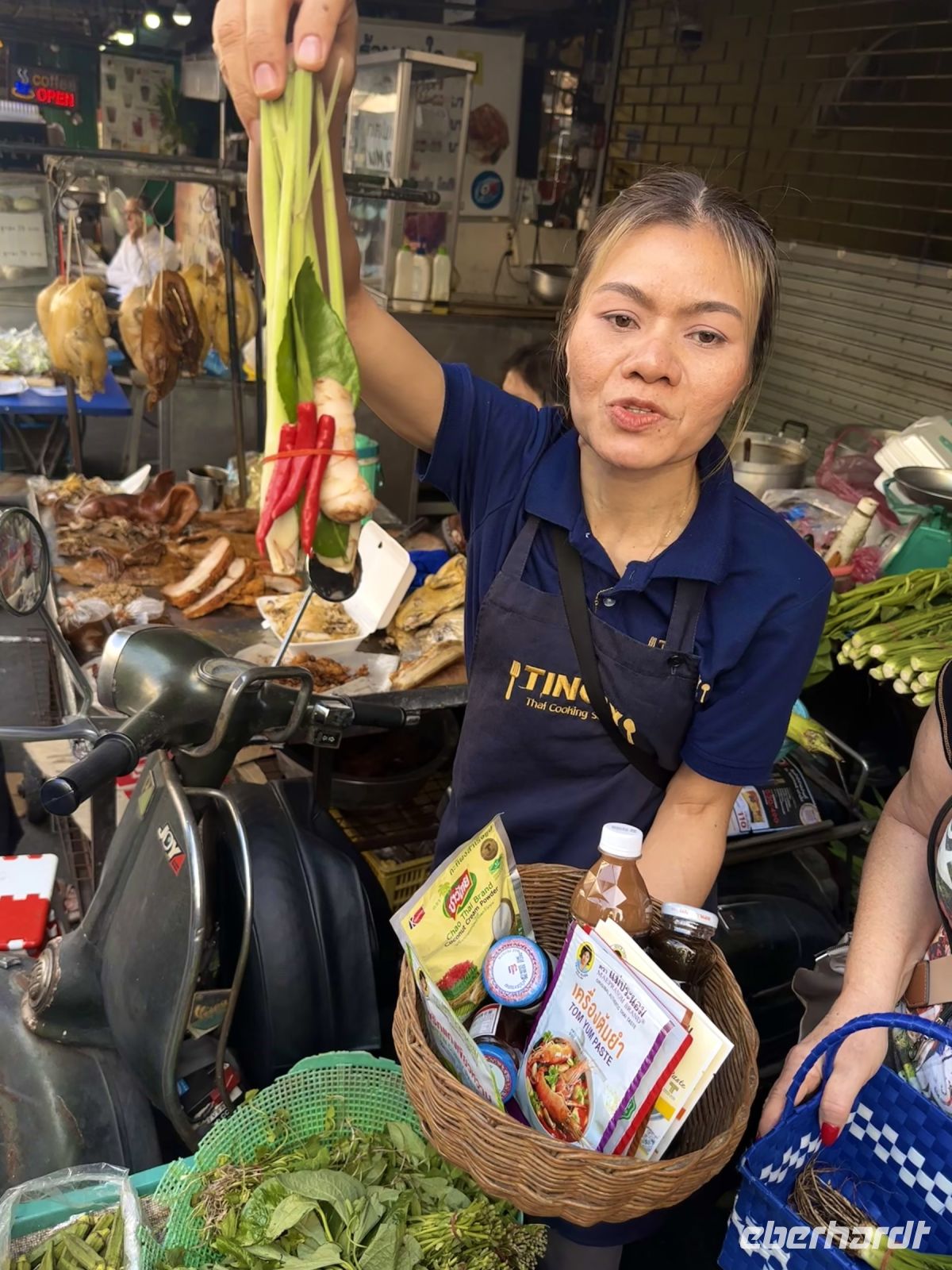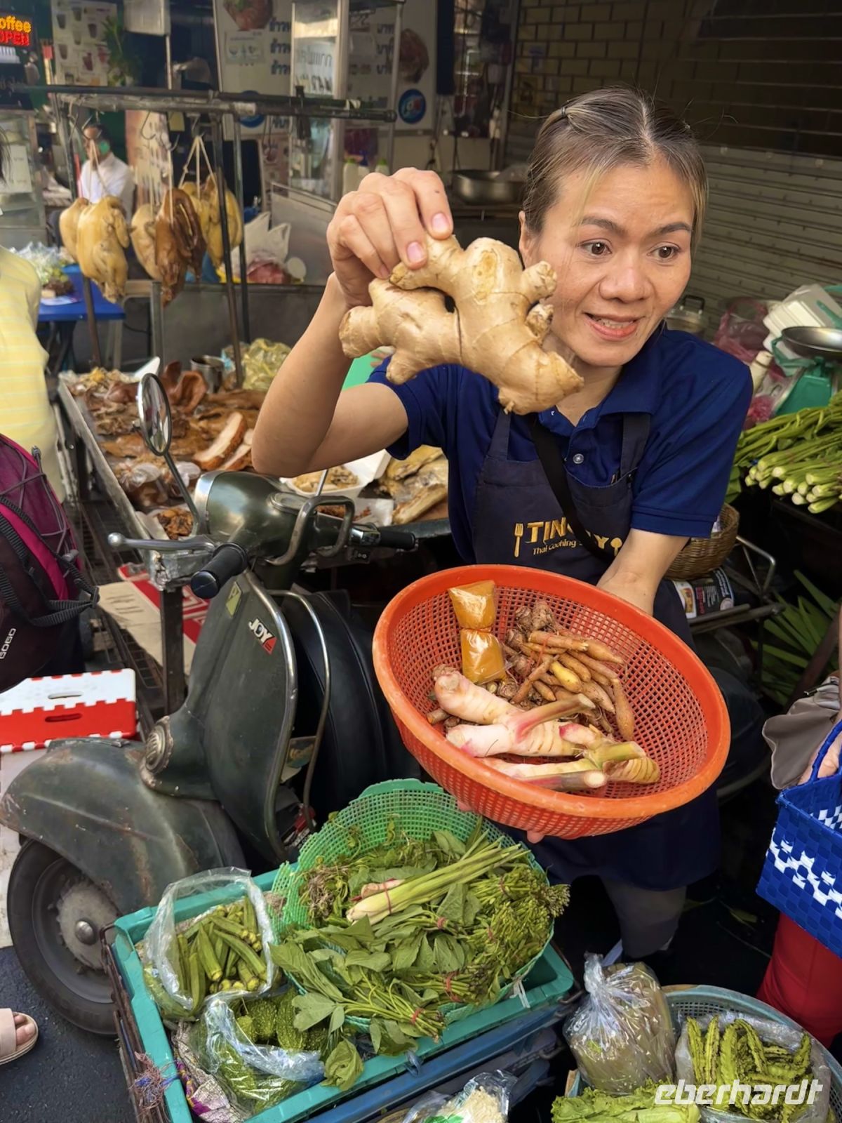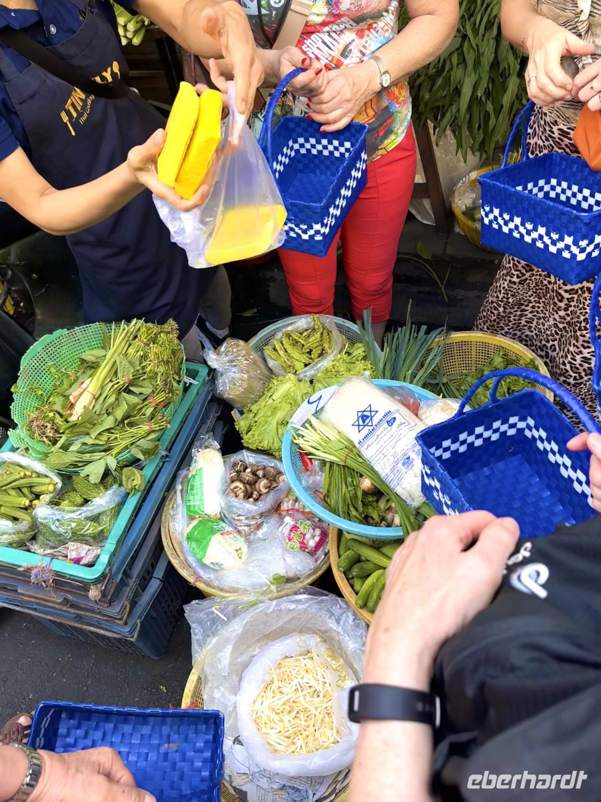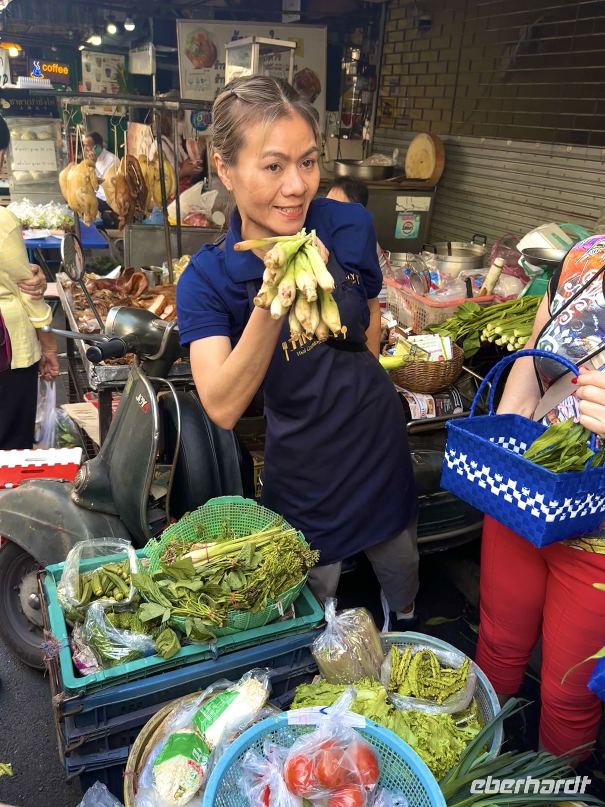 Anschließend fahren wir ins Viertel Suriyawong und treffen uns auf dem dortigen Markt mit der Köchin einer kleinen thailändischen Kochschule. Zusammen kaufen wir die Zutaten ein, die wir für unseren heutigen Kochkurs benötigen.