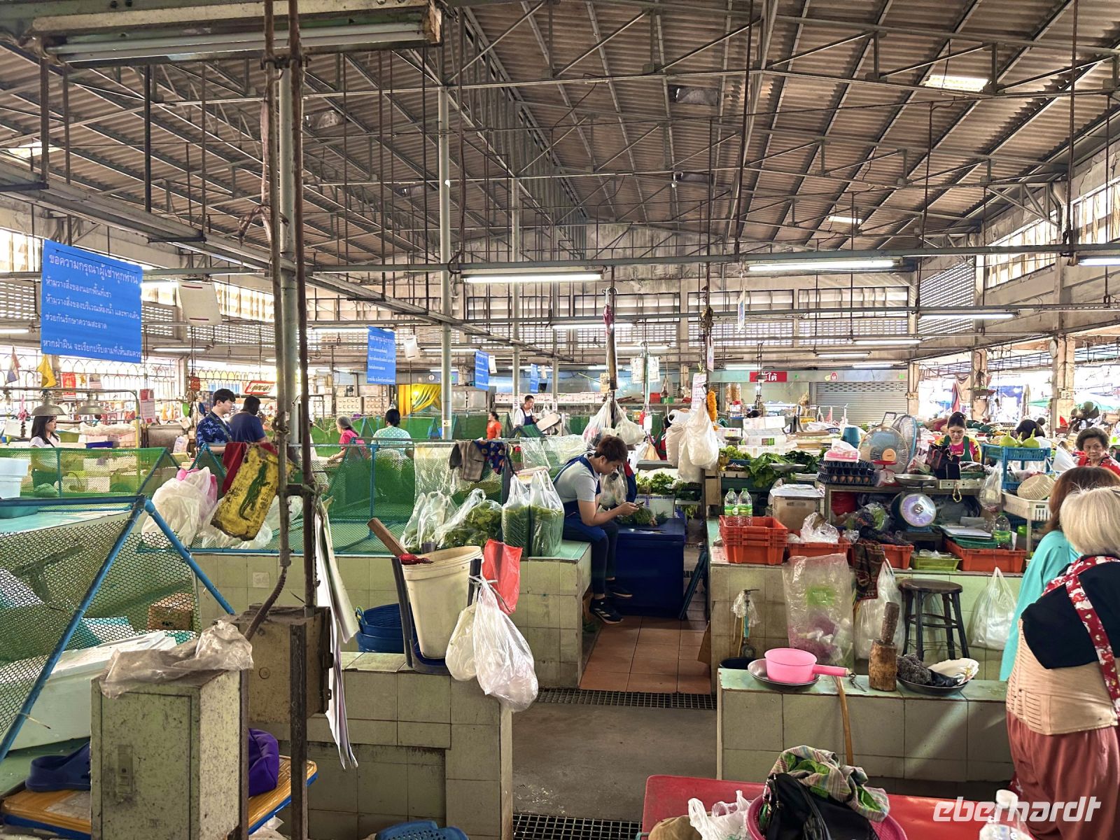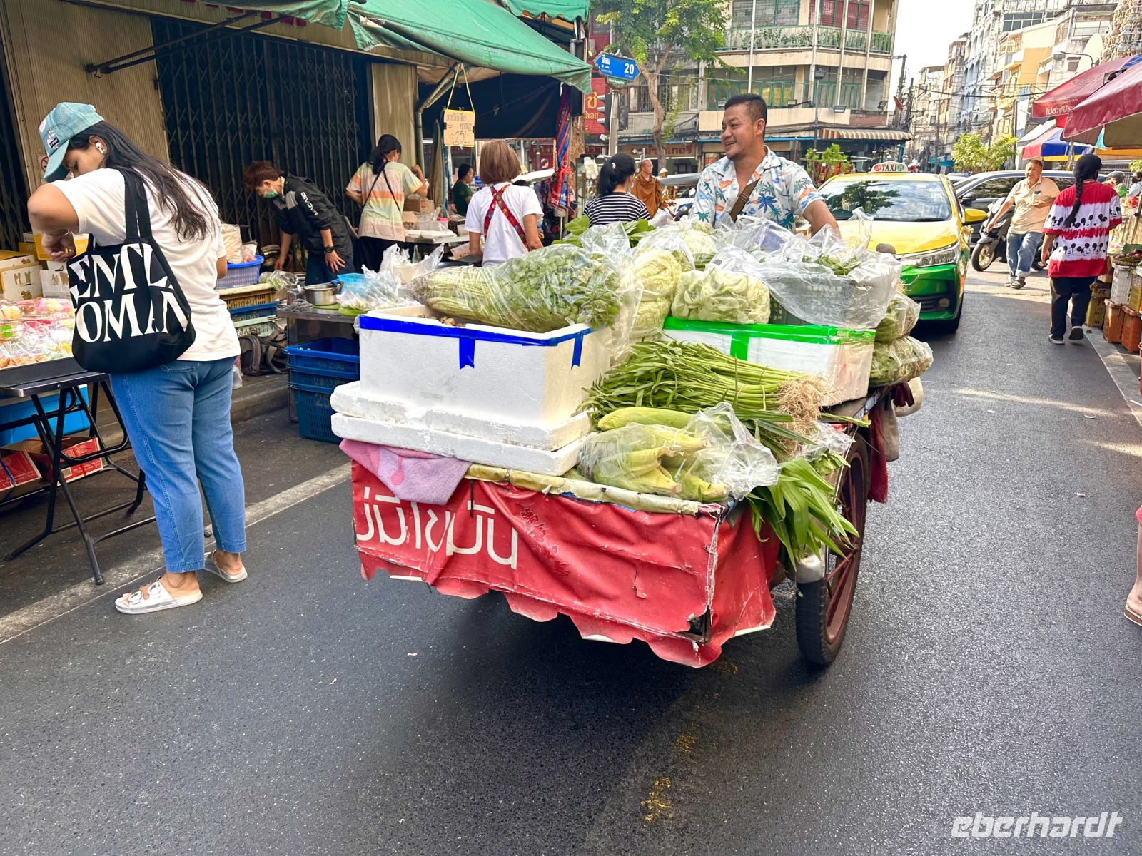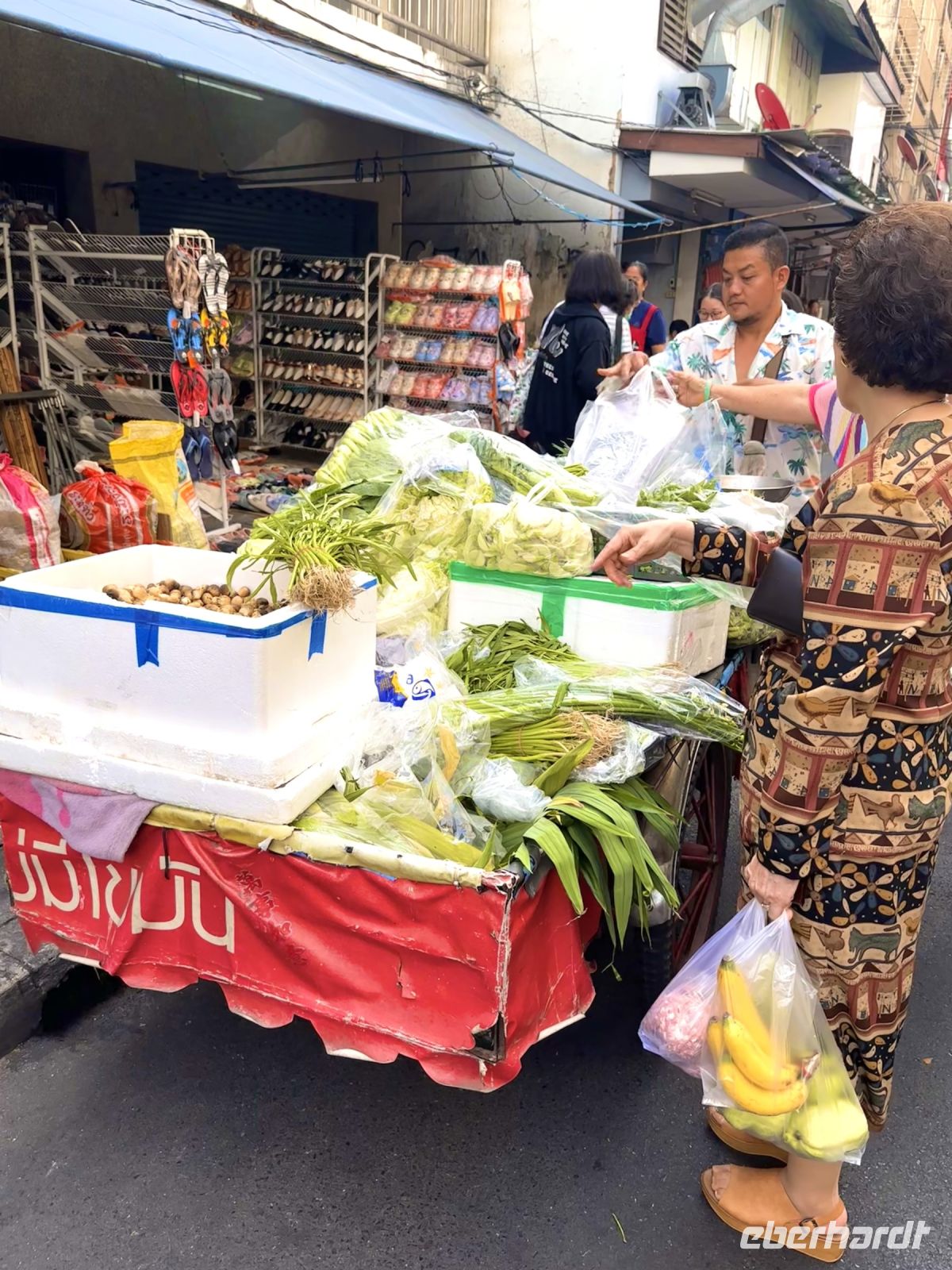 Anschließend fahren wir ins Viertel Suriyawong und treffen uns auf dem dortigen Markt mit der Köchin einer kleinen thailändischen Kochschule. Zusammen kaufen wir die Zutaten ein, die wir für unseren heutigen Kochkurs benötigen.