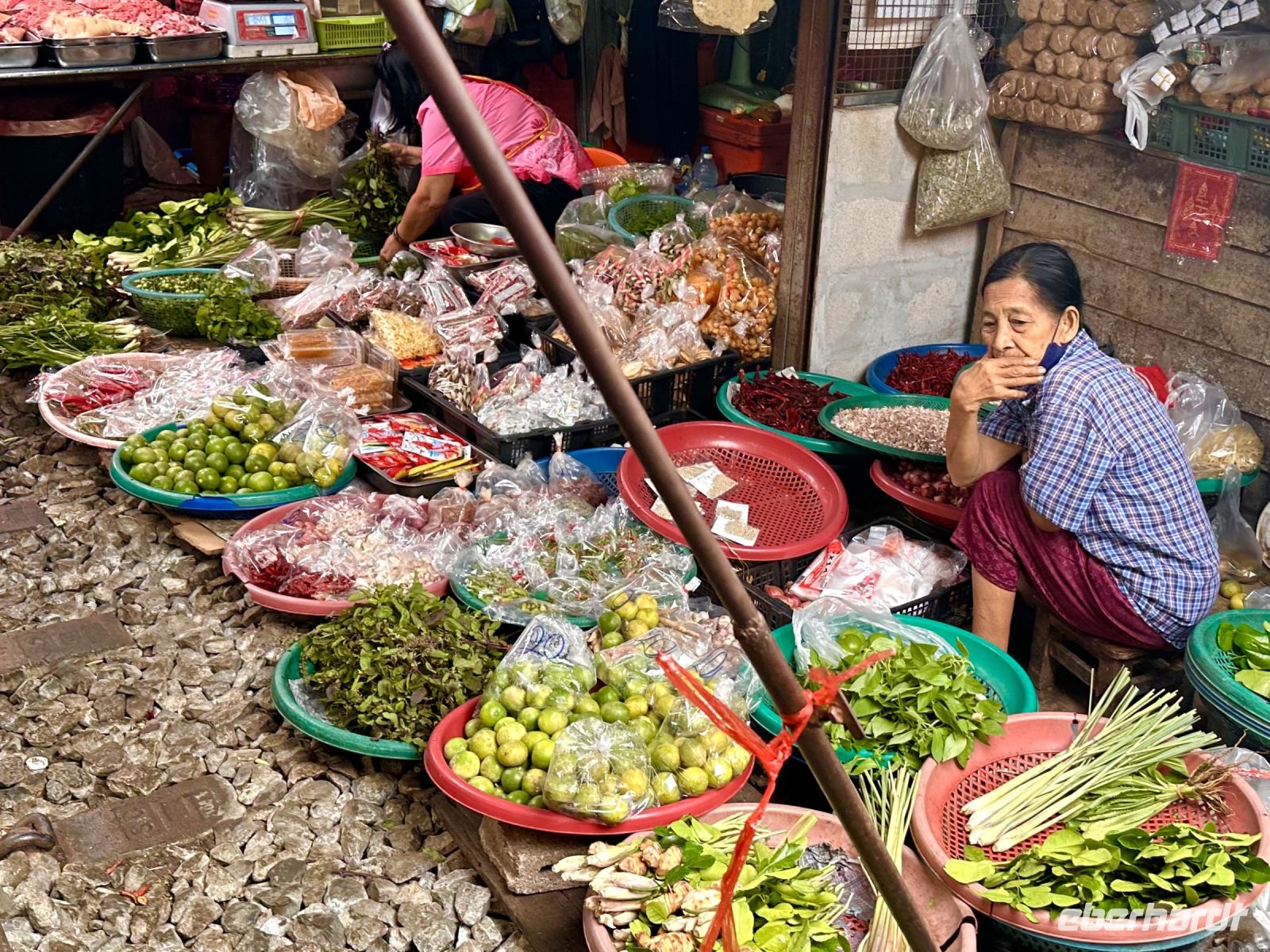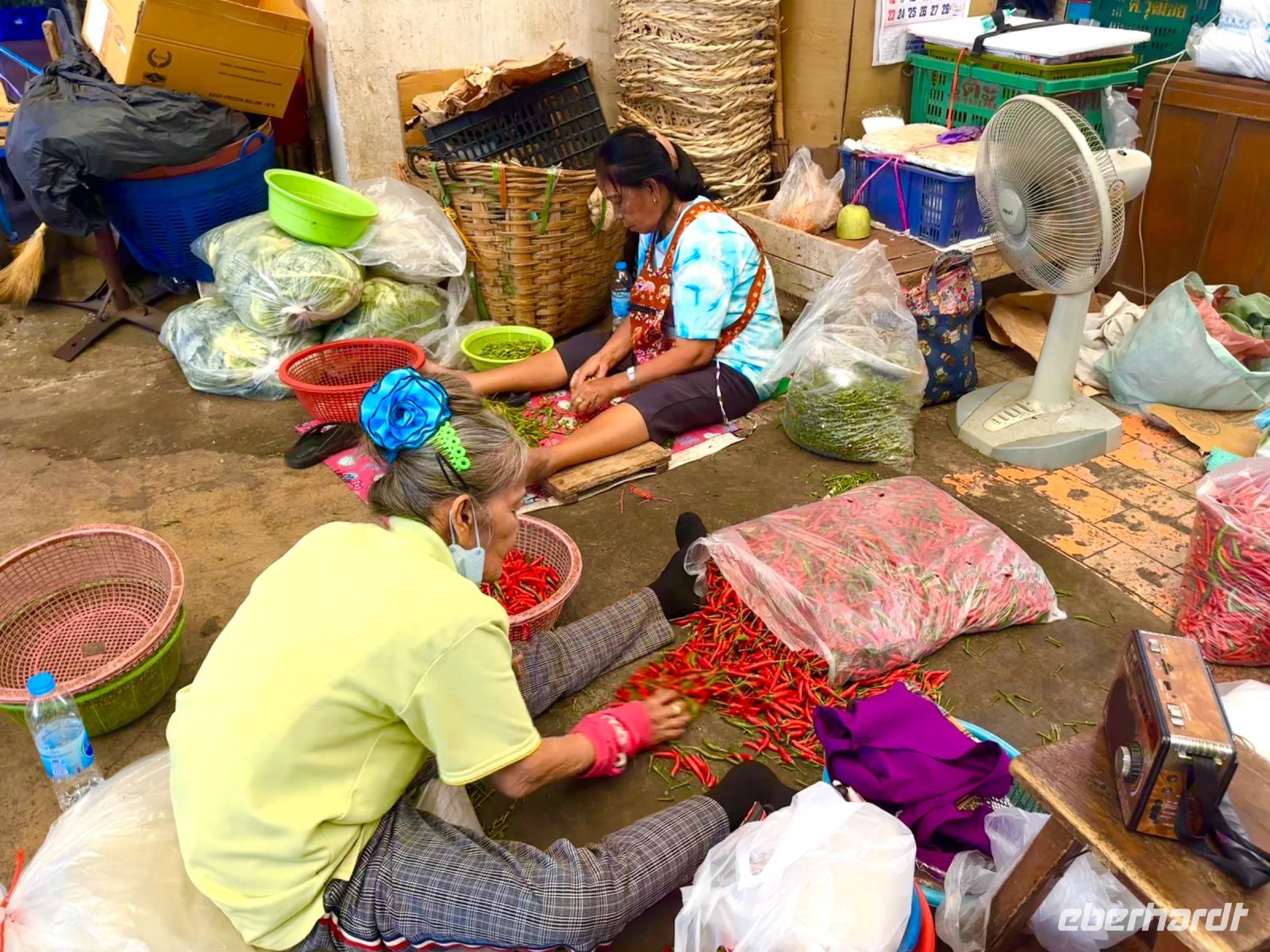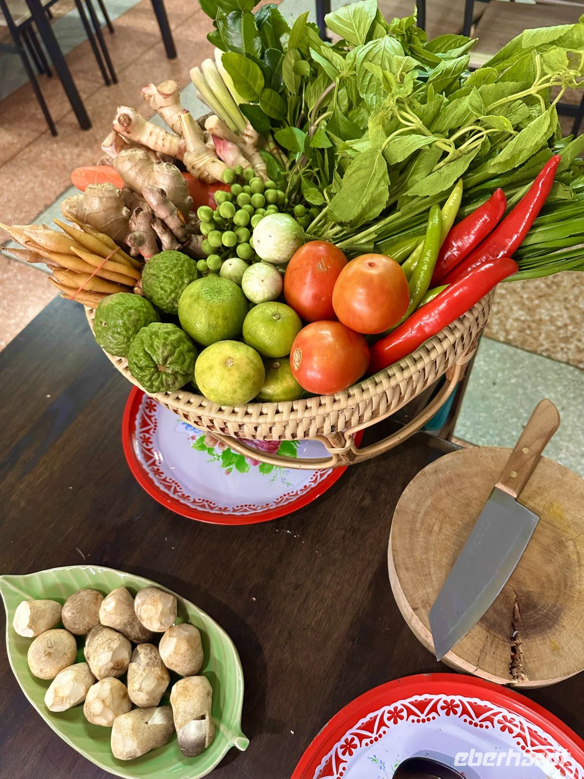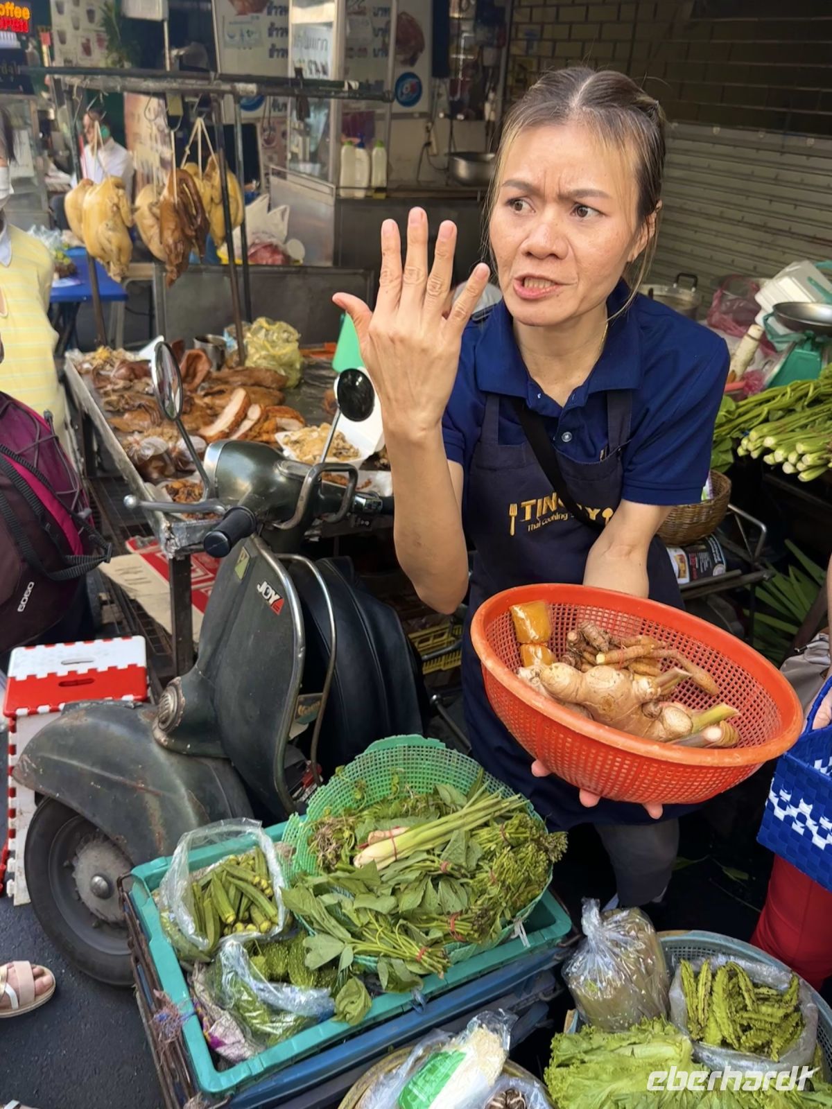 Anschließend fahren wir ins Viertel Suriyawong und treffen uns auf dem dortigen Markt mit der Köchin einer kleinen thailändischen Kochschule. Zusammen kaufen wir die Zutaten ein, die wir für unseren heutigen Kochkurs benötigen.
