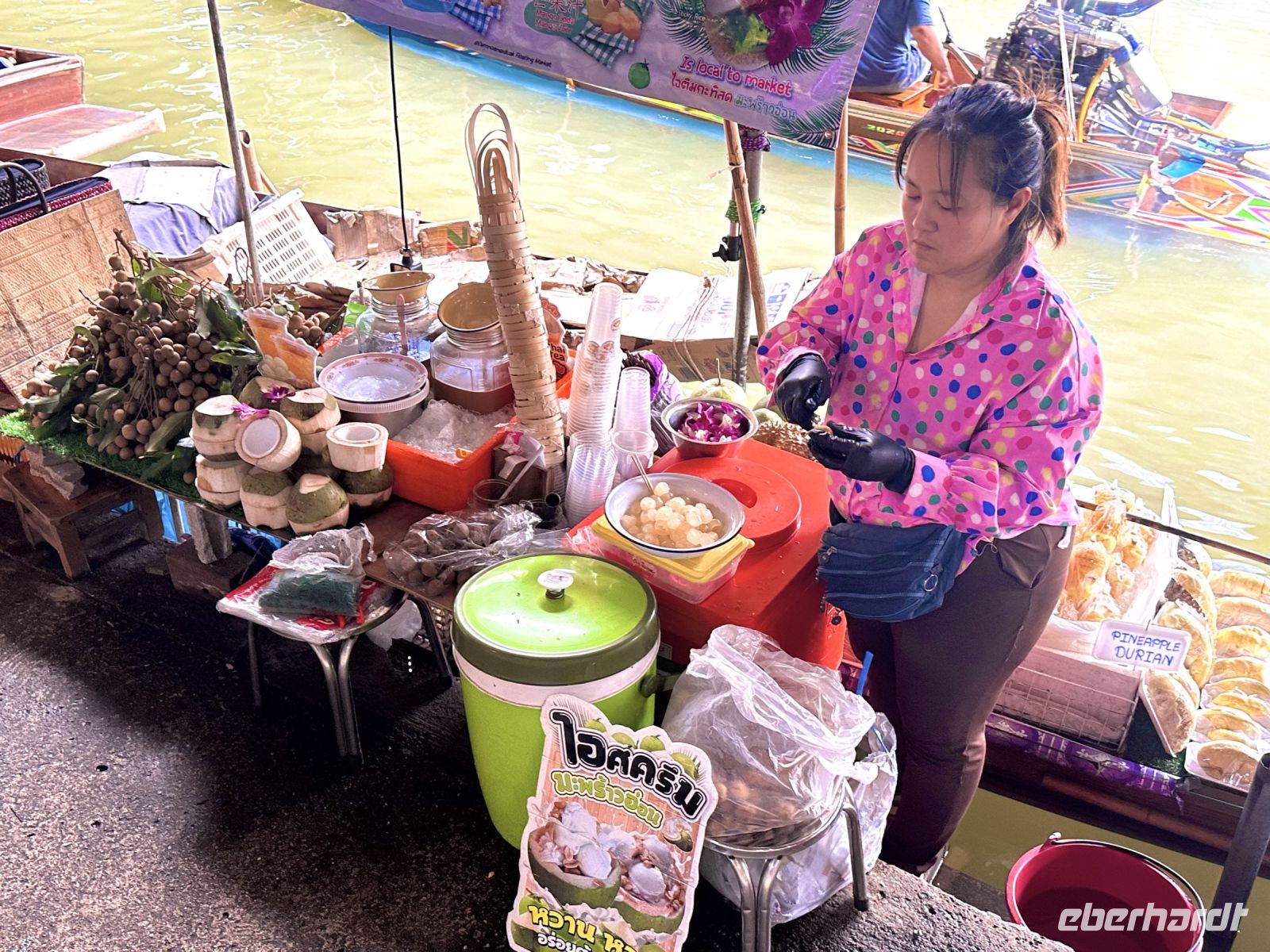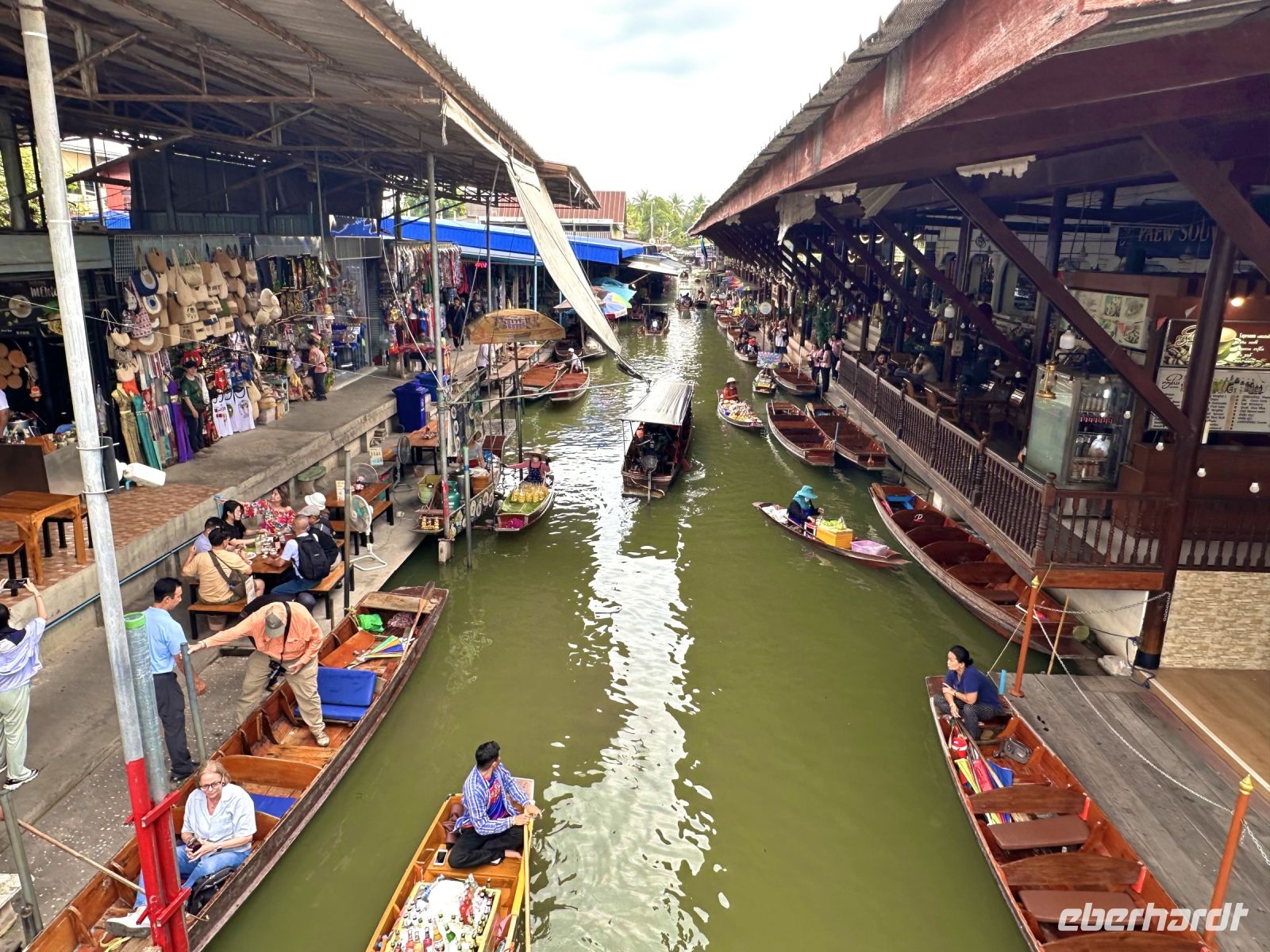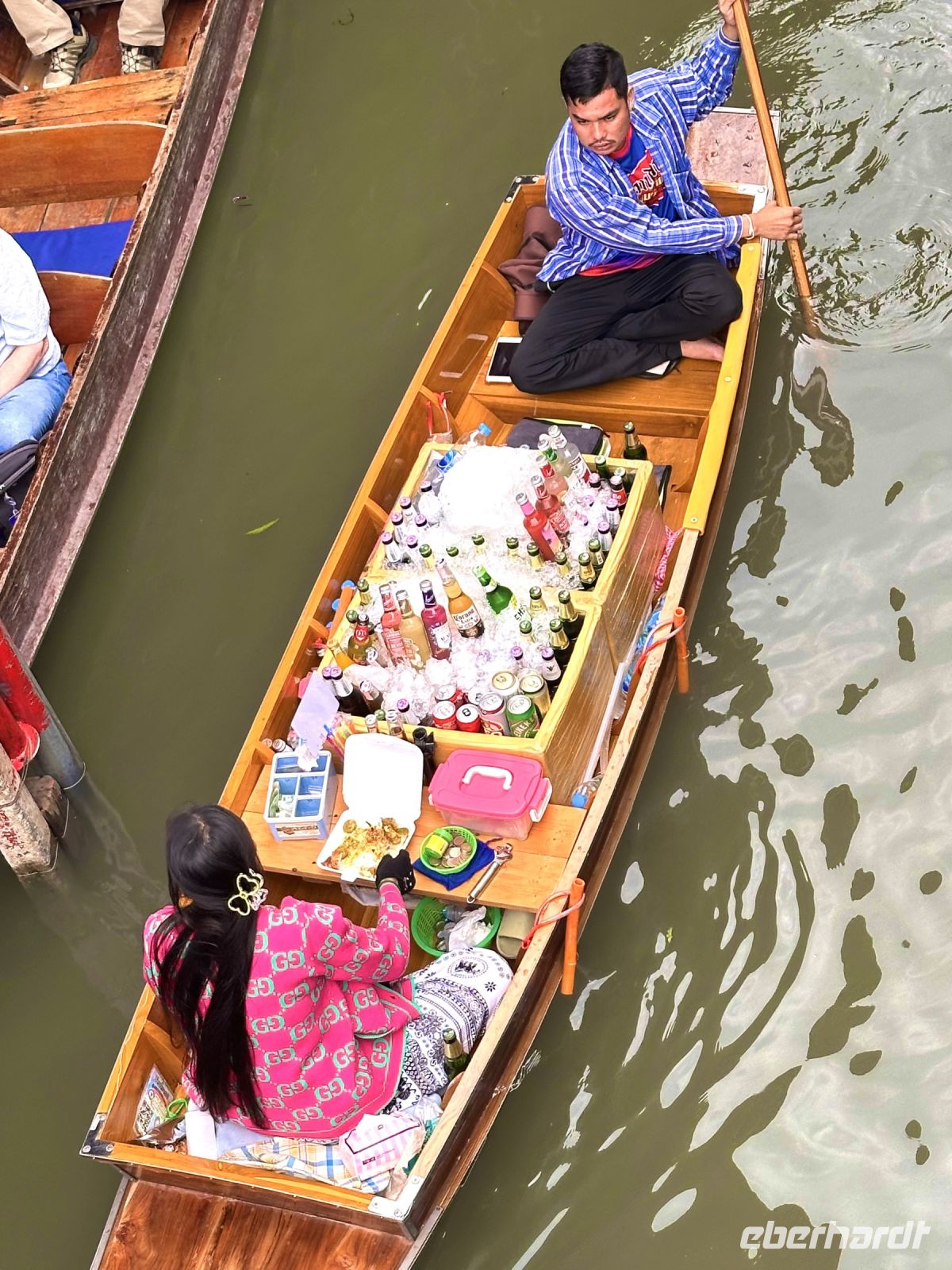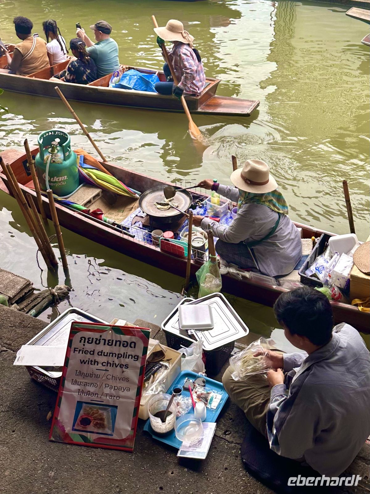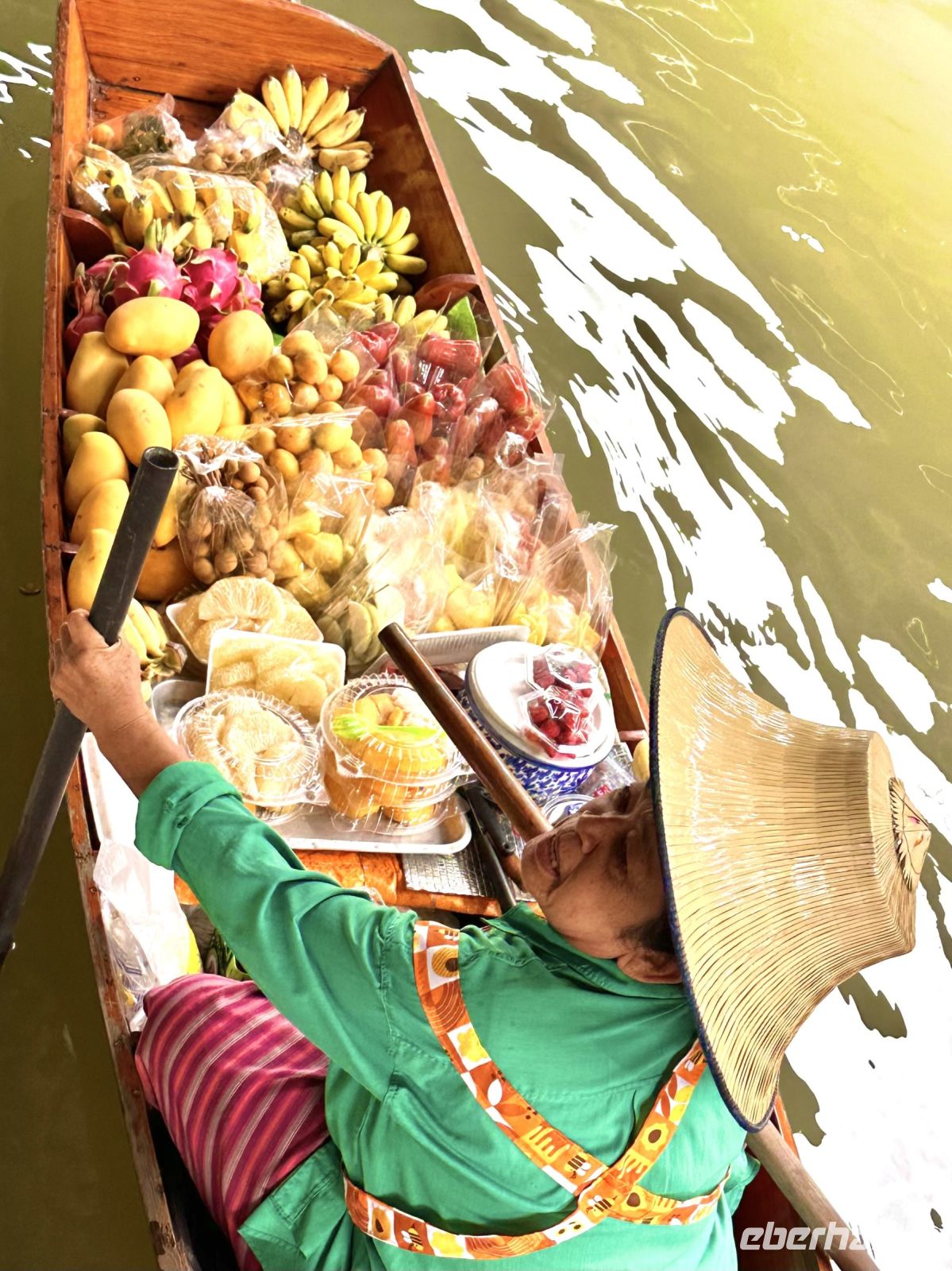 Anschließend fahren wir weiter zu einem Floating Market. Auf einem Longtailboot durchqueren wir den schwimmenden Markt auf dem Händler auf ihren Booten waren zum Kauf anbieten. Früher war dies gängige Praxis für die einheimischen, um sich mit Waren des täglichen Bedarfs zu versorgen.