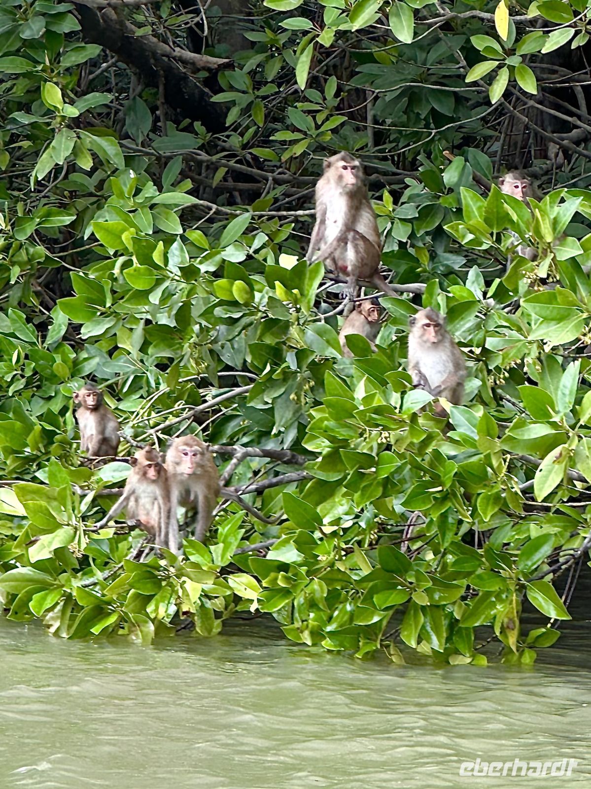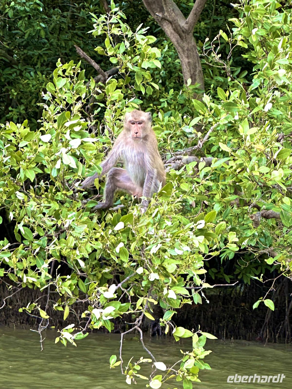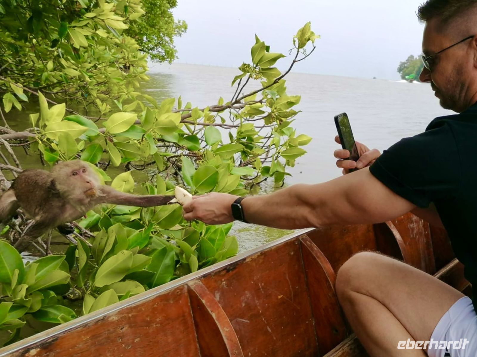 Unsere Fahrt führt uns nun weiter zum Mittagessen in einer sehr ruhig gelegenen Gaststätte am Fluss, bevor wir wieder in Longtailboote steigen und eingetrübt durch den Mangrovenwald machen der dann aufs offene Meer mündet. Die Besonderheit bei dieser Bootsfahrt sind die vielen Affen die in den Mangroven leben und sich mit frischem Obst auch von uns anfüttern lassen. Sie schwimmen bis zu unseren Booten und freuen sich über die Früchte. Ein wirklich sehr lustiges Schauspiel.